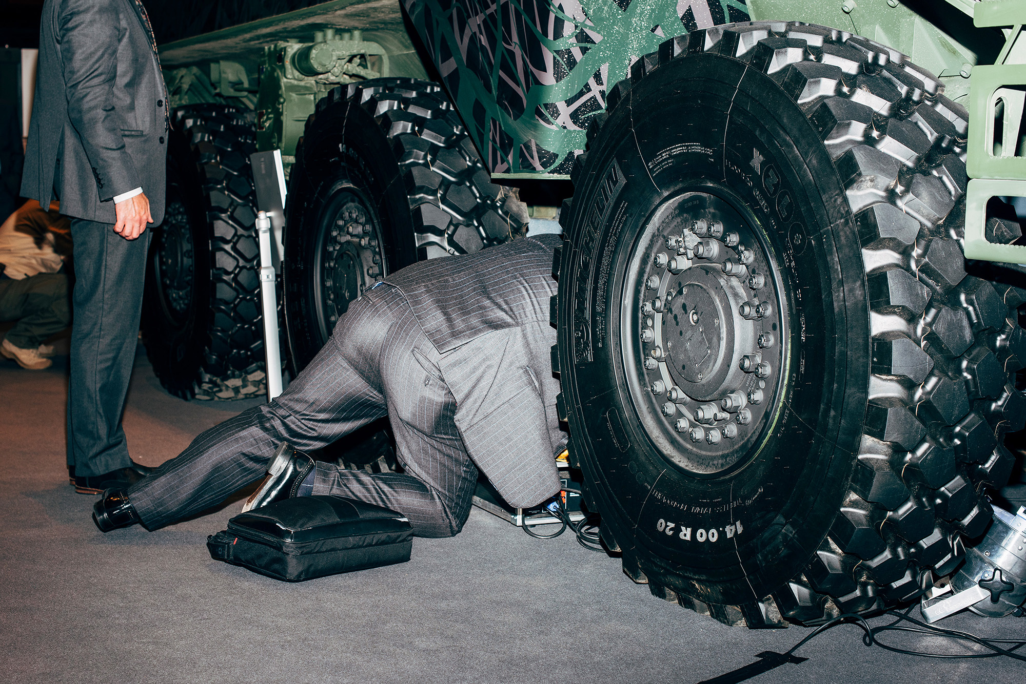 Adding to the strangeness of the book, Teryoshin chose not to take pictures of any faces while at the fairs, giving the pictures an obscured, shady energy. “I didn’t want to show the faces of the people, and [focus more] on the systems of the arms trade,” he explains. “For sure there are CEOs and politicians – usually in every country the head of state is opening the fair, for example Merkel or Macron, Putin was in Moscow.”