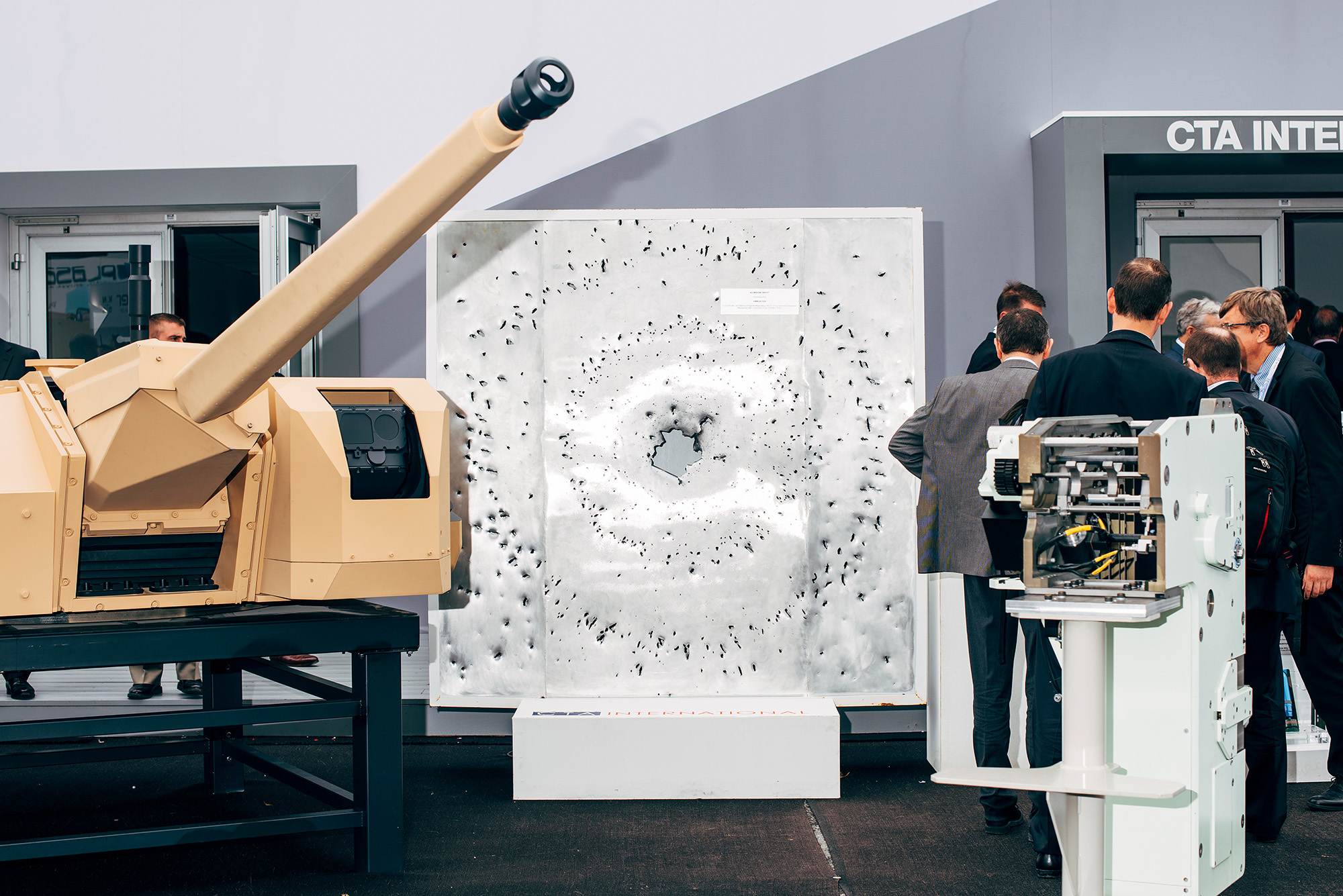 Alongside the photographs, Teryoshin printed punchy slogans that he saw or heard at the conferences used by the arms manufacturers and dealers. Phrases like “WE ARE ENGINEERING A BETTER TOMORROW” or “UNMATCHED LETHALITY AT ANY DISTANCE” give a disquieting, dystopian edge to the already unnerving shots. “I included the slogans of companies because I think it’s one of the best ways to describe what’s going on there – it’s kind of Orwell speech,” Teryoshin says. “One of the weirdest was from [Russian rifle manufacturer] Kalashnikov. I saw it with my own eyes in Moscow, it was an installation and a cube [made] out of glass and inside was a three-dimensional AK-47, and also in 3D was the slogan ’70 years defending peace’.”