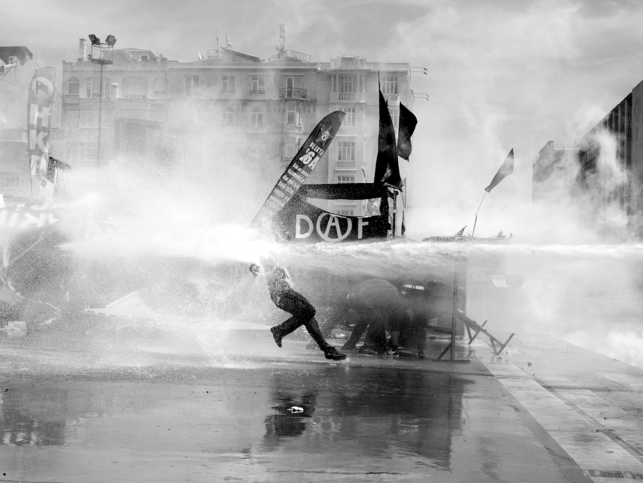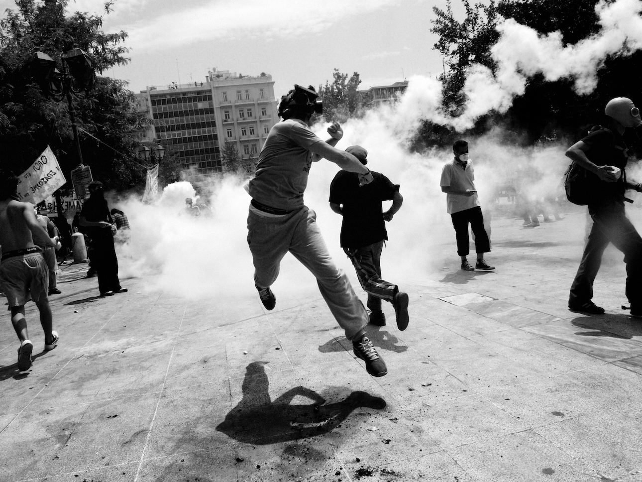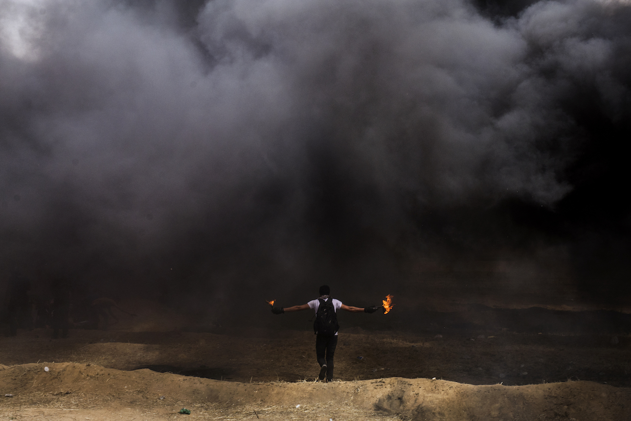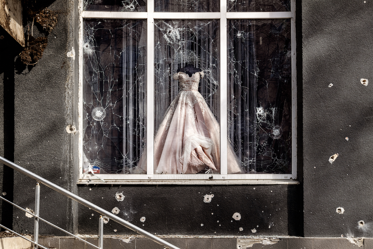Pictures are featured from Egypt during the 2011 Arab Spring, anti-austerity protests in Greece the same year, the 2018 March of Return in Gaza, the Donbas region of Ukraine after the Russian invasion in 2022 and beyond. From a man pulling a peace sign with his fingers while surrounded by smoke and rubble in Cairo to a wedding dress on a mannequin behind a window shattered by gunshots – the horror, brutality and bravery of war is on show in each shot.