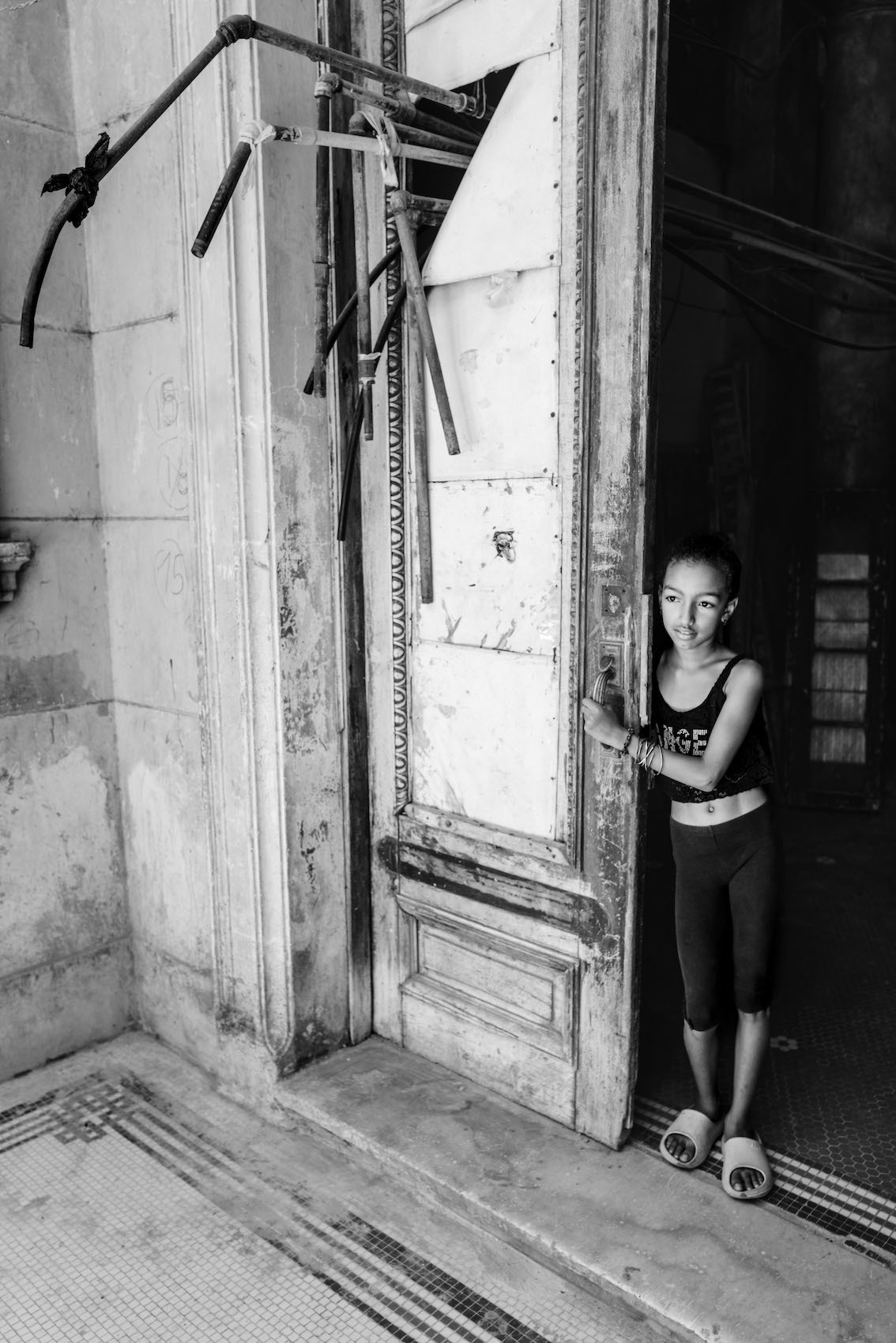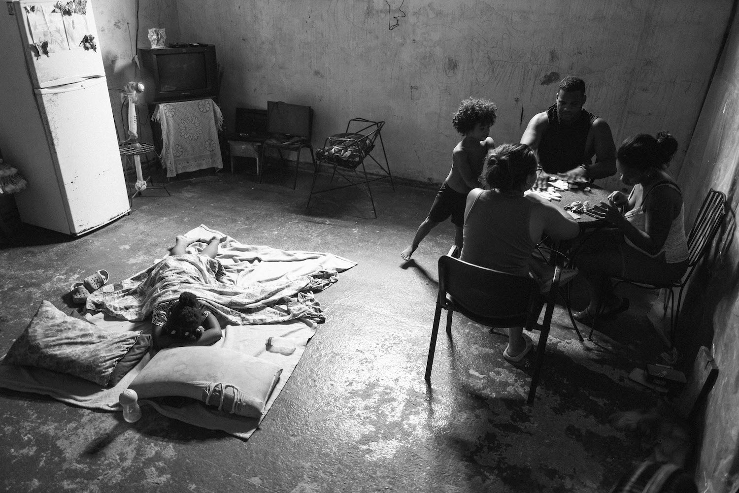 I delved deeper into the albergues along improvised corridors and stairways to the living quarters of numerous families. There was a young woman cleaning outside the ground floor living areas and she beckoned me over. Through one of the doorways, I found Ariannis sitting on a bed, plaiting her youngest daughter’s hair while the older daughter slept beside them.