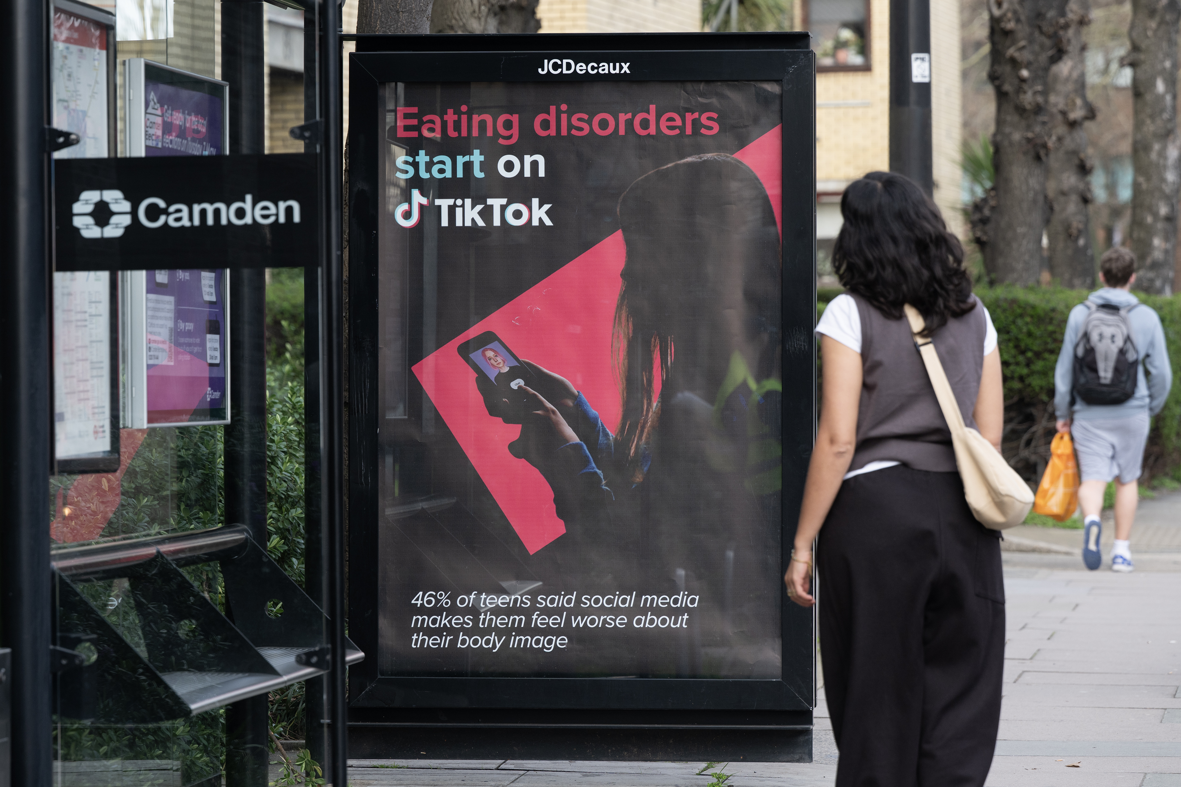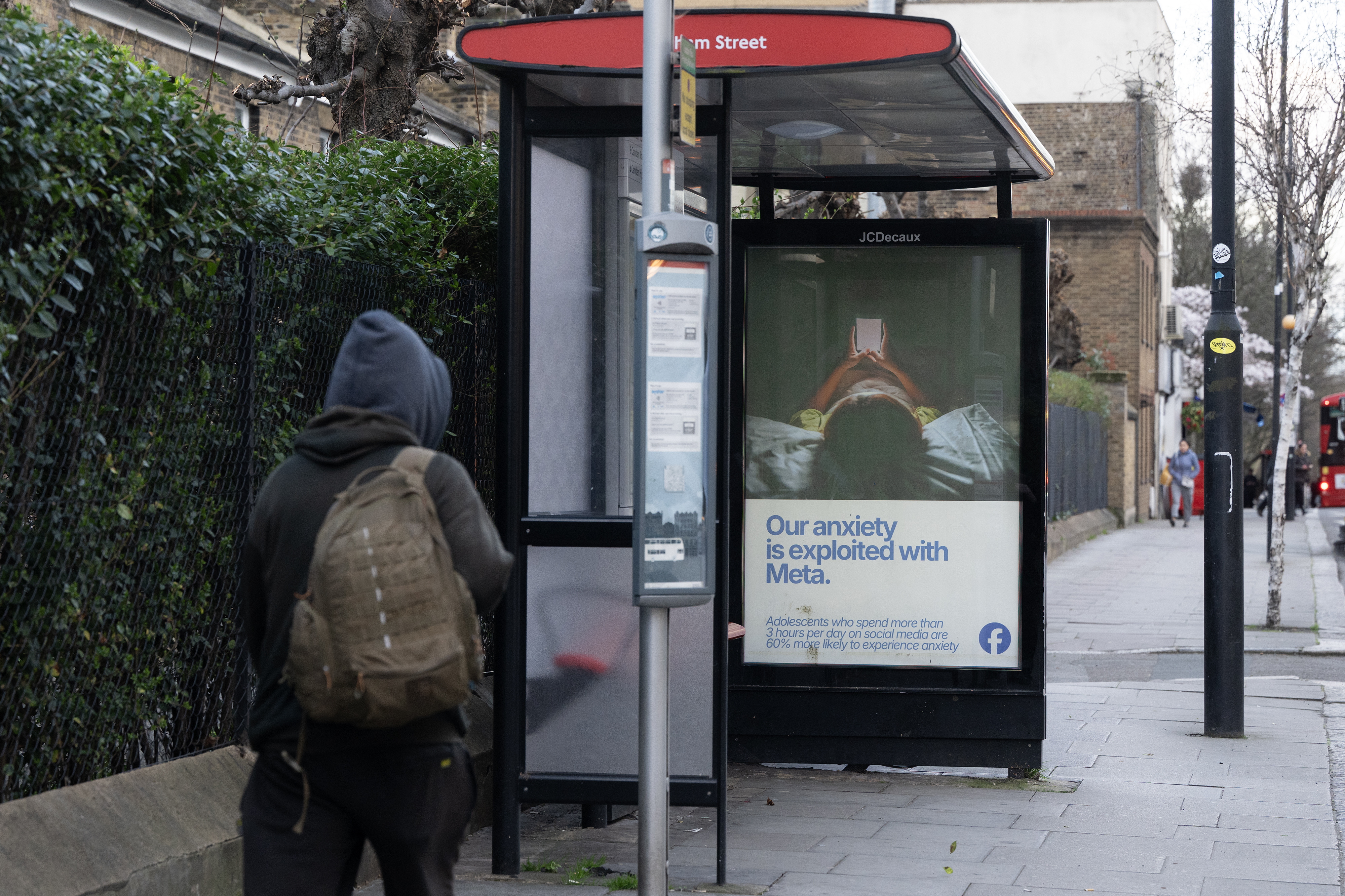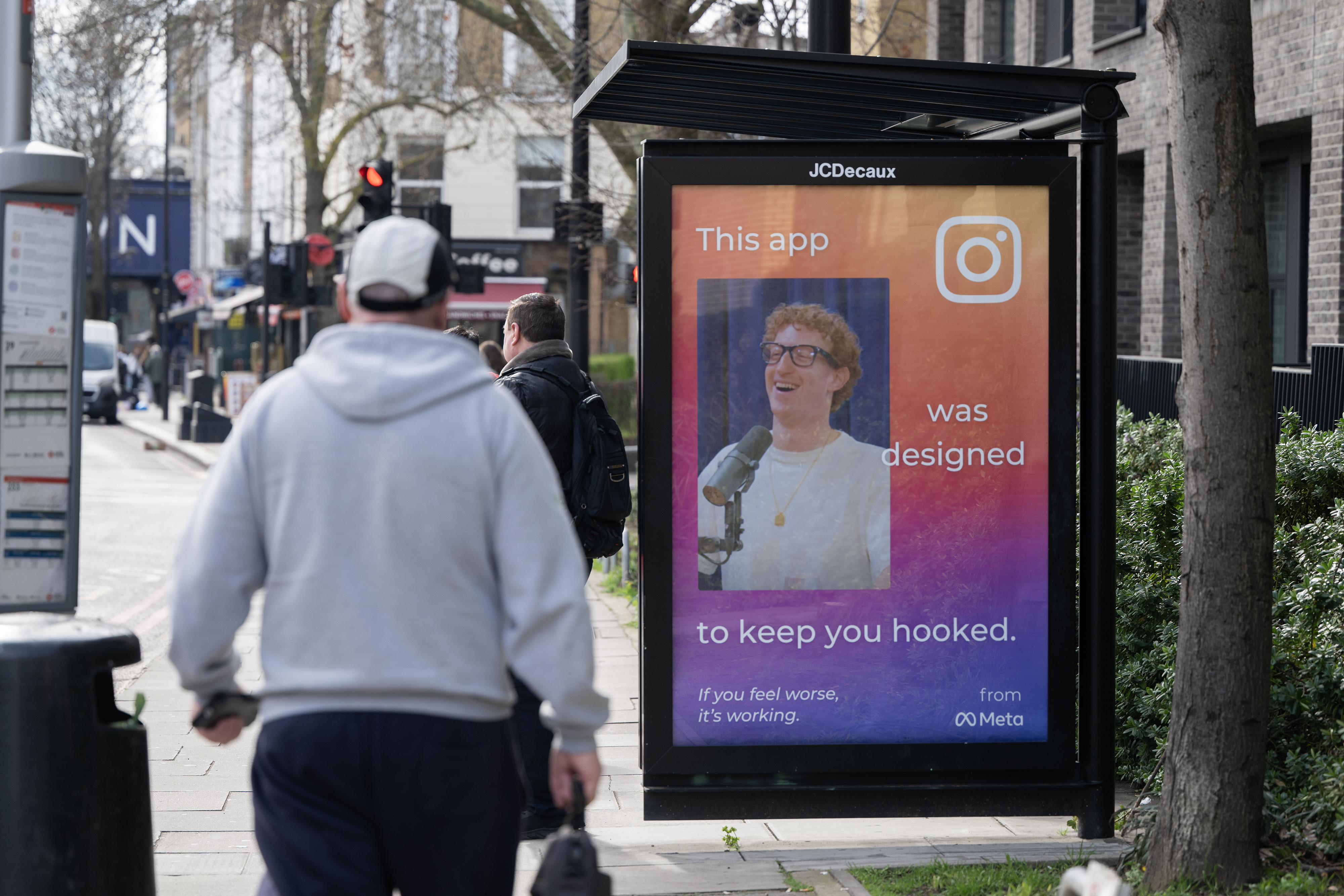 The ads suggest that the business models of major platforms such as Meta and the app TikTok are part of the problem: “This app was designed to keep you hooked,” one billboard reads alongside a photo of Mark Zuckerberg. “If you feel worse, it’s working”.