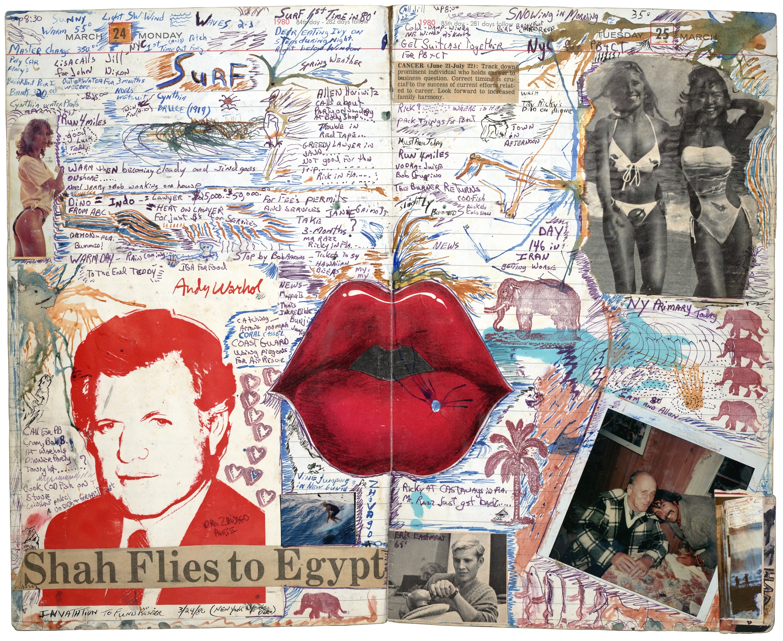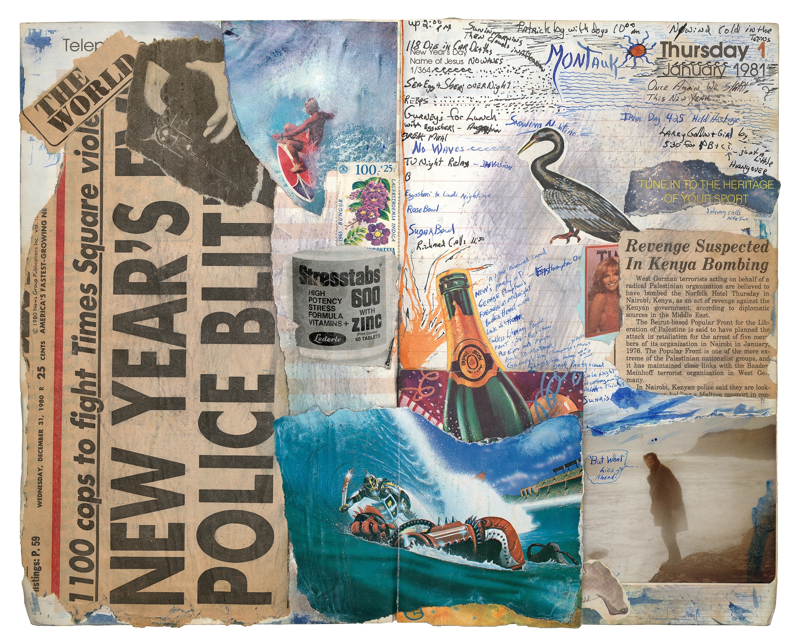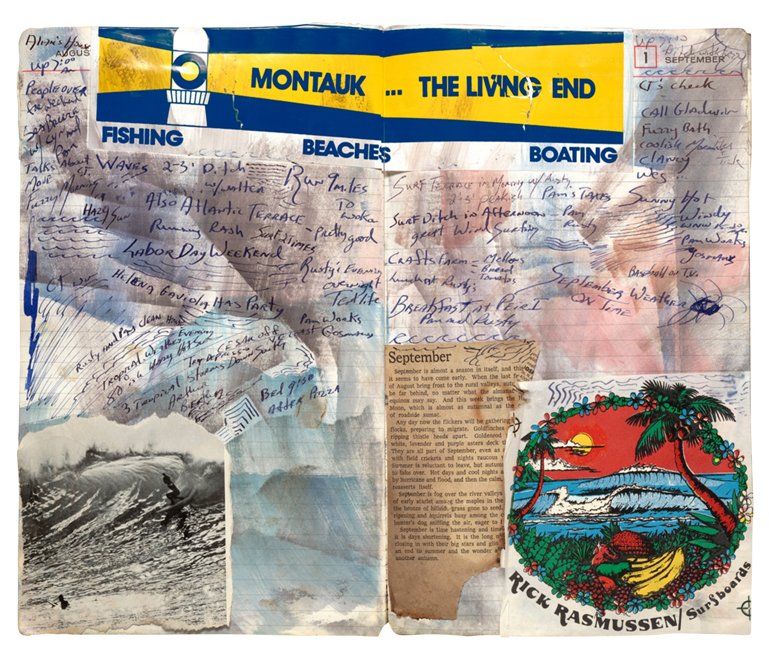 Now, his new book Montauk Surf Journals, collects and presents several of his most detailed entries from the past half century. Records are scrawled of his days “building boards”, “overcast skies” and having “dinner with Rustie”, while interspersed with collages, sketches and headline cuttings from the news stories of the day (“Get moving by noon Bush tells Saddam”). The entries form a lucid vision of the times through the lens of surf culture, and Caramanico’s travels across the globe.