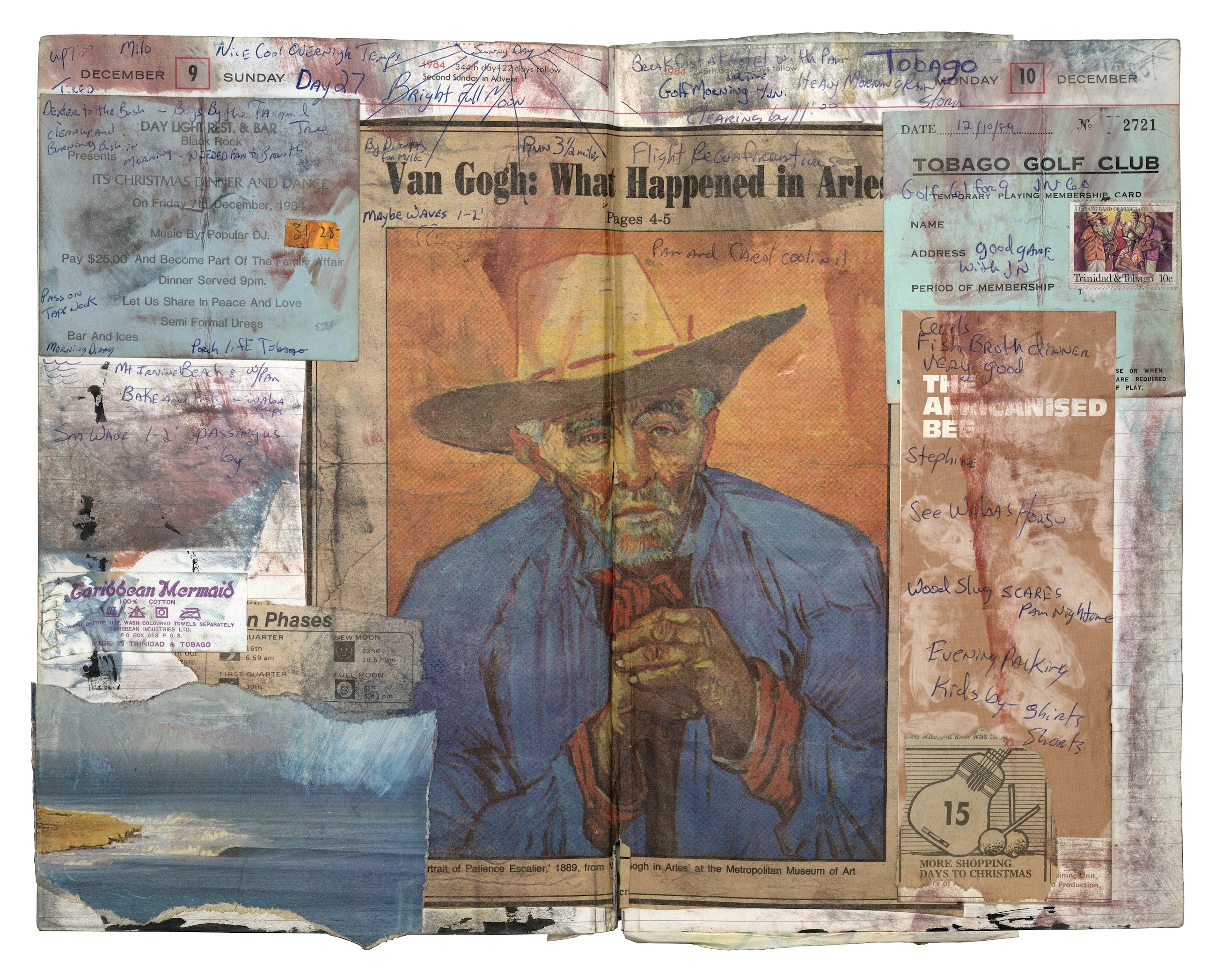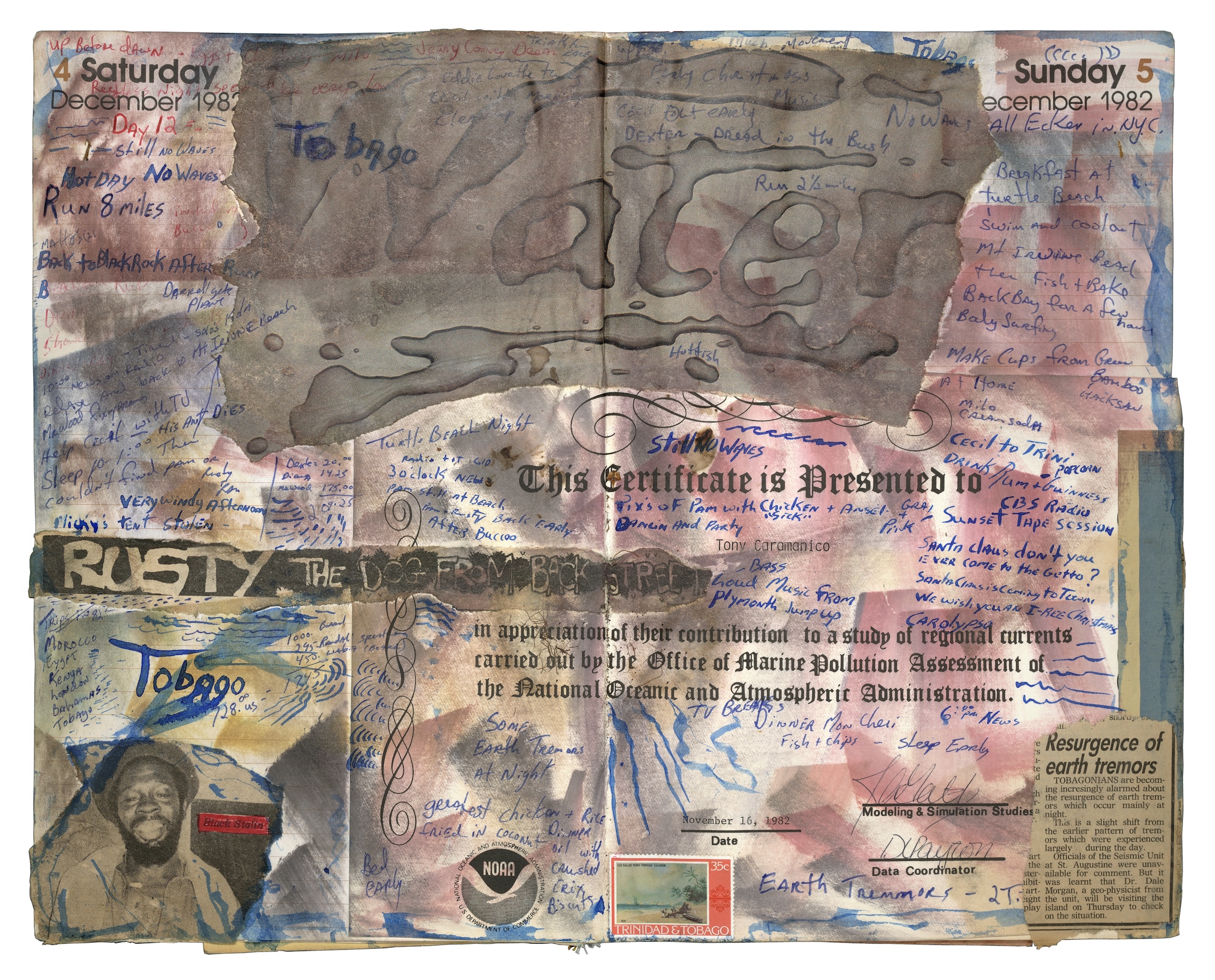 Legendary East Coast surfer Tony Caramanico first started scribbling the height of the waves he caught, wind speeds, and other musings into a diary 45 years ago. Since then he has journaled every single day. That’s over 16,000 separate entries since 1979. As the years went by, Caramanico began adding more and more to the pages of his books – cuttings from magazines and newspapers, sketches, loose thoughts. Those journal entries bloomed into intricate, brightly coloured works of art.