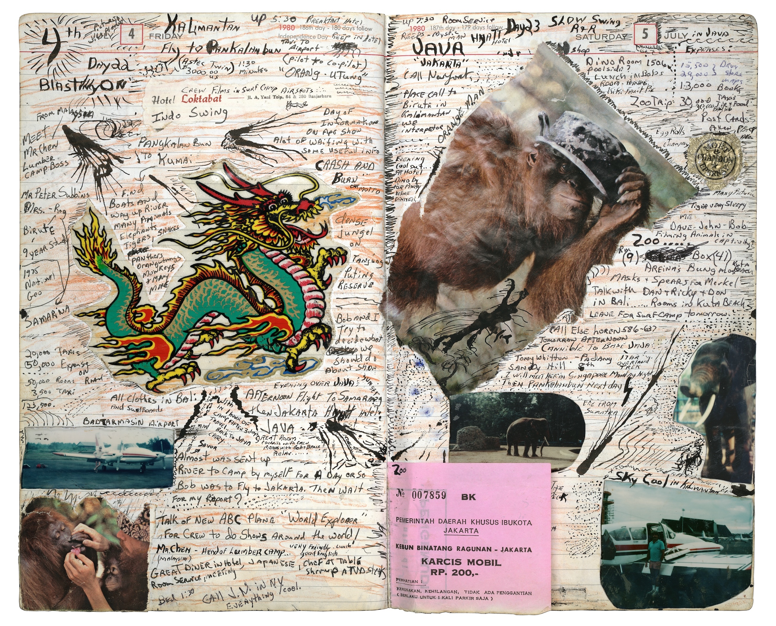 Beard showed Caramanico an artistic technique called “rubbing”, where they would use a now banned industrial cleaning fluid to transfer images and cuttings from newspapers and magazines and transfer them onto journal pages. “In late ’78, I moved in with Peter and started keeping a larger journal – big format with a lot of art in it, documenting my travels and my lifestyle,” he explains. “That all came from Peter. We worked on journals together for many years – we would prep up the pages with these rubbings using fluids that were very dangerous, and we would do this for like 12 hours in a row, all nighters and hang out and smoke and drink and do a couple of little substances. It was wild.”