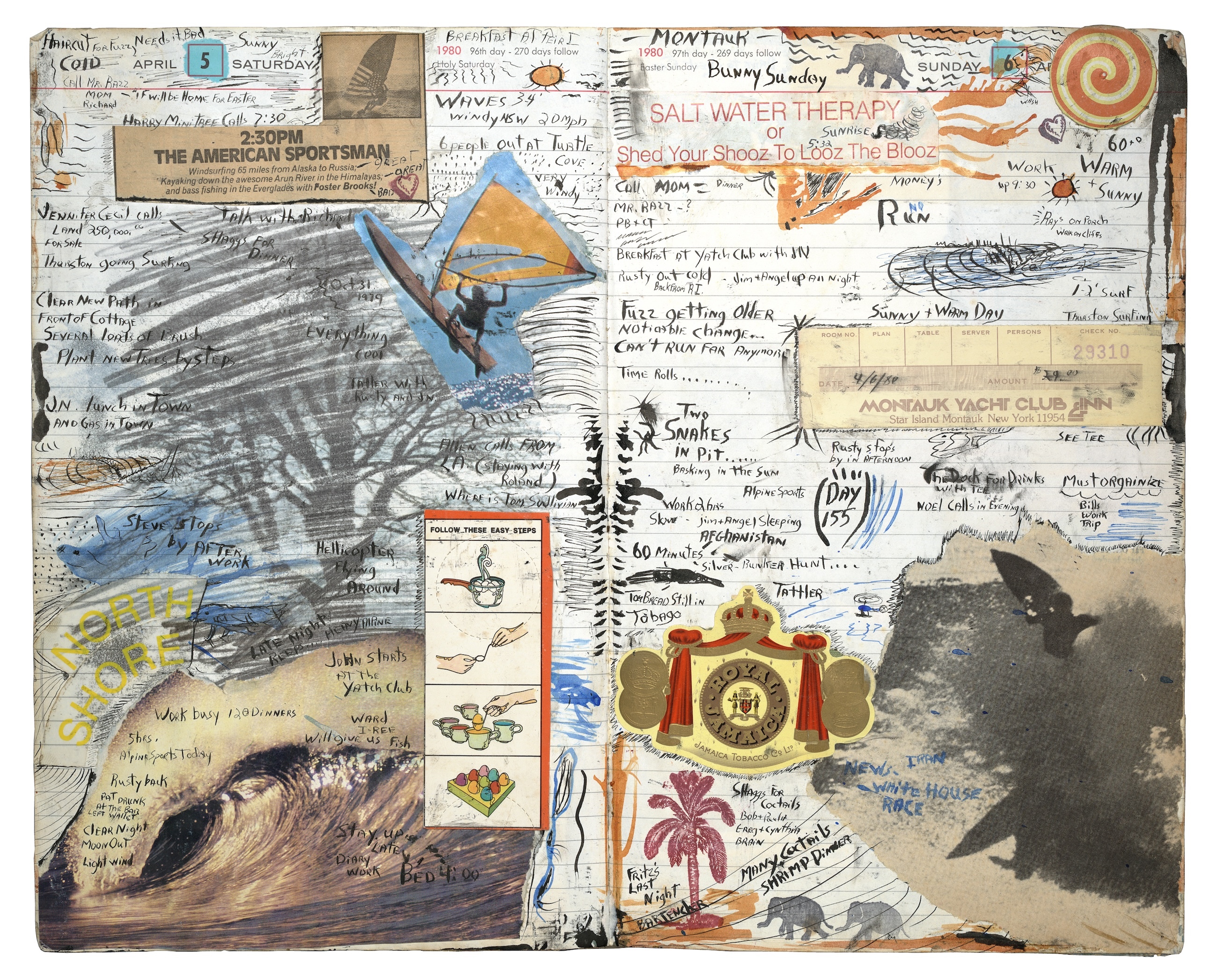 He went on to enter competitions a few years later, picking up sponsorships from surf companies and stores. It was when he moved further up the East Coast to Montauk, then a sleepy fishing and surf town, that the journaling began to take on a life of its own. After a surf shop and restaurant that he ran with two friends for seven years closed, a chance encounter with famed artist and photographer Peter Beard saw him invite the then 27-year-old surfer to live in one of his guesthouses.