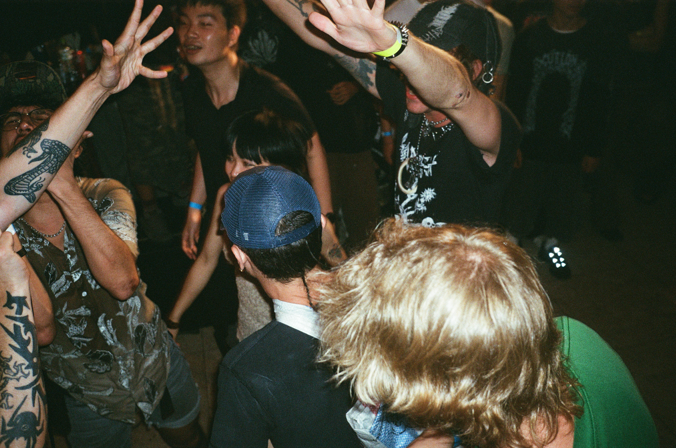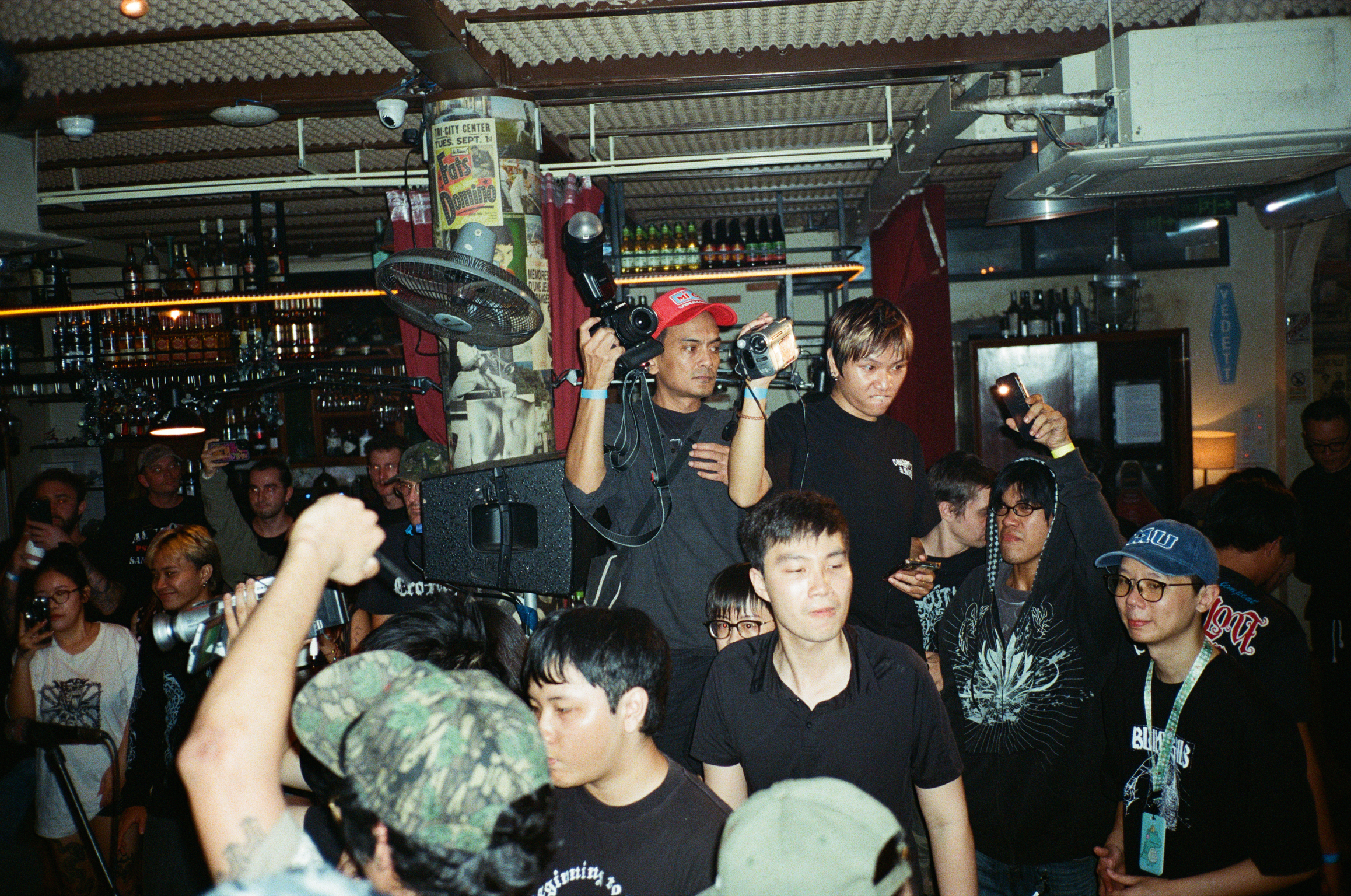 Before them, BIB – a band from Omaha, Nebraska who touring across Southeast Asia, introduce themselves to the anticipatory audience. Vocalist Nathan Ma channels raw, unselfconscious energy. The audience, many wearing the band’s merchandise, respond with eagerness. It’s a cross-cultural exchange that for a moment feels like a singular, shared hardcore culture. At one point during their set, I watched a boy gulp beer from a can, purse his lips and then spray fine mist, forcing the beer to split and atomise, all white and airy, in an upward arc that gently washed over us all. Breath and liquid escaping together.