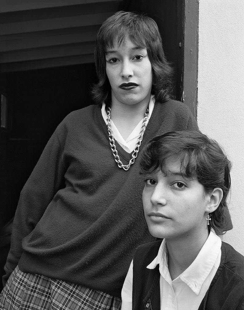 From slicked-back mullets to dark eyeshadow and lipstick, the black-and-white portraits – taken mostly in schoolyards and playgrounds – form a survey of youth fashion of the moment, while packed with Reagan-era angst. One portrait sees a girl sporting a thick chain while wearing black lipstick, standing next to her sister, who sports a church cross dangly earring, a particularly memorable photograph for Modica.