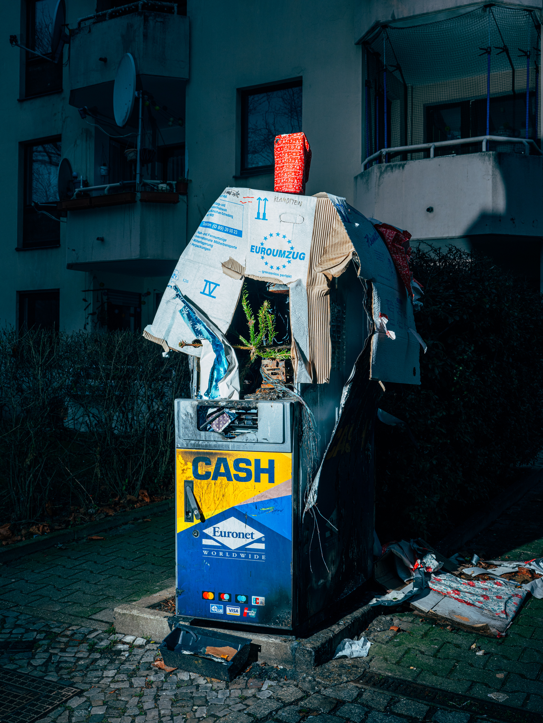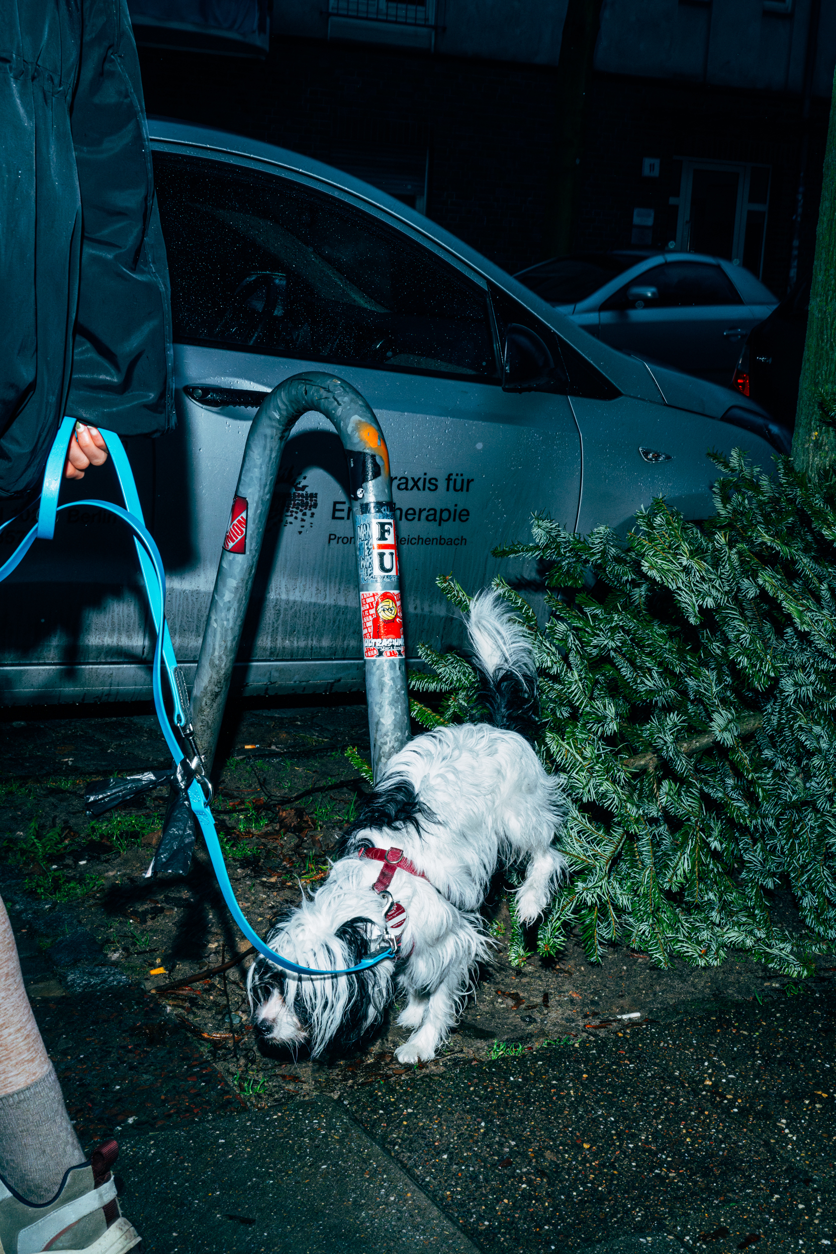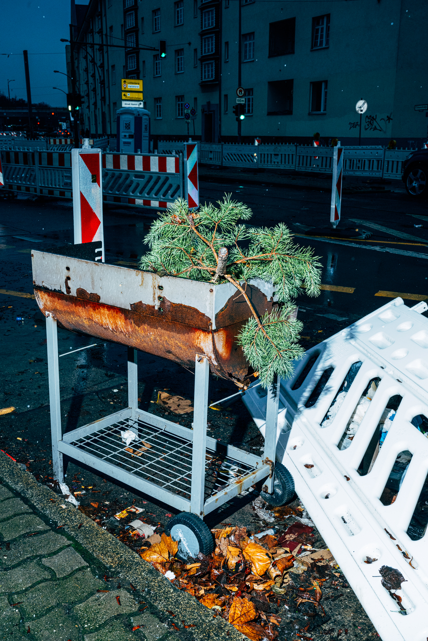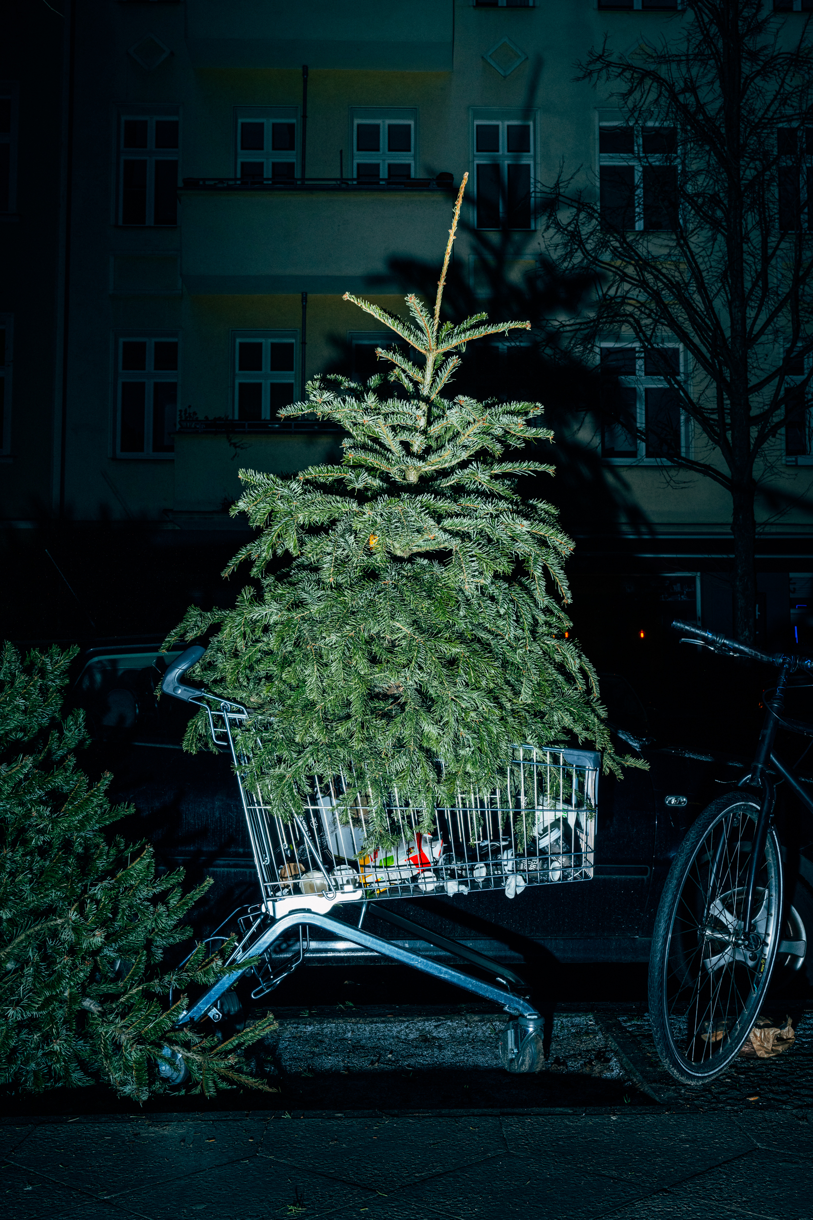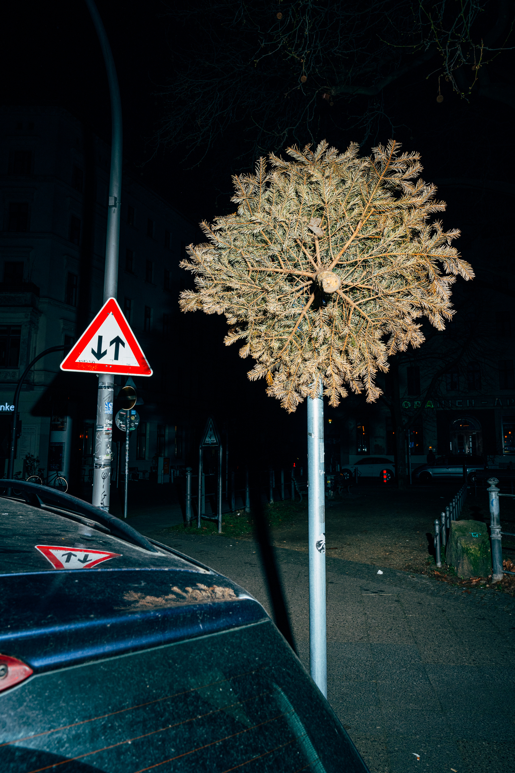 Simply walking around Berlin over the course of two Januarys, he soon found Christmas trees in all kinds of strange places, from inside an ATM cash machine to perched on top of road signs, and even in a lion’s pen in a zoo. Photographs that he took of them are now captured in his new photobook O Tannenbaum – Pine Trees of Late Capitalism, which forms an eyebrow-raising, odd view of the festive period’s chapter-closing act: the disposal of a Christmas tree from a home.