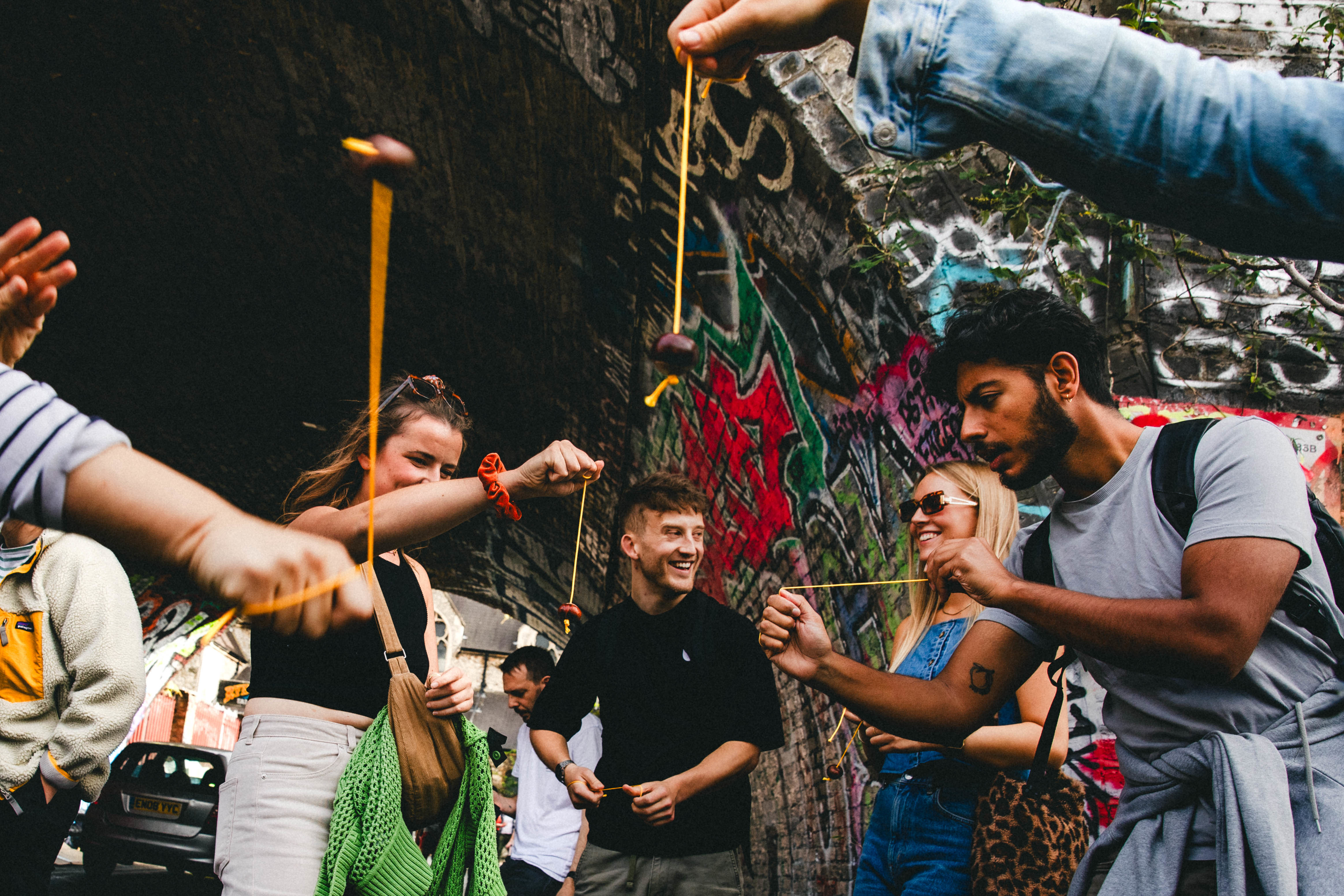 Like Ronaldo emerging from Old Trafford’s tunnel, a frisson travels through the arches as last year’s 29-year-old conker champion — Harry Hard Nut — arrives at the tournament to defend his title. Harry didn’t mean to become a conker champion. He’d just been collecting the nuts mindlessly in the park after moving to South East London, with no real agenda. Eventually, he and his brother Googled the rules of the game and stumbled across Chris’ tournament, which fortuitously was happening the very next day. Once in Peckham’s arches, he felt adrenaline take over his body and walked away the winner: “I was supposed to go down and just play a few games,” he says of the spontaneity. “Then I wound up on the biggest stage of my life.”