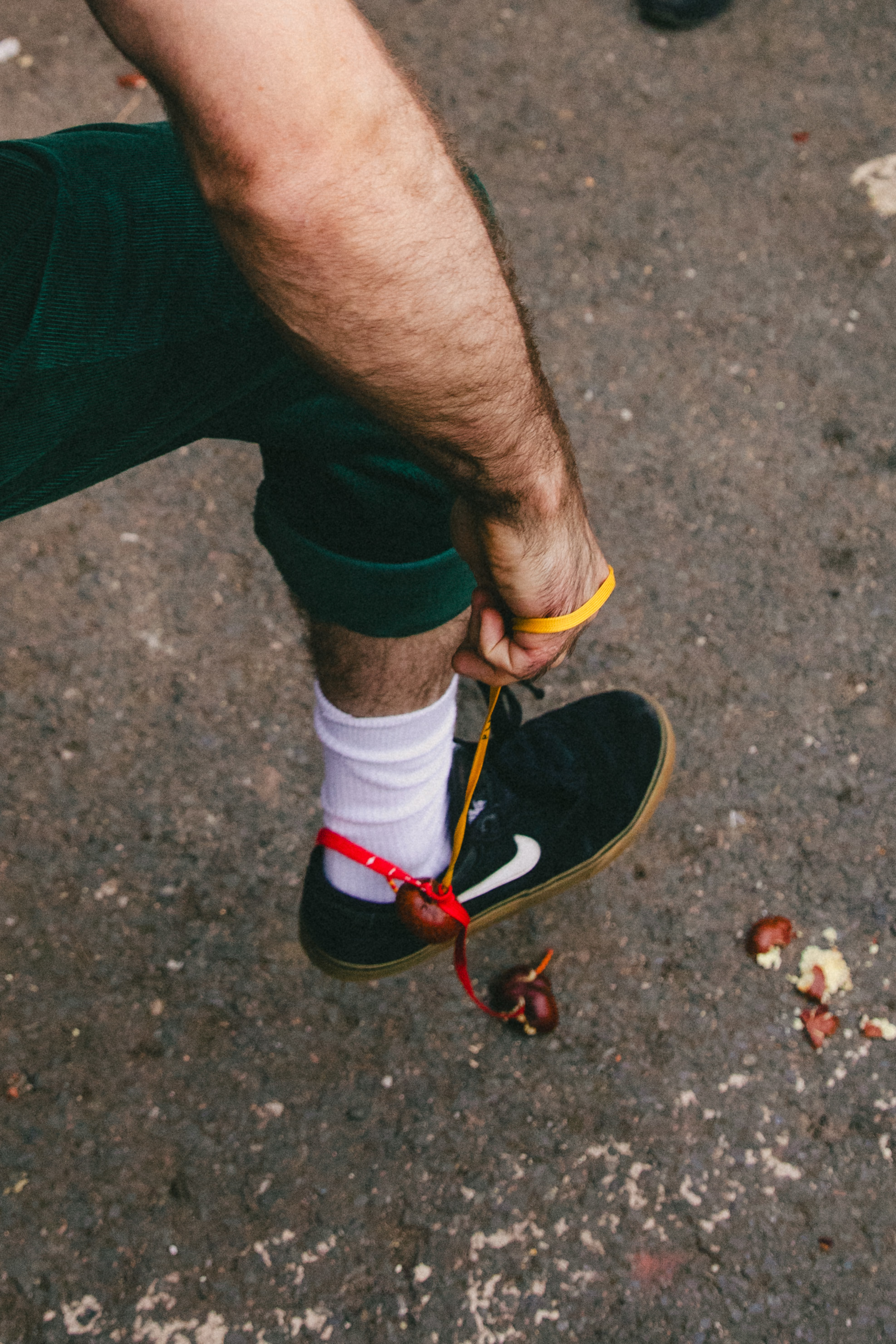 Nut wise, Harry is a purist and has hardened the conker he’ll use as today’s weapon in his sock drawer for the last 365 days. Like most competitors, he has the affluent artsy aesthetic of London’s hipster crowd: thick moustache, green cap, Nike Cortez trainers and tube socks. He could — as per Peckham Conker Club rules — use an array of martial arts-esque moves to take down his opponents: the Gravity Strike, Sidewinder, Super Chopper– but Harry hasn’t trained. His skill is simply his sturdiness: “I’m static. Stable. Sort of like a battering ram,” he says. “Plus, I’ve got reasonable hand-eye coordination and that’s what it’s all about […] I’m gonna win, probably.”