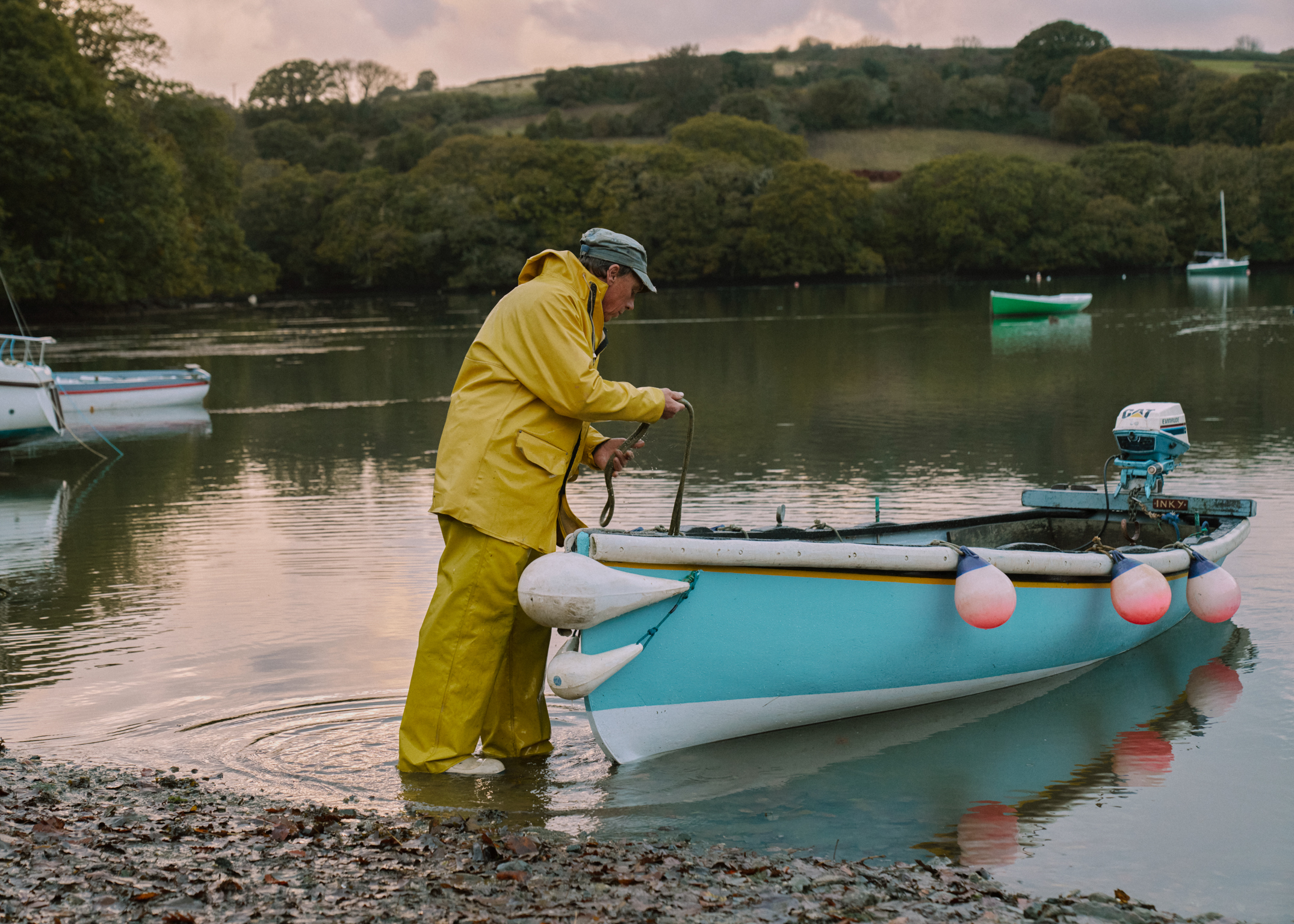 The Fal opens out slowly, the river widening and loosening as it goes. Mud banks catch and hold the early morning light. Gulls wheel overhead, calling to one another, our only witnesses. There are barely any other boats. Jason scans the water, squinting slightly, taking it all in.