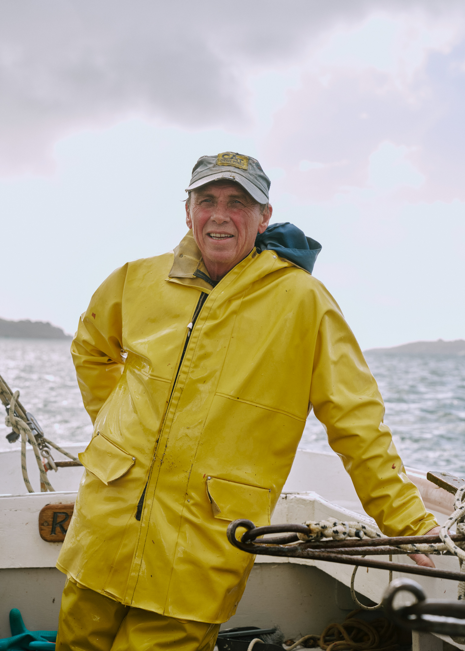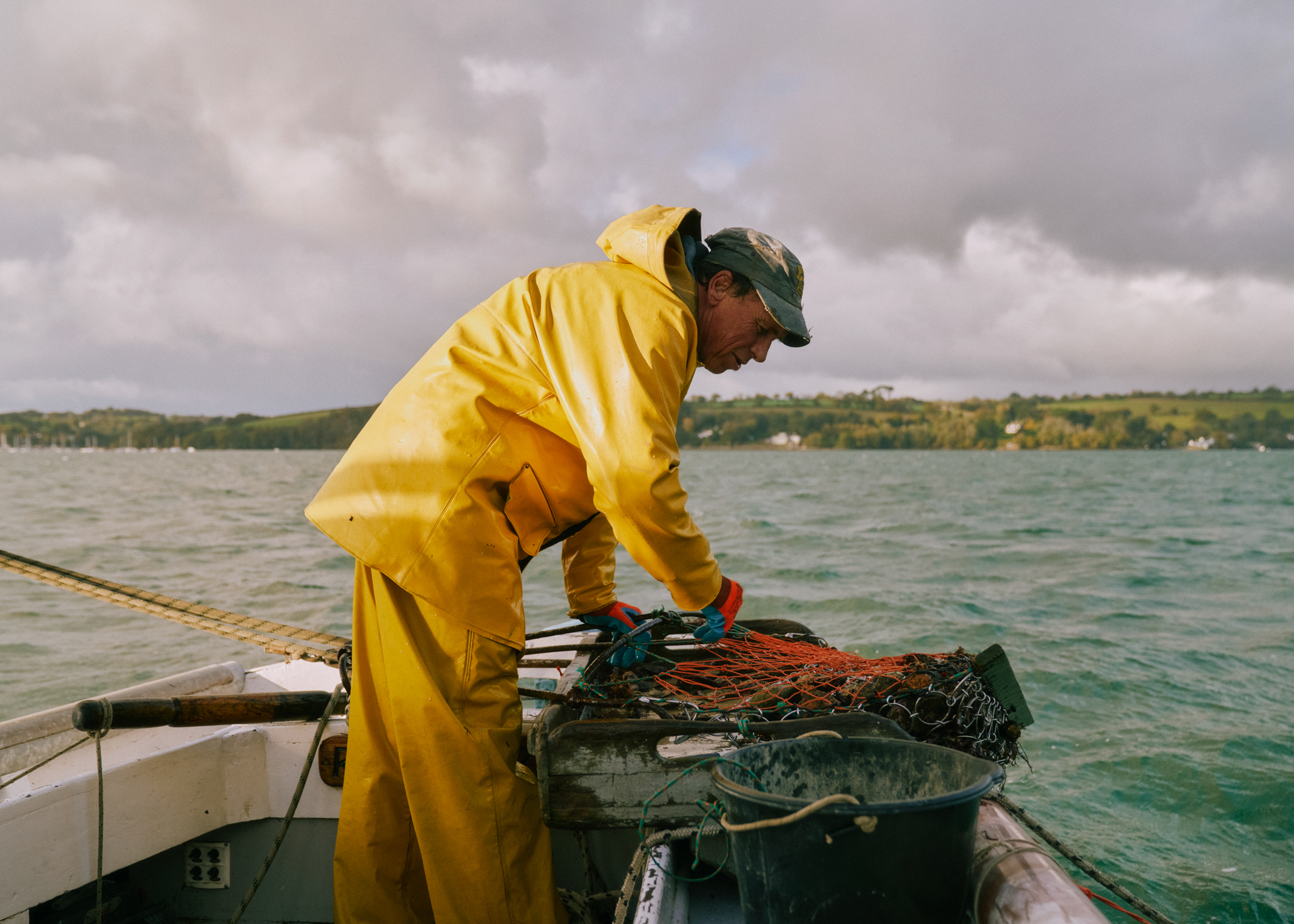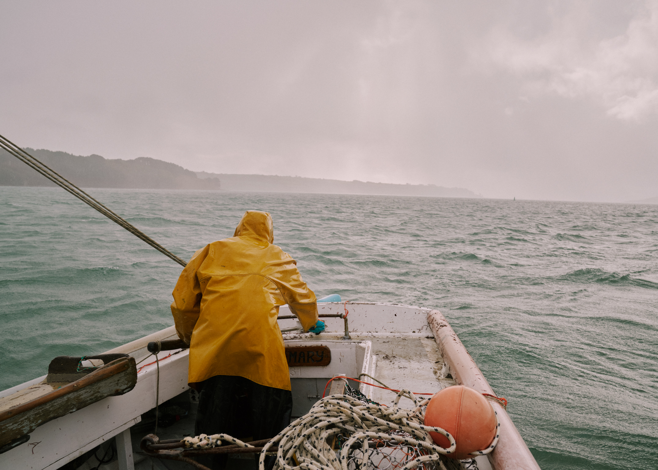 We repeat this process all day. Drop the dredges, drift, drag, haul, sort. Again and again, until repetition becomes rhythm and the work loses its edges. It is heavy, monotonous labour, performed in cold wind with occasional squalls of rain. Jason is normally out here all day, sustained by a thermos of tea, wet cigarettes, and the company of a seagull that perches on the end of the boat.