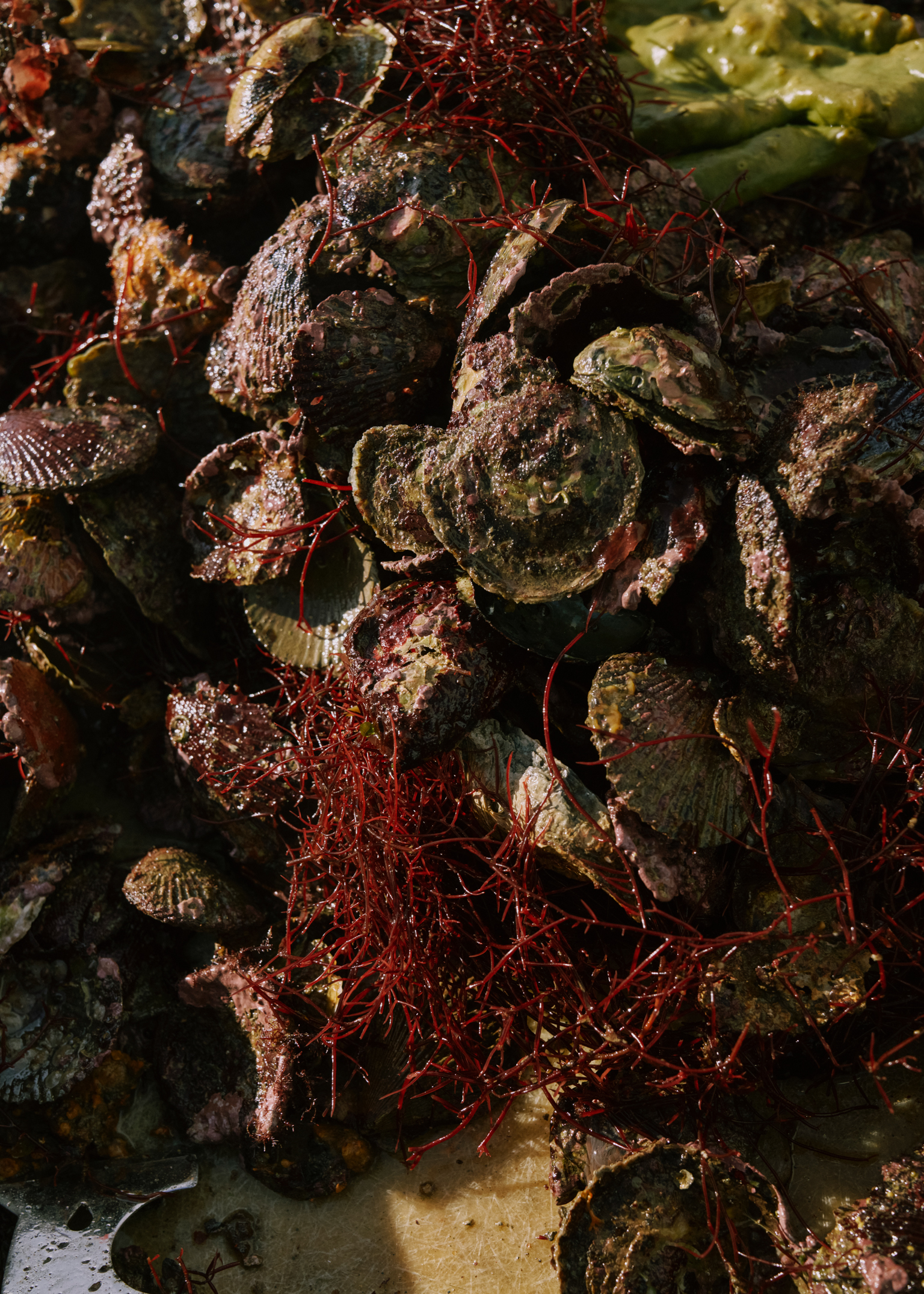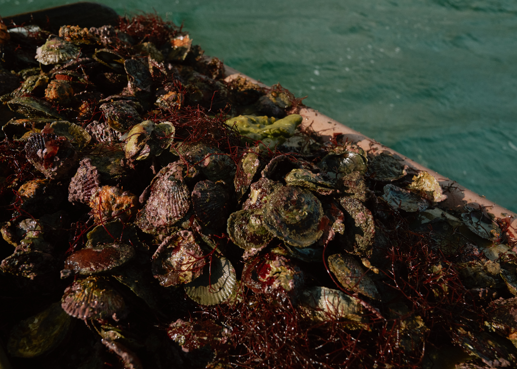 We haul the dredges in together. My heart lifts, expecting bounty. Instead, the contents spill onto the sorting board in a jumble: a few oysters, which get transferred into netted bags, but mostly empty shells, old scallop husks, and thick tangles of invasive purple algae that choke the beds.