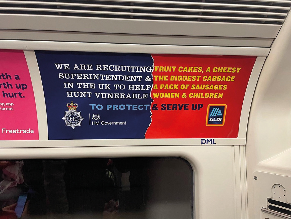 Subversive street artist Foka Wolf has an air of mystery about him. He’s never photographed and doesn’t like to give away too much for obvious reasons. He’s based somewhere in the UK’s Midlands area and has been using text installations and interruptions to highlight and protest against inequality for nearly a decade. From notes left on 4×4 owners’ windscreens questioning their penis size, to hacking London Underground adverts and taking over full advertising billboards, his pieces are subtle enough to make you think they might be real. Then you take a second look and realise what he’s done.