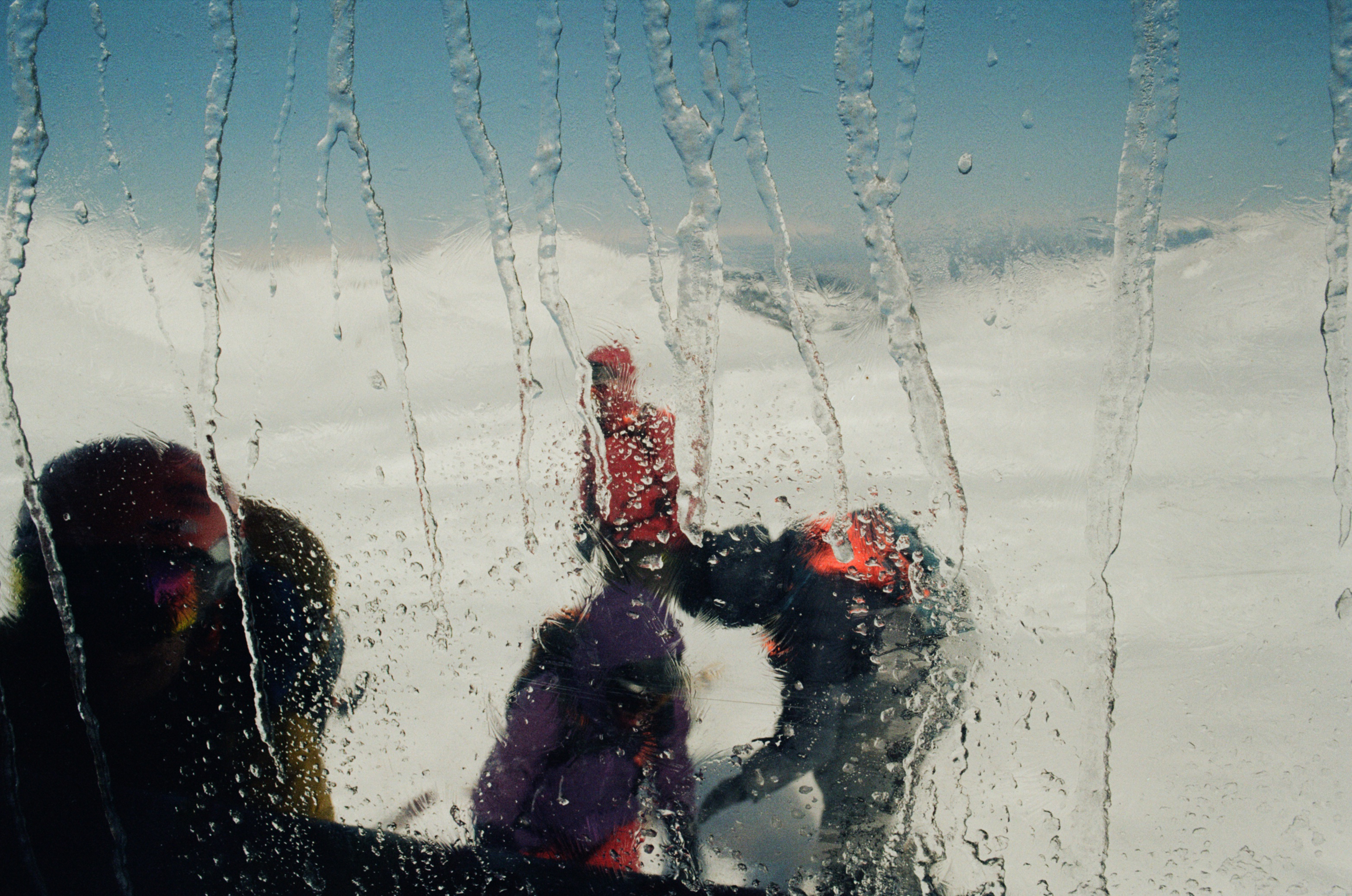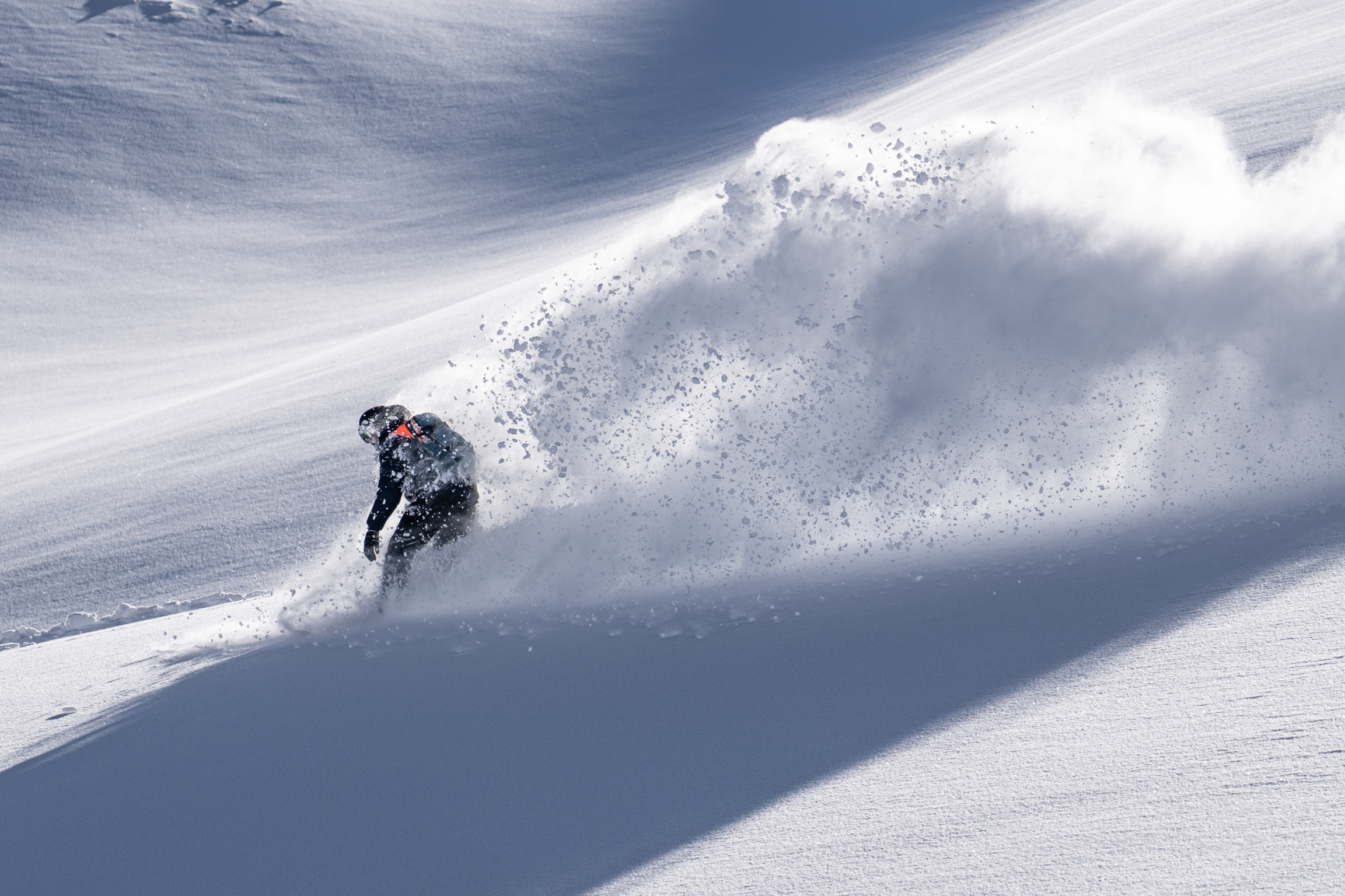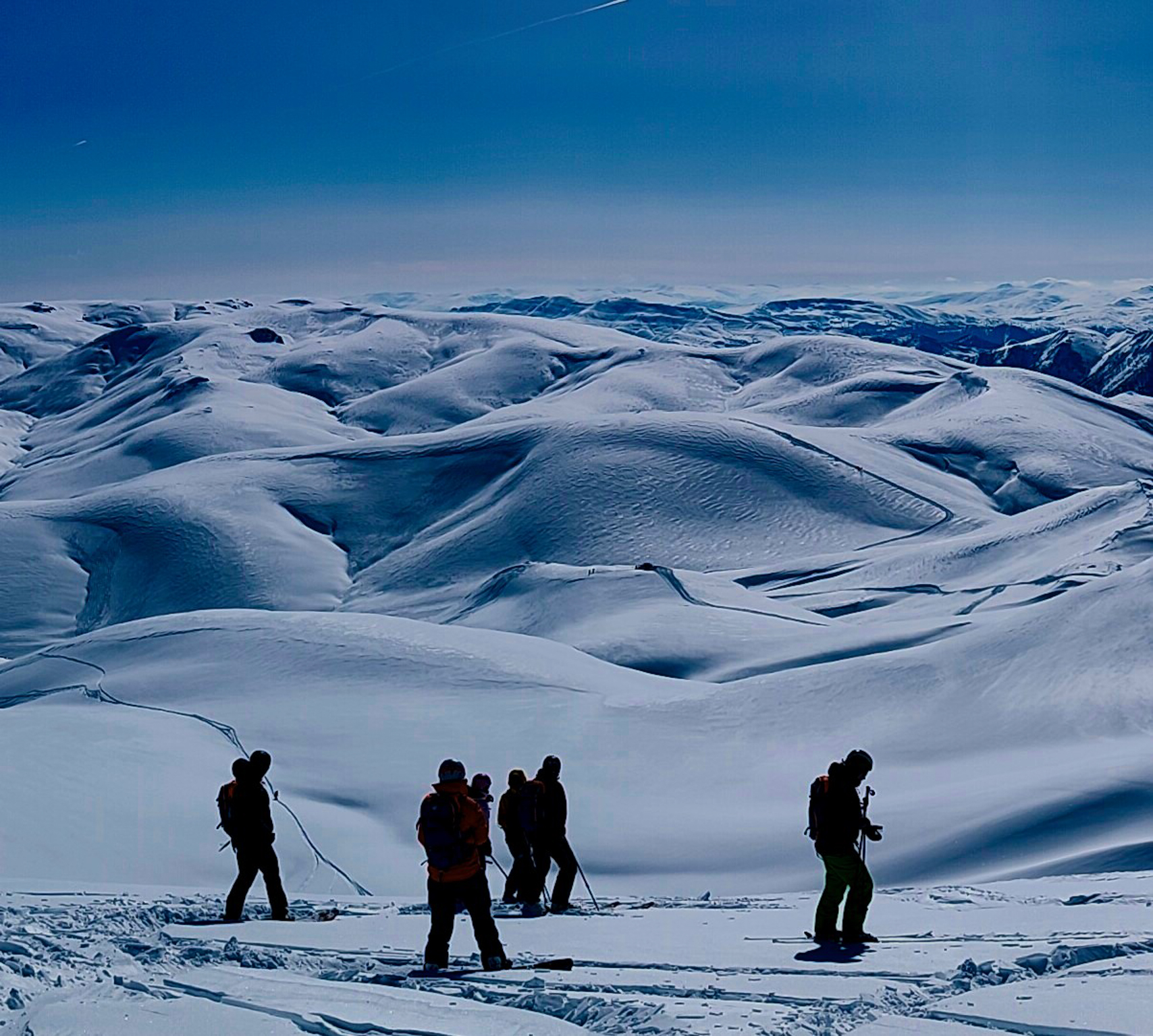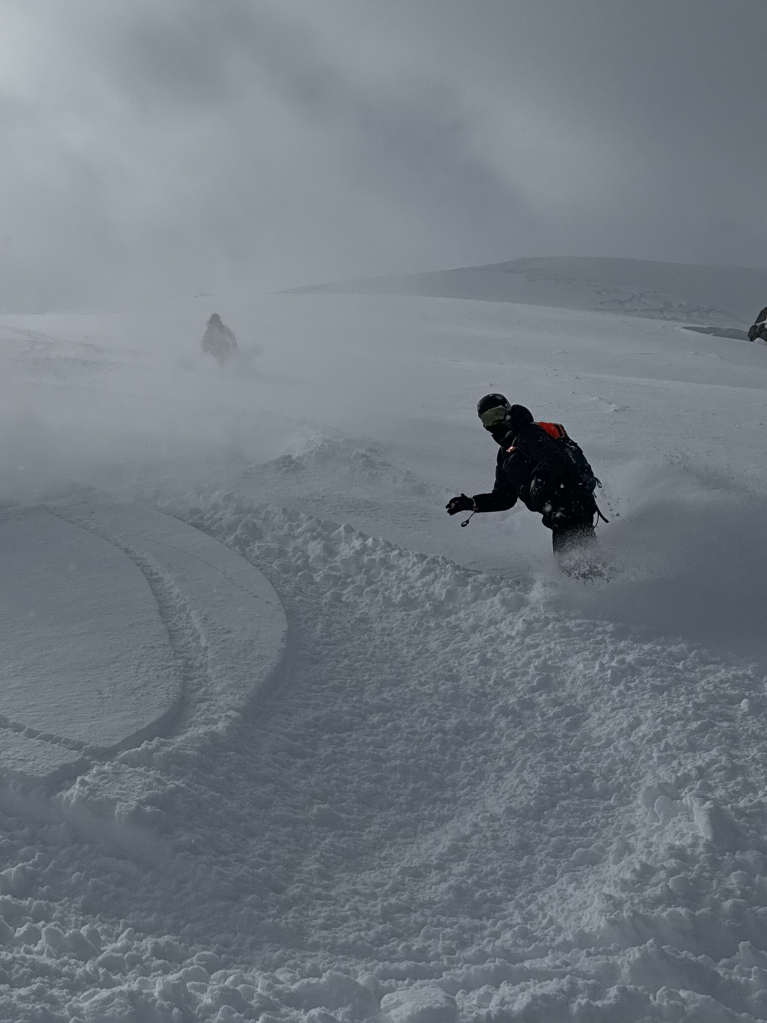 We are only metres from a hidden hazard that the group behind us didn’t foresee. They are now teetering on top of a 20ft cornice (overhanging snow shelf) that’s begun to collapse into a natural halfpipe below. What on a good day might have been an exhilarating feature to jump now has car size lumps of ice strewn across a femur snapping landing zone.