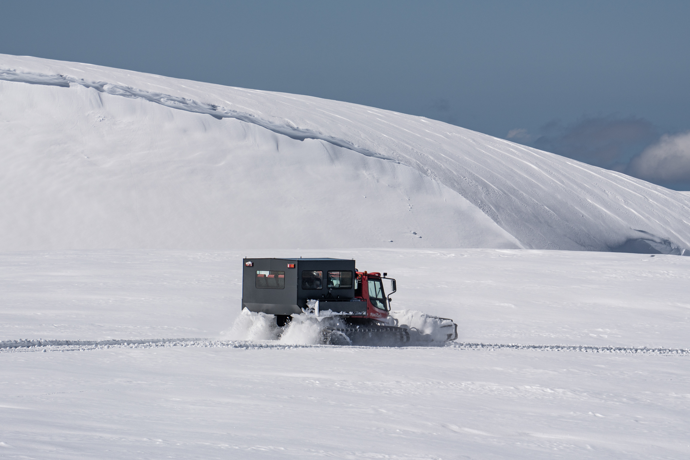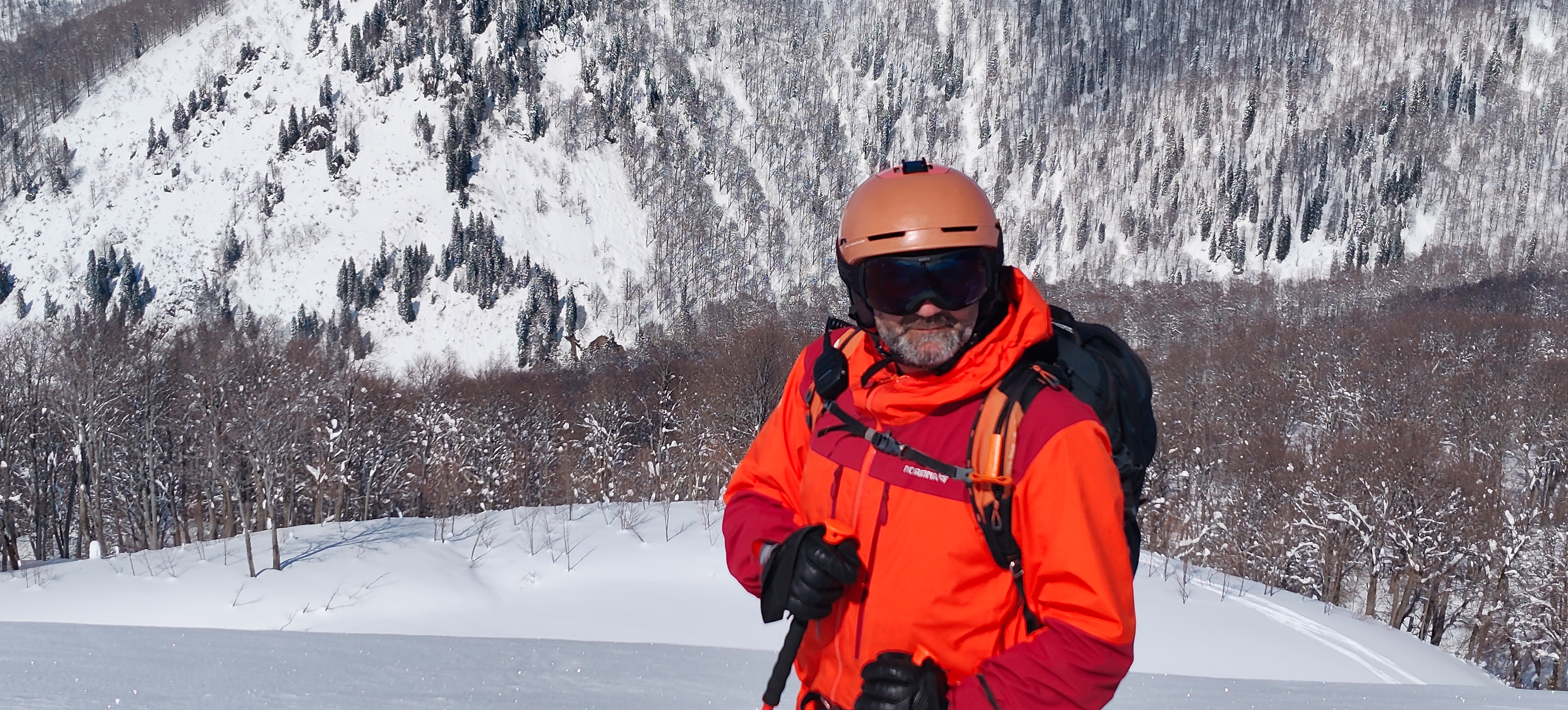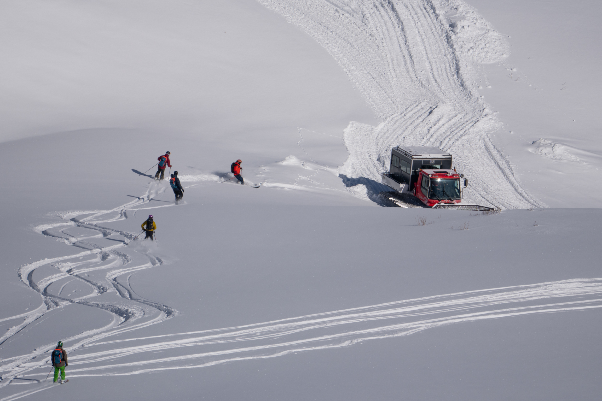 Shota traverses us away from danger; once he’s checked the other group is safe we ski down to our snowcat waiting at the junction of a summer road that snakes gently back to town.