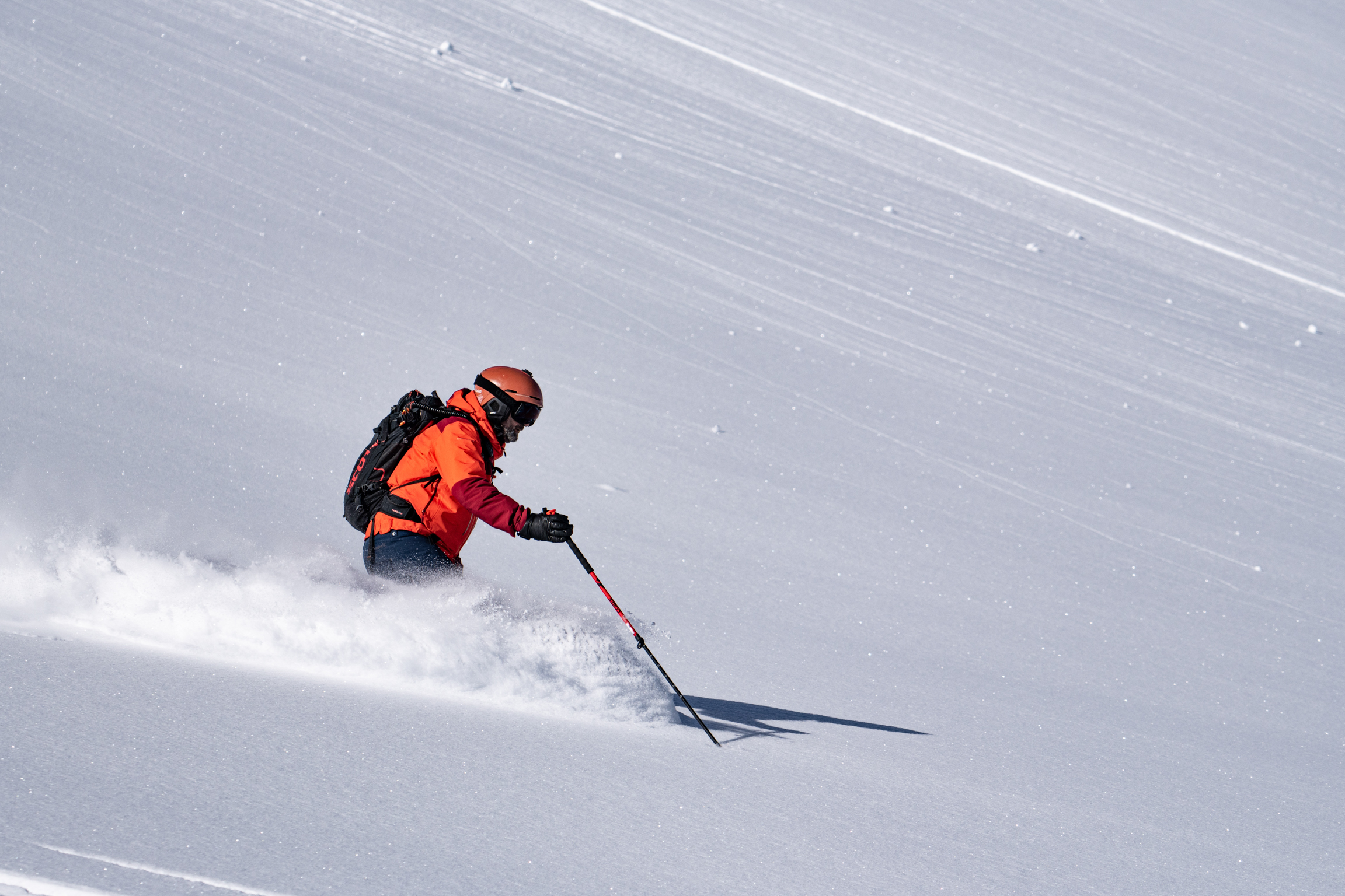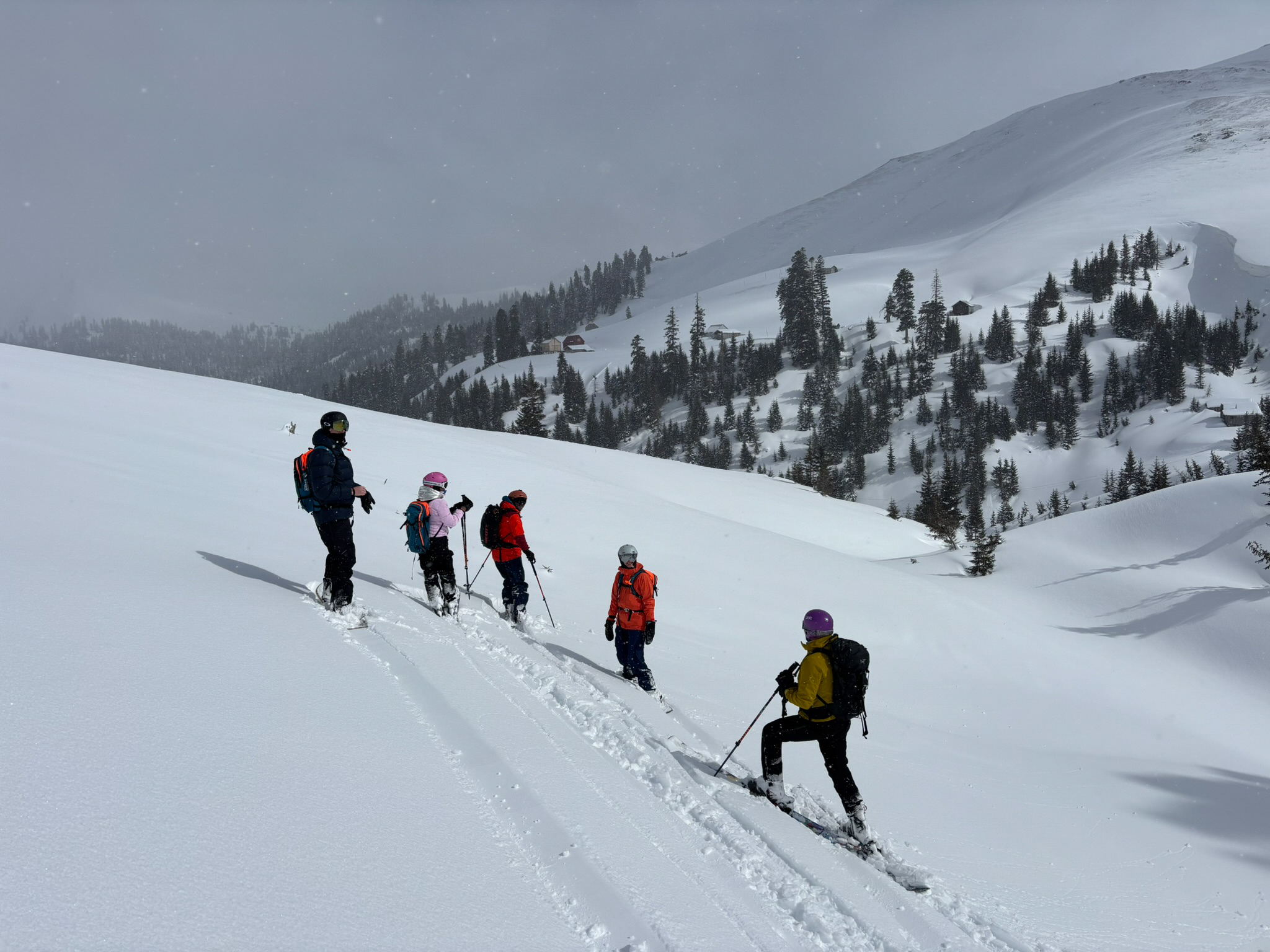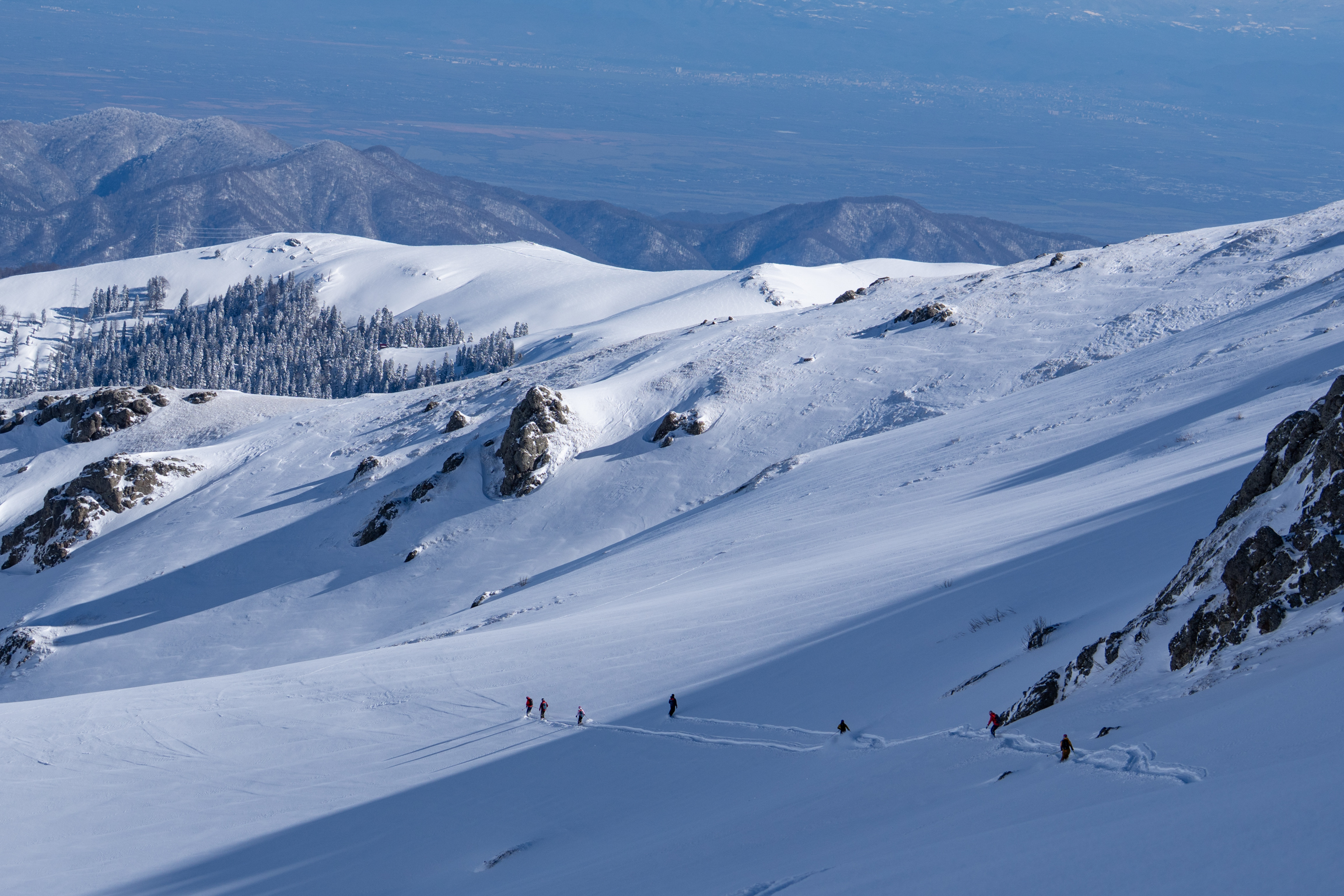Shota traverses us away from danger; once he’s checked the other group is safe we ski down to our snowcat waiting at the junction of a summer road that snakes gently back to town.