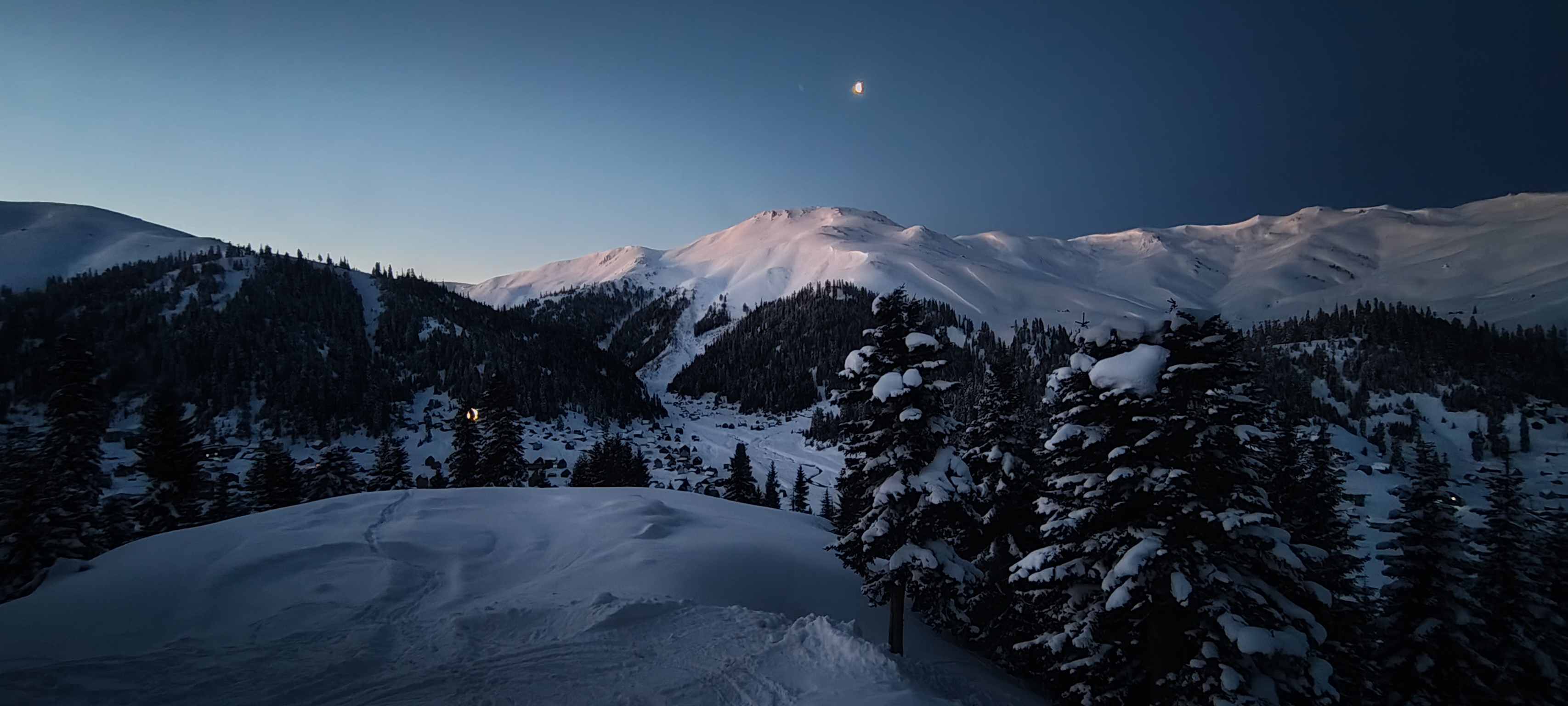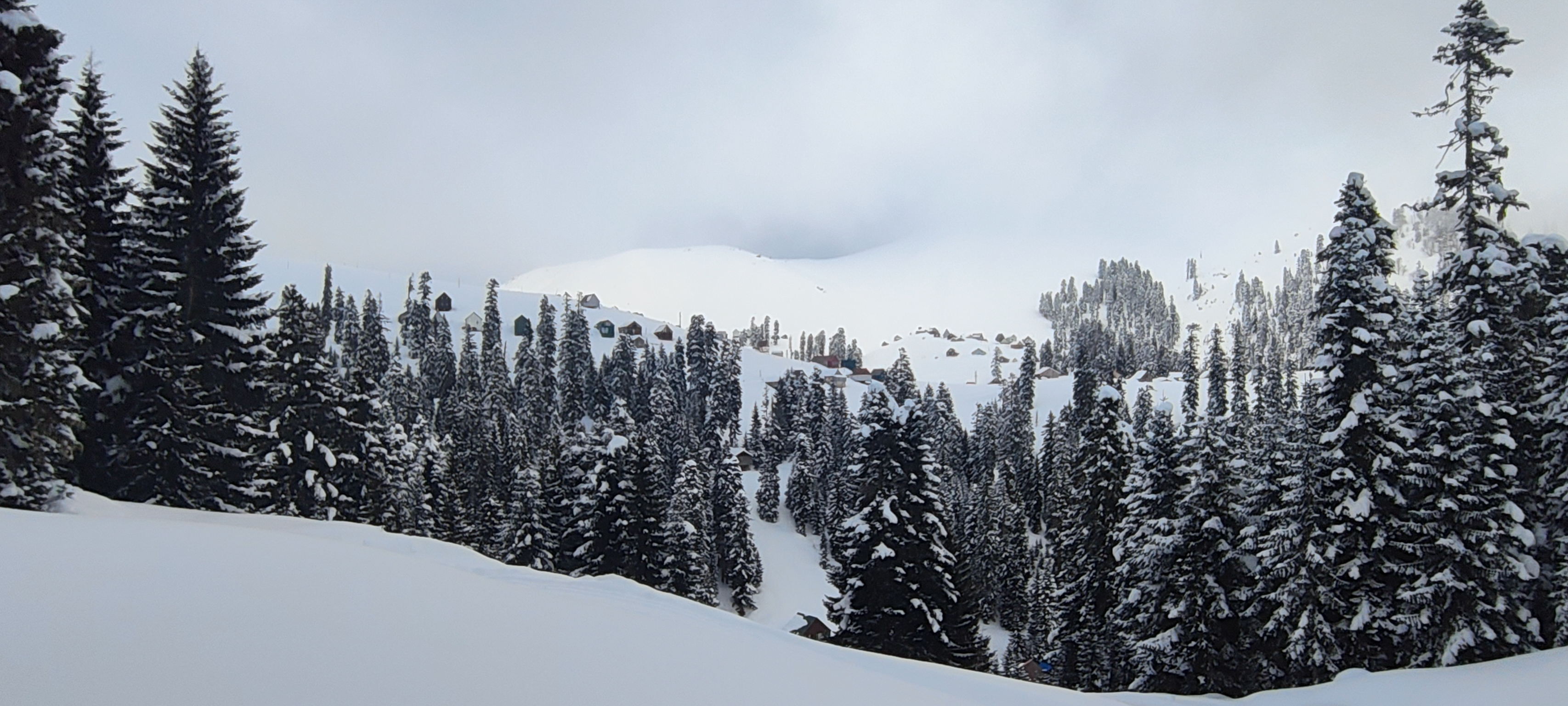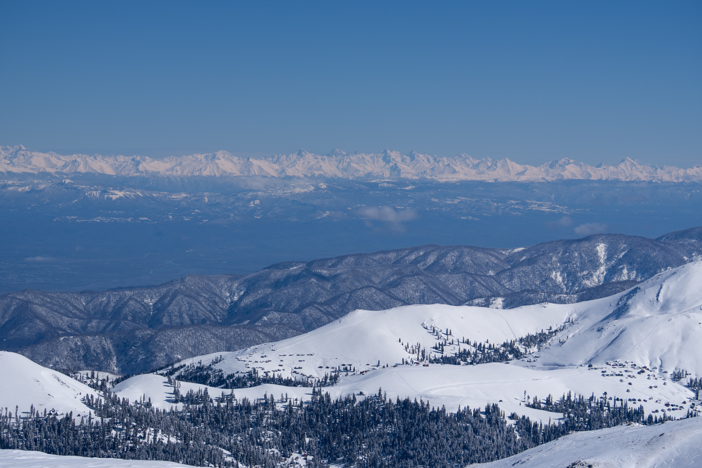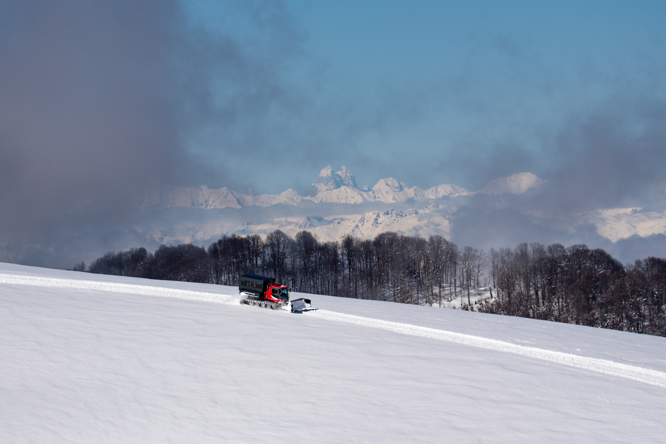 The tranquility of Bakhmaro under a matte of velveteen March powder is broken only by the powerful thrum of a snowcat vehicle.