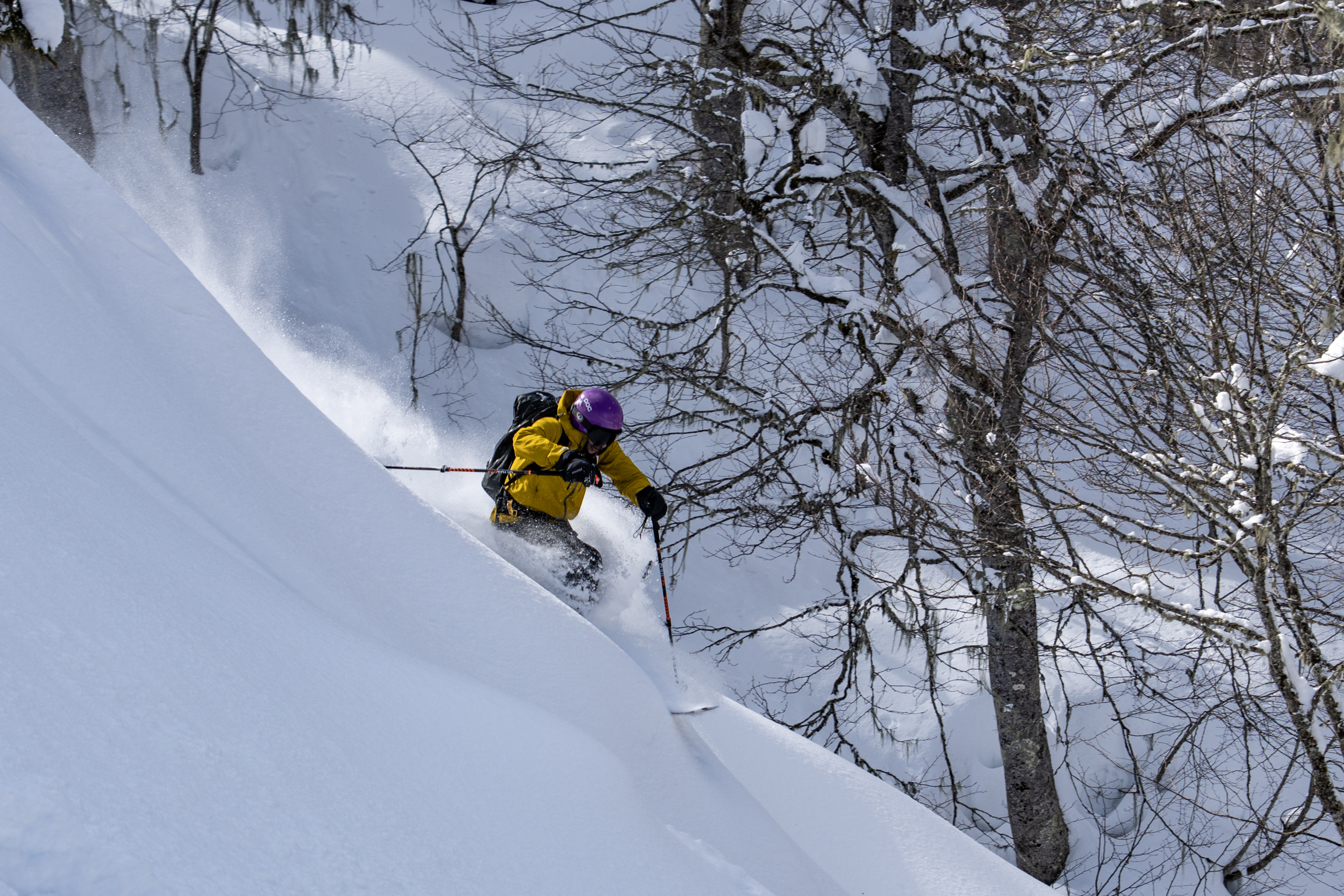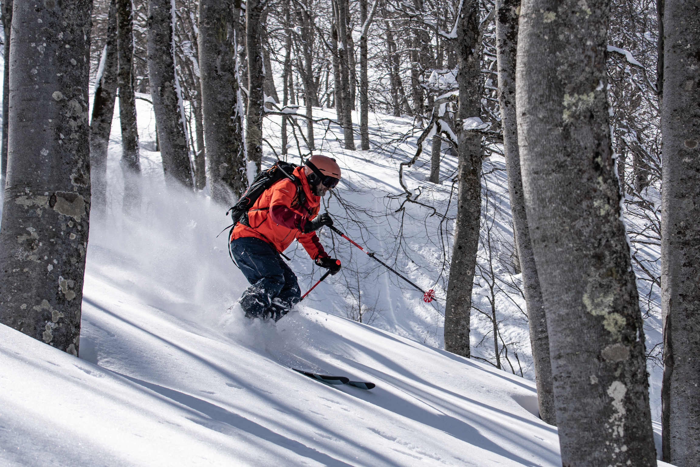 We decline and descend from the alpine into the woods; precious pockets of shade reappear, protected from sun and wind. Last run of the day – last run of the trip – Bakhmaro blesses us once again. Wisps of white stuff spin high as we disturb the few boughs still laden with Black Sea storm snow.