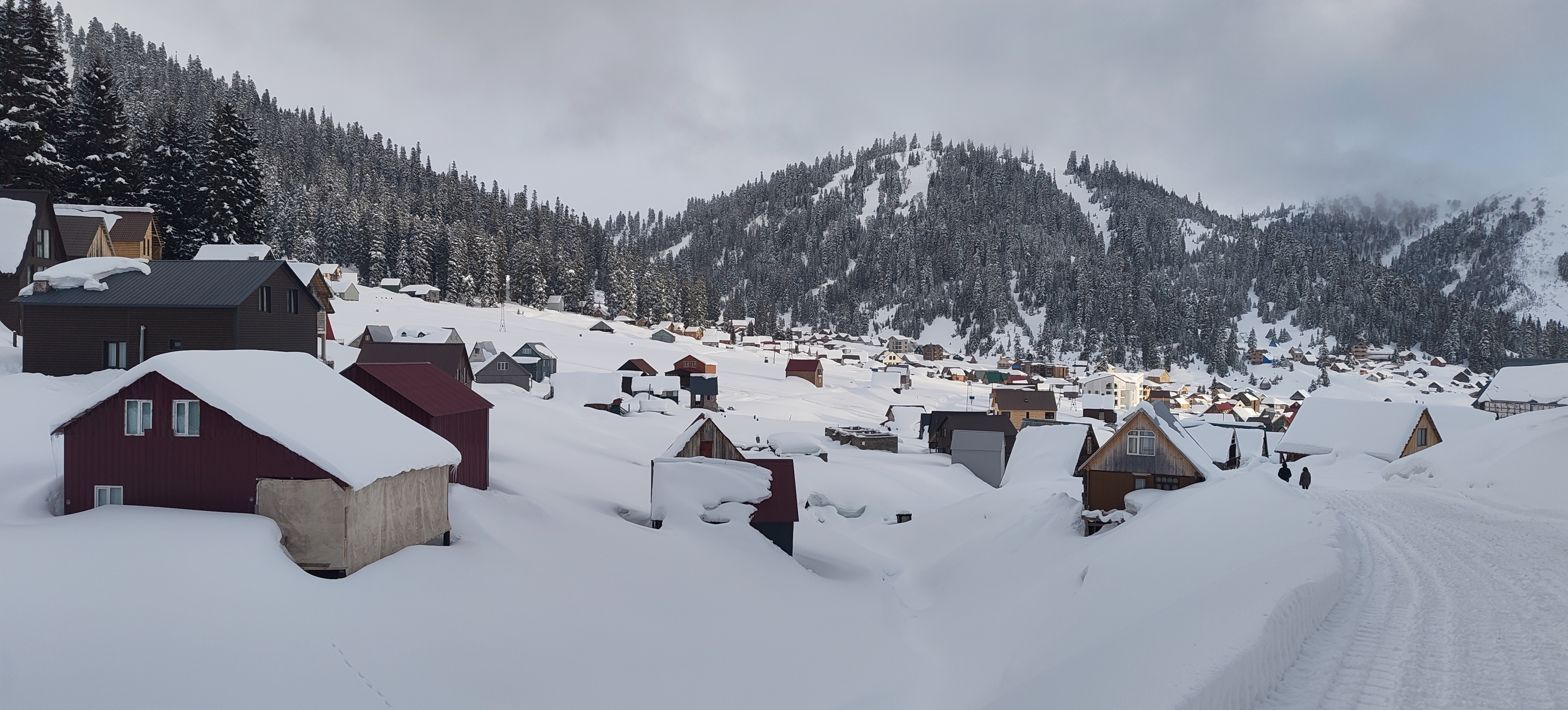 Bakhmaro nestles several miles below, serried ranks of sharp roofed shepherds huts arranged like a giant’s cheese grater tilted on its side. As we gingerly edge our way home, a group from a different snowcat firm barrels uncomfortably close to us. Shota is visibly annoyed. This mountain traffic jam is precisely the kind of situation he hopes regulation will prevent.