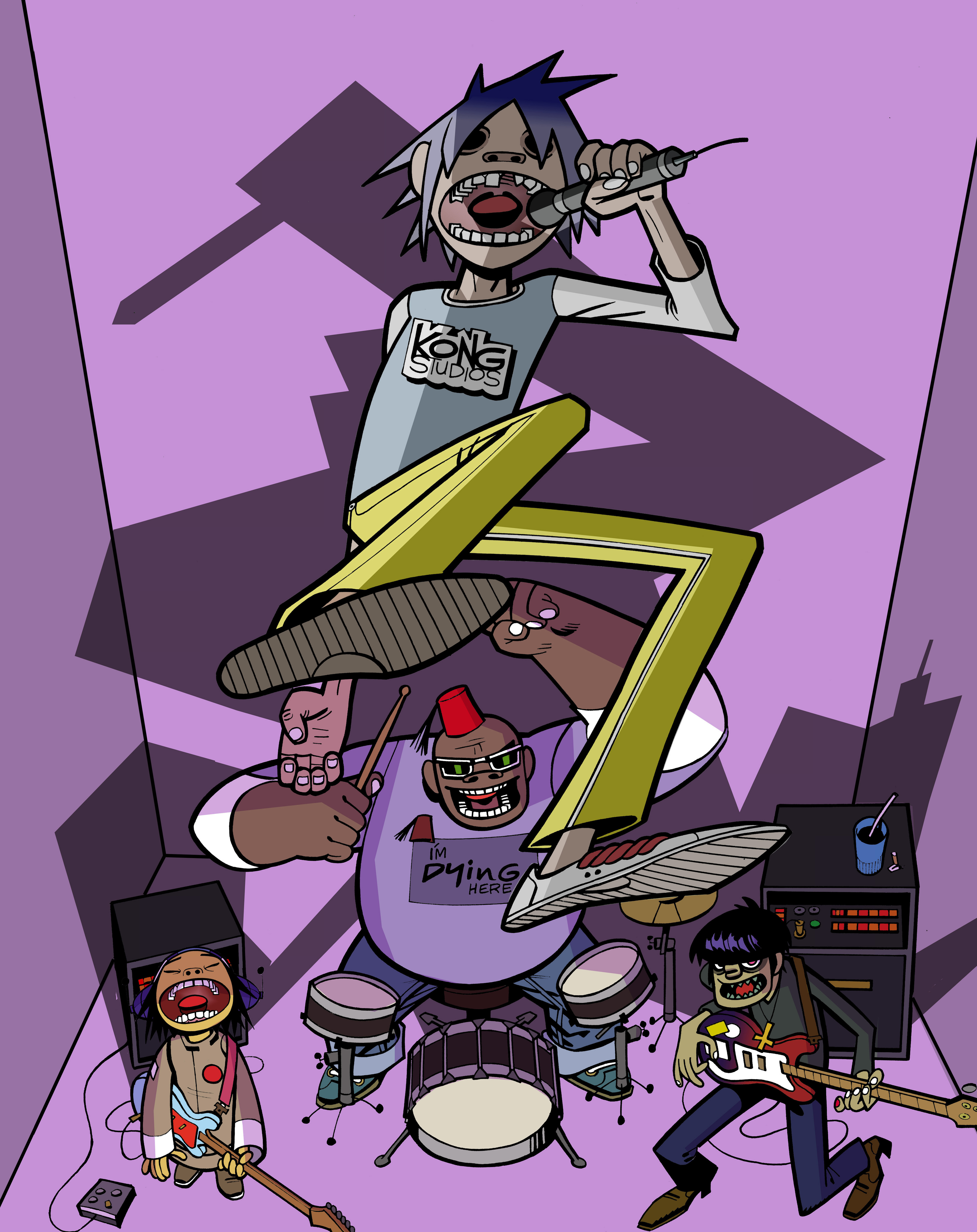 Around 2006, I got a phone call from Hewlett. He told me that for part of his record deal, the label gave him a photocopier for his Zombie Flesh Eater Studio in west London, and asked if I wanted to print my art zine Pavement Licker there ’til the ink ran out. I took him up on the offer. It was an immaculate space and his pencils were all lined up on his desk, neatly sharpened. I tell him I remember his studio manager Kirsti letting me in, who then slept on the sofa the whole time I was there. “That was between Demon Days, going into Plastic Beach. She was probably asleep because we used to party,” Hewlett chuckles. “We had three Xboxes set up with big screens, and we would spend most of the day playing Halo death matches, smoking a lot of weed, and there was a bar downstairs. So at the end of the day, everyone would go down to the bar and then back up to the studio at midnight for another party. That was three or four times a week, and we still got all the work done. Banksy used to come and use that photocopier. He would come and hang out in my studio to draw, and then just be photocopying stuff. He got the most use out of my photocopier, that’s for sure. But we were younger then, so I guess we could tolerate the hangovers, but it was a good time. Can’t do that anymore, you have to be a little bit smarter about how you cut loose.”