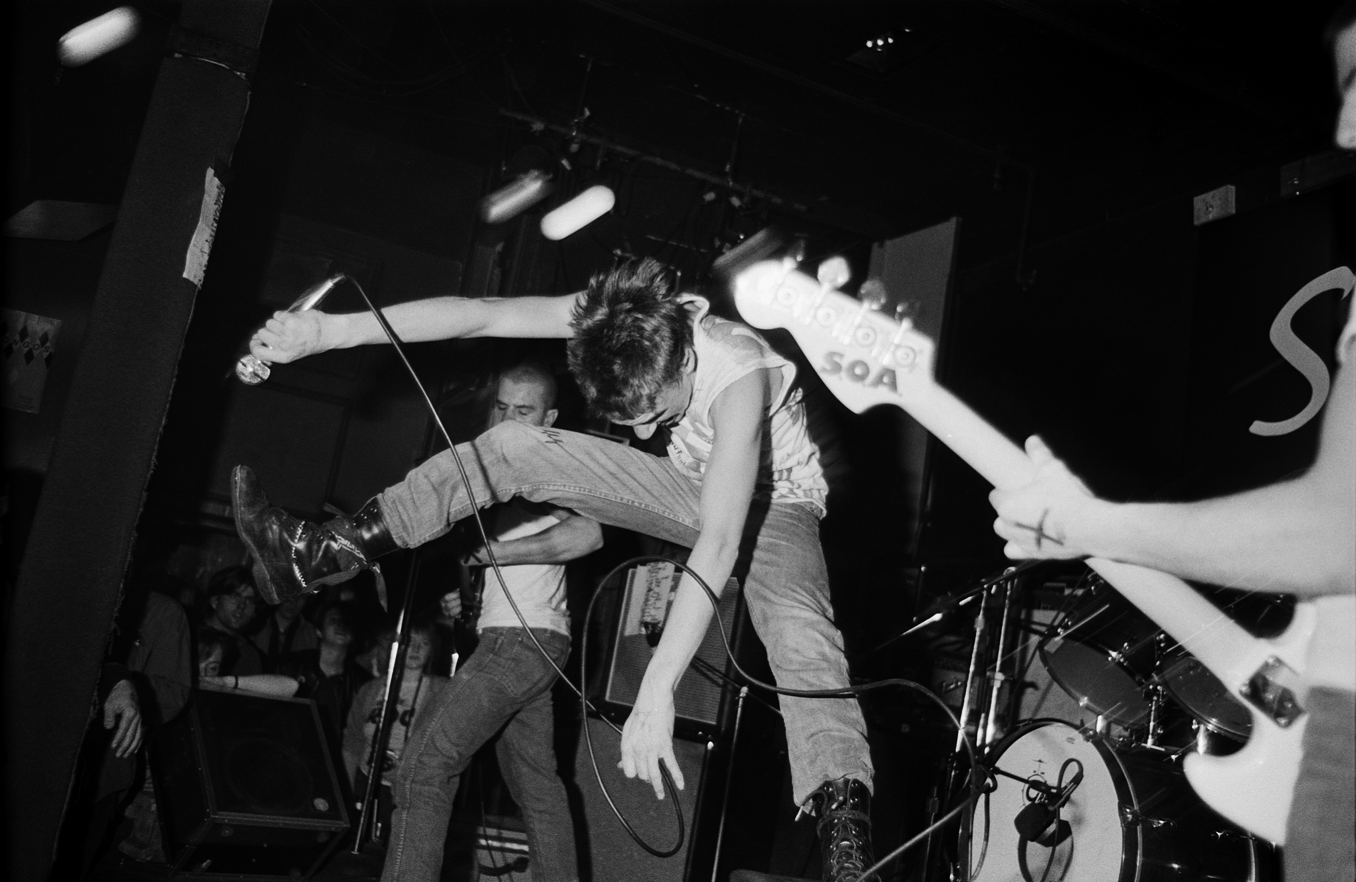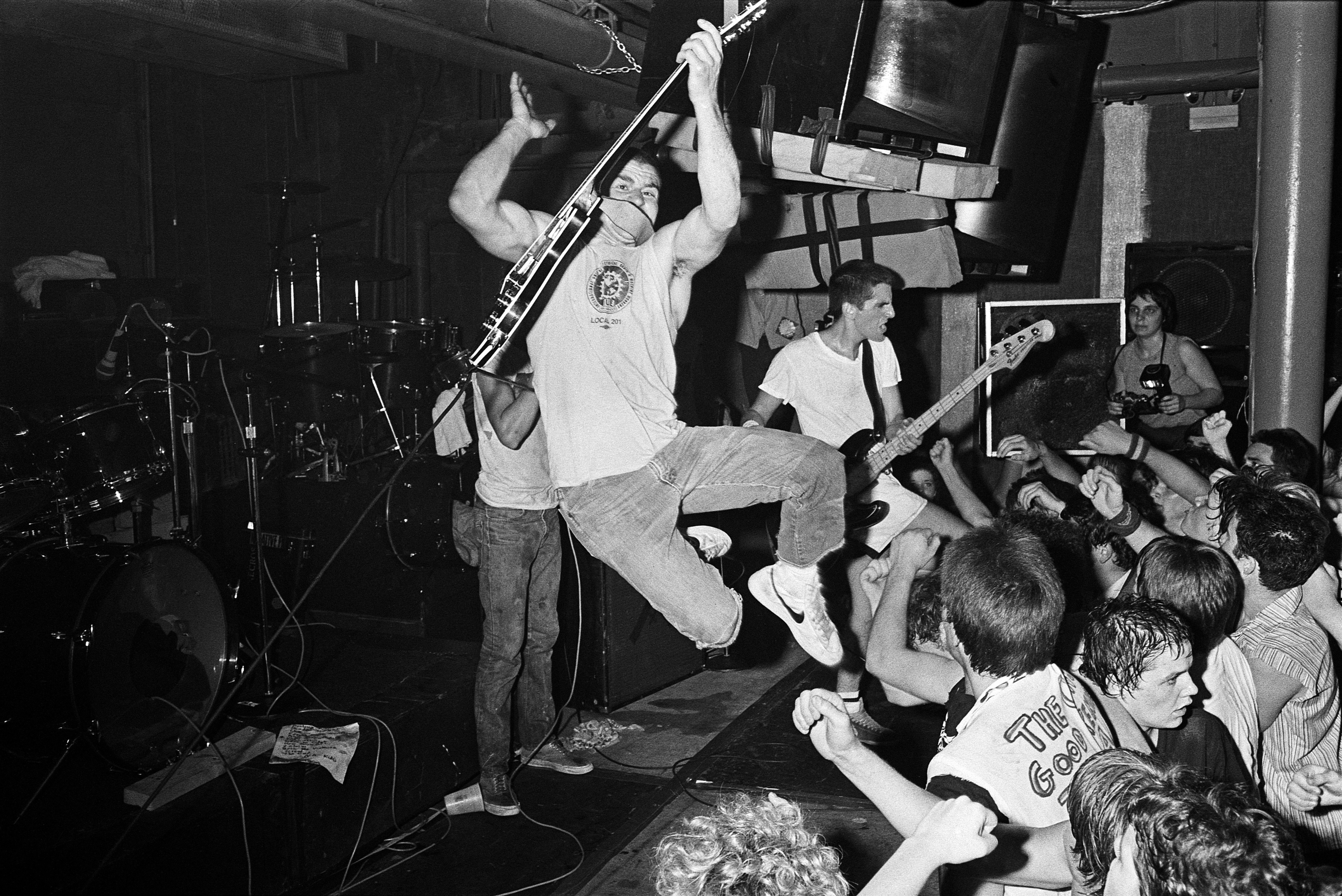 Hardcore photography is, broadly speaking, about capturing movement on top of movement, with band and crowd coming together in a rising tide of sweat and fists. But there’s something else going on in Philin Phlash’s black and white shots of SSD performing at Gallery East in Boston over 40 years ago. Set against the stark backdrop of the art space’s bleached walls, the young Boston group’s leaps and lunges appear almost balletic. “The band was very visual,” guitarist Al Barile says.