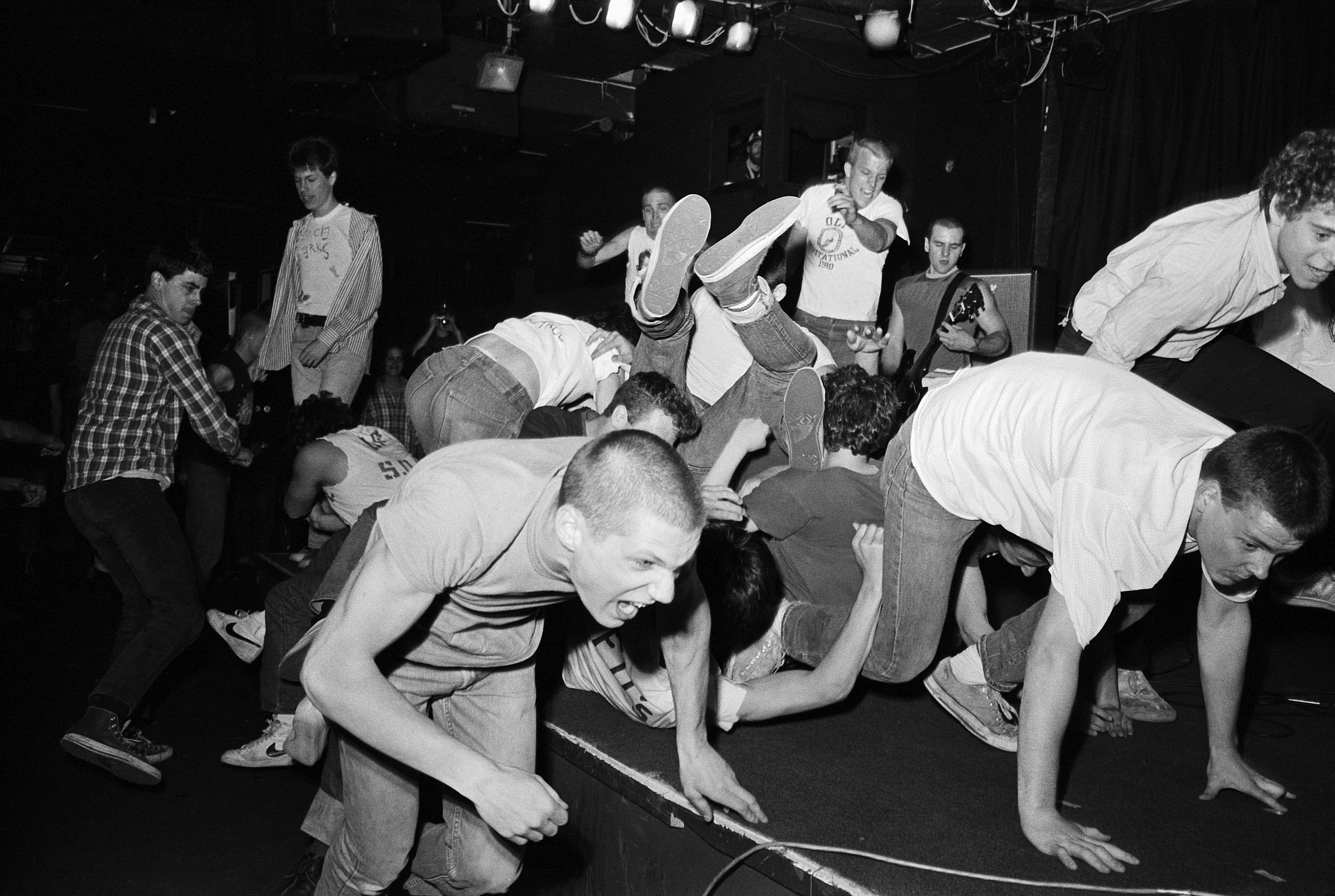 His group photos of the Boston Crew, a mishmash of punks and skaters who orbited SSD, offer up skinheads, watch caps and a keen sense of urban disaffection. Every rendering of vocalist David ‘Springa’ Spring, meanwhile, is pocked with youthful snot, and other images capture a tangle of social and musical preoccupations in a single frame.