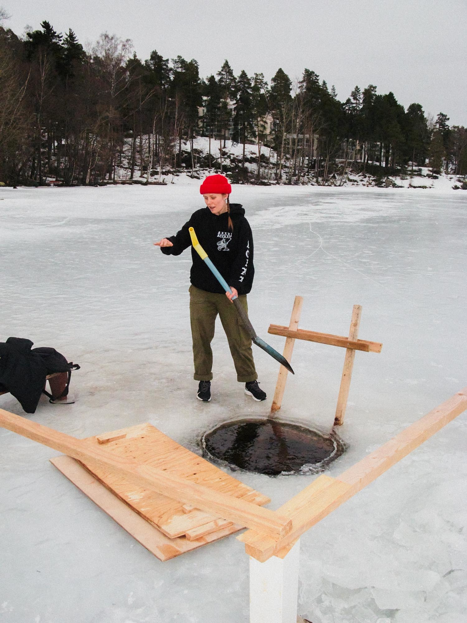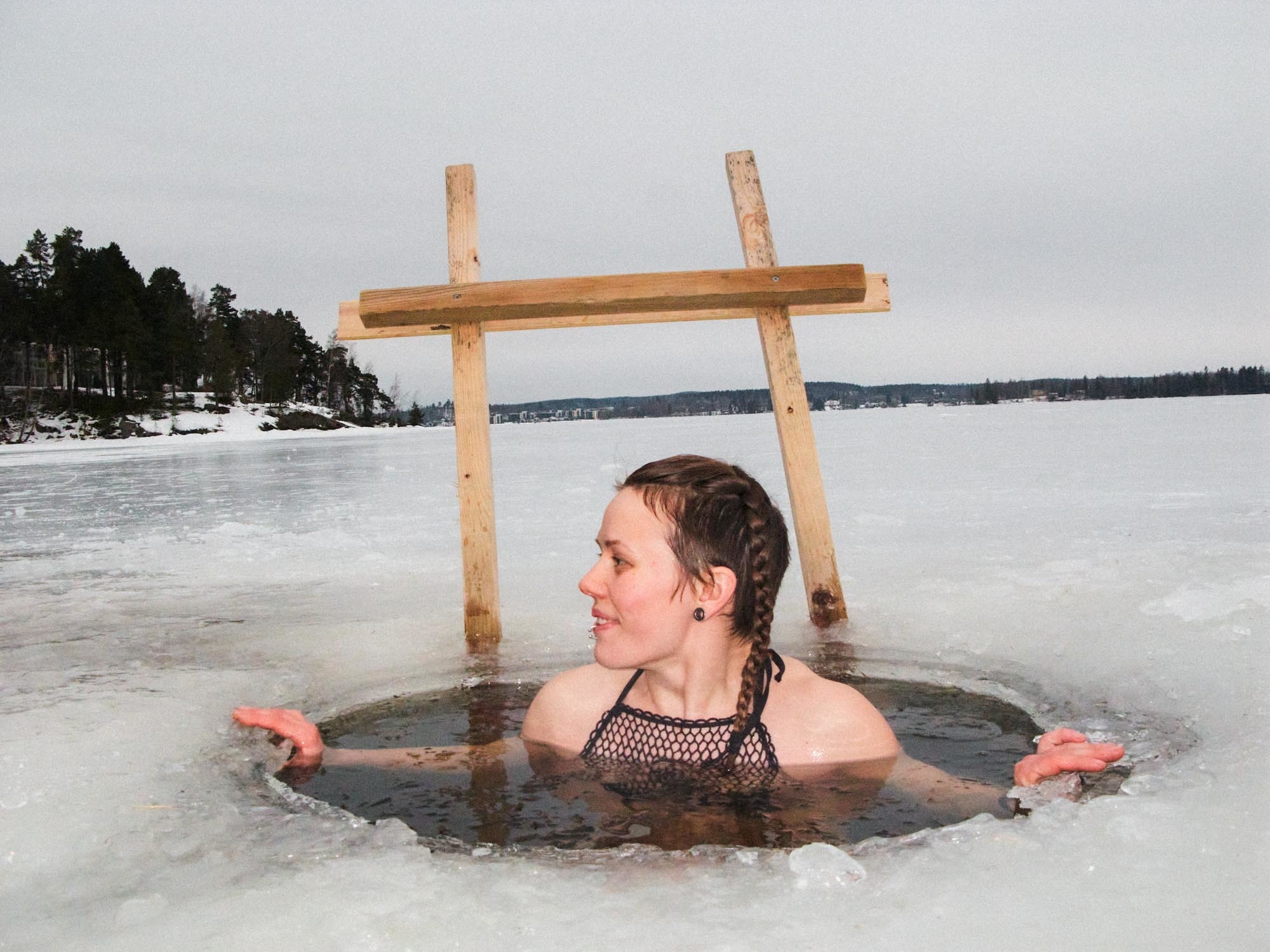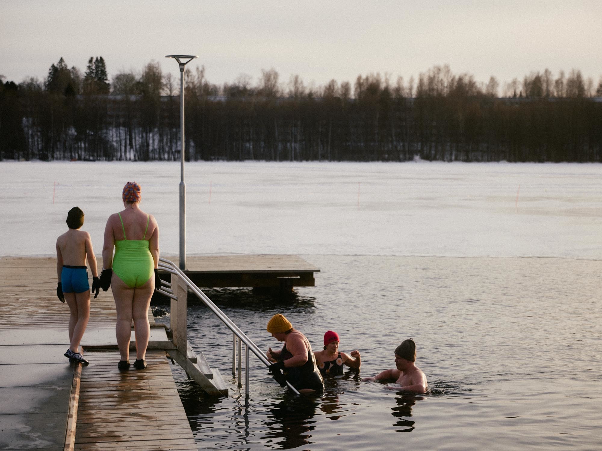 “Before getting in, it’s always feels brutal but you feel the goodness afterwards,” Heini explains as she starts stripping down on the ice. Gingerly, she steps down the wooden ladder into the hole, which is barely large enough to fit her. She raises her hands above her head, closes her eyes, inhales and exhales deeply, then plunges herself down into the icy water, disappearing from view.