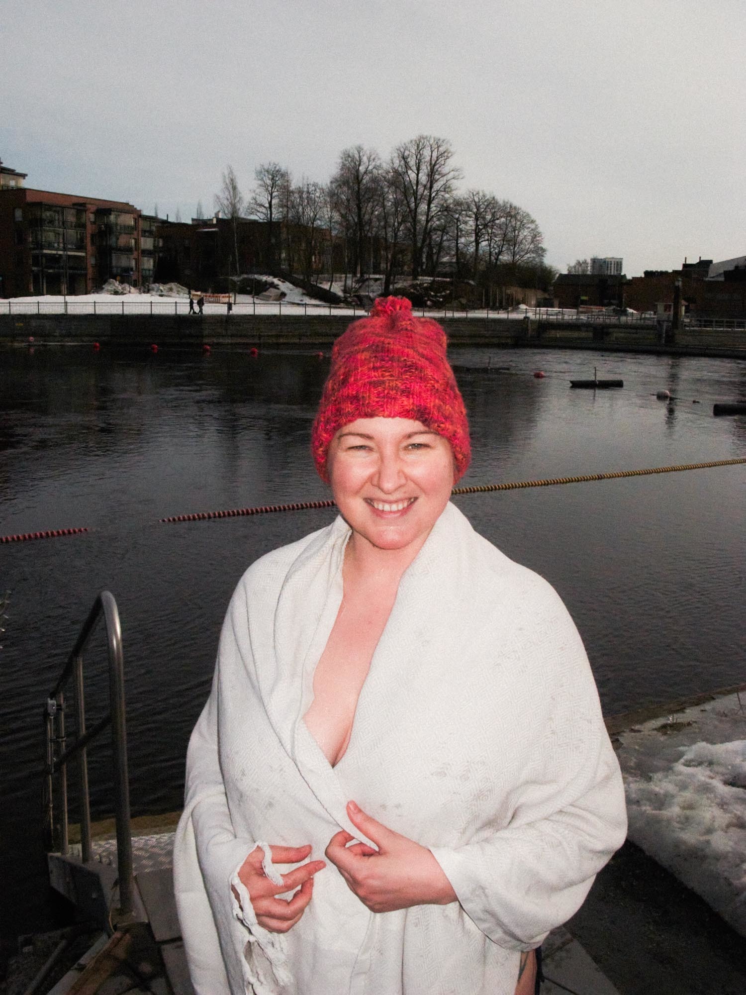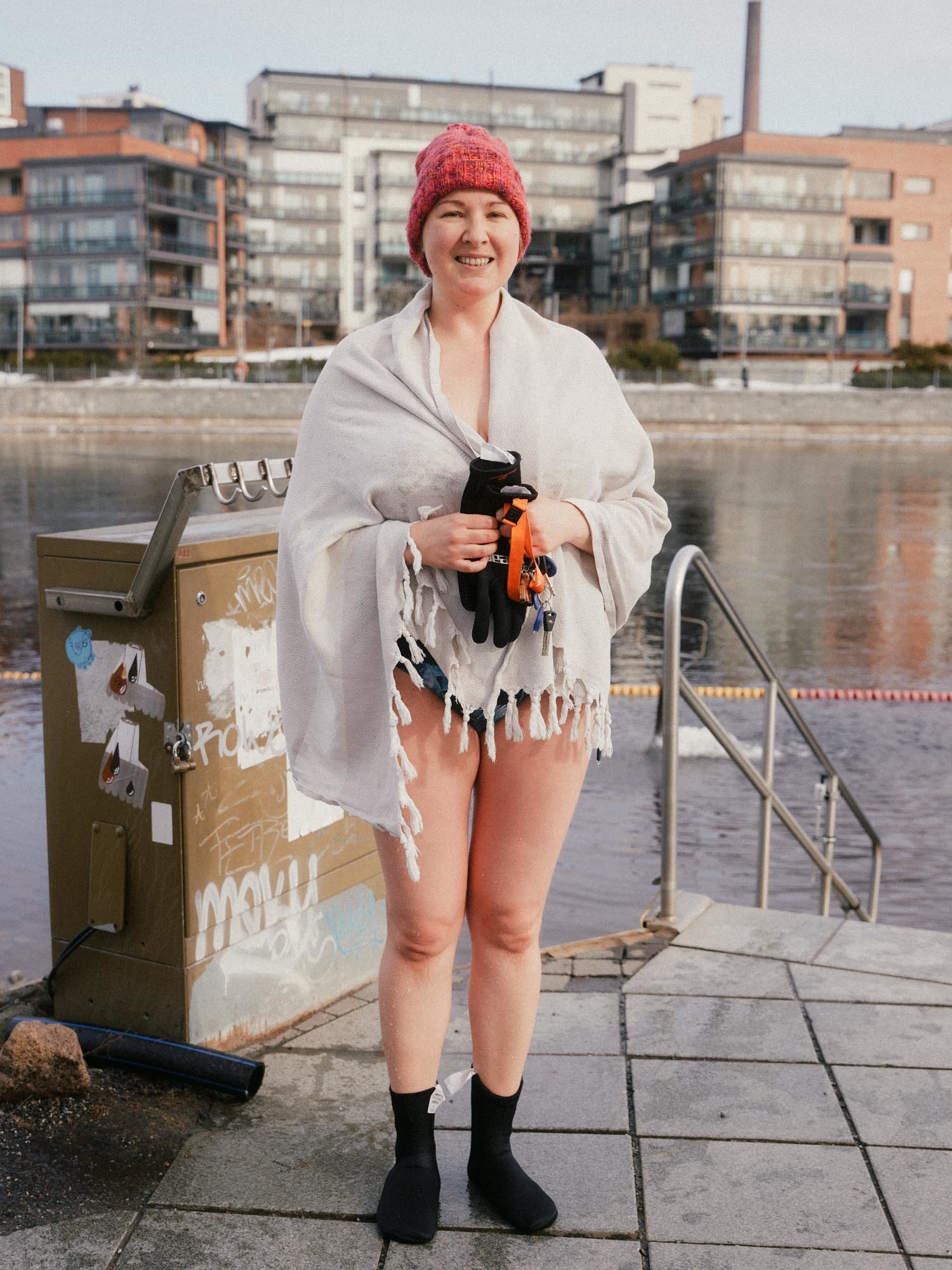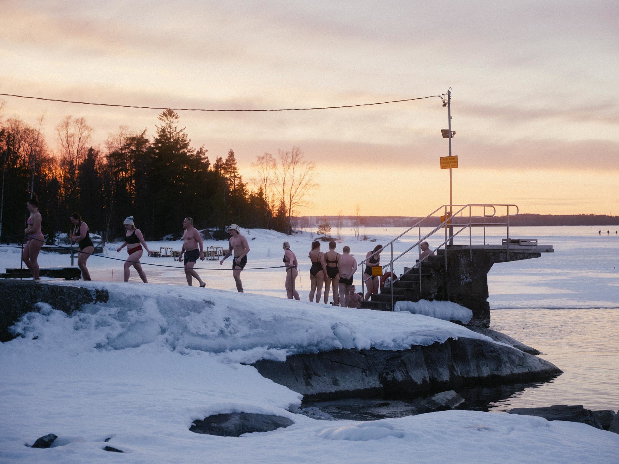 “Before getting in, it’s always feels brutal but you feel the goodness afterwards,” Heini explains as she starts stripping down on the ice. Gingerly, she steps down the wooden ladder into the hole, which is barely large enough to fit her. She raises her hands above her head, closes her eyes, inhales and exhales deeply, then plunges herself down into the icy water, disappearing from view.
