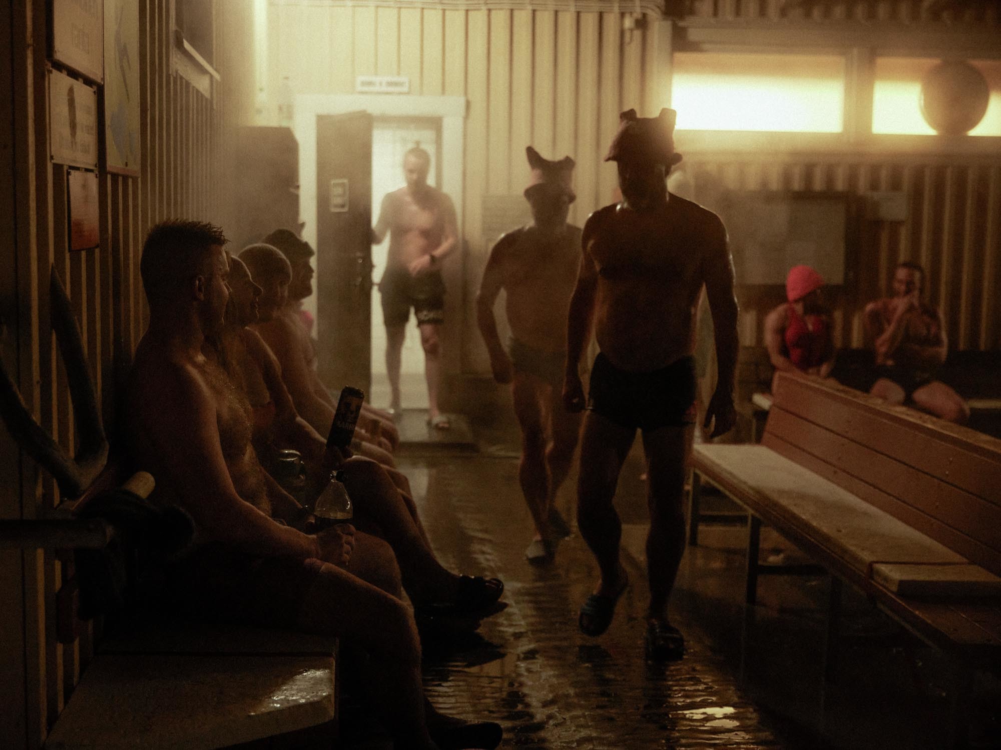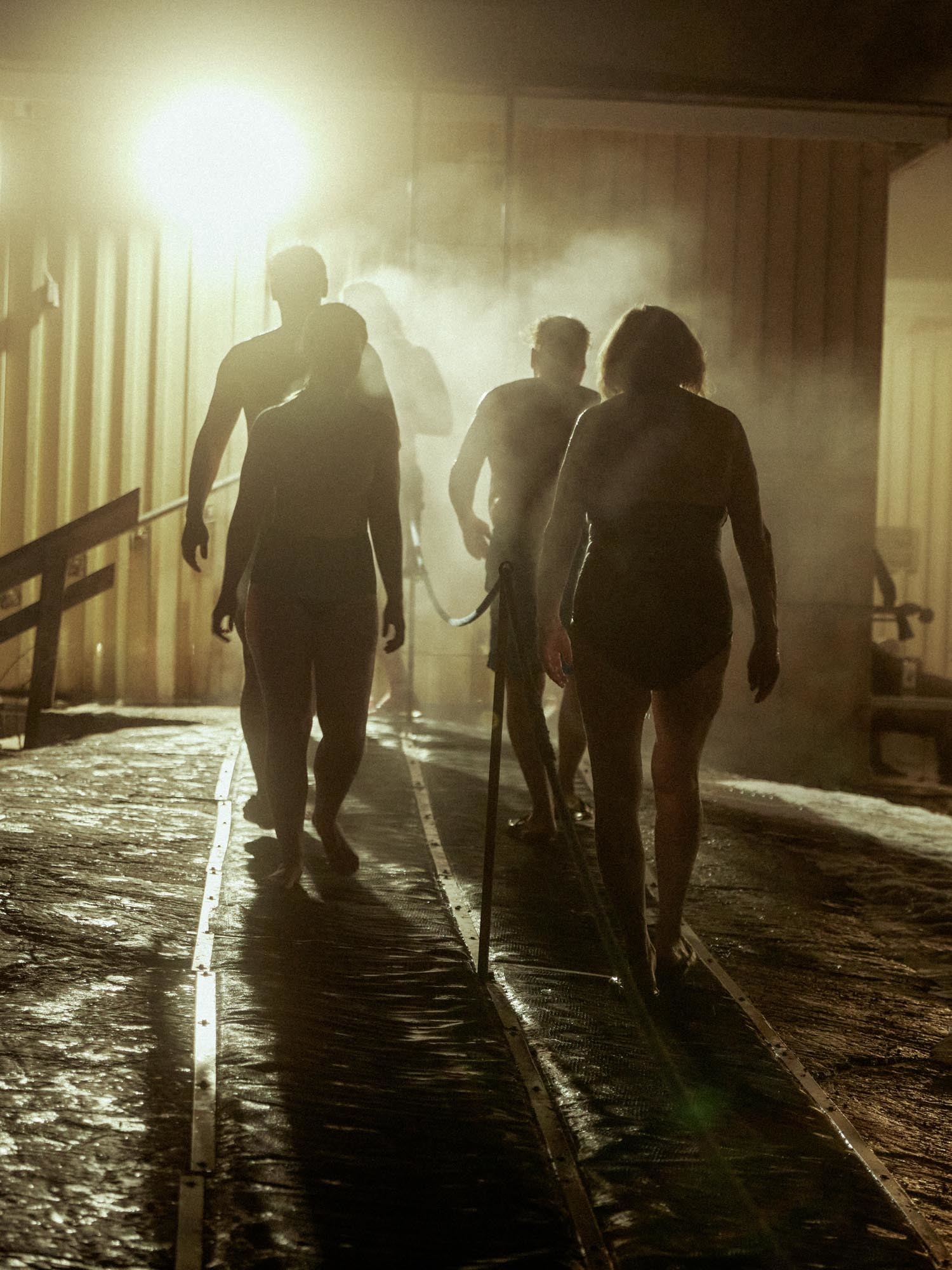 Last time I checked, the outside air temperature was hovering around minus eight Celsius but initially it feels like a gust of warm air. Walking away from the pool, the skin tightens as if it’s frozen and the surface is about to crack into pieces. I follow a group into the sauna, whose skin is steaming demonically in the sub-zero night air. I sit down inside and look up at the temperature gauge hovering just above a hundred but I can’t feel the heat just yet. I wonder if this is the moment when you’re most at risk of a heart attack.