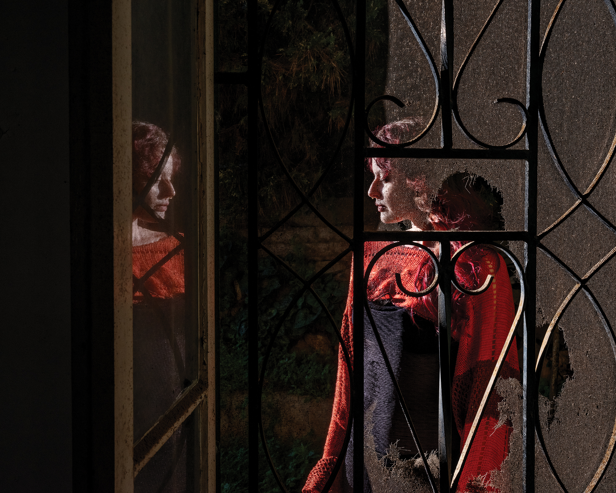 Matar points to a portrait of a young woman standing barefoot in broken glass, surrounded by shattered windows that have yet to be rebuilt. “She said it was a closure to a traumatic experience, and the next day she got a tattoo of broken glass.” Matar says. “I completely give them agency over the process. I would never ask somebody to take off their clothes or step in glass. They’re like my daughters.”