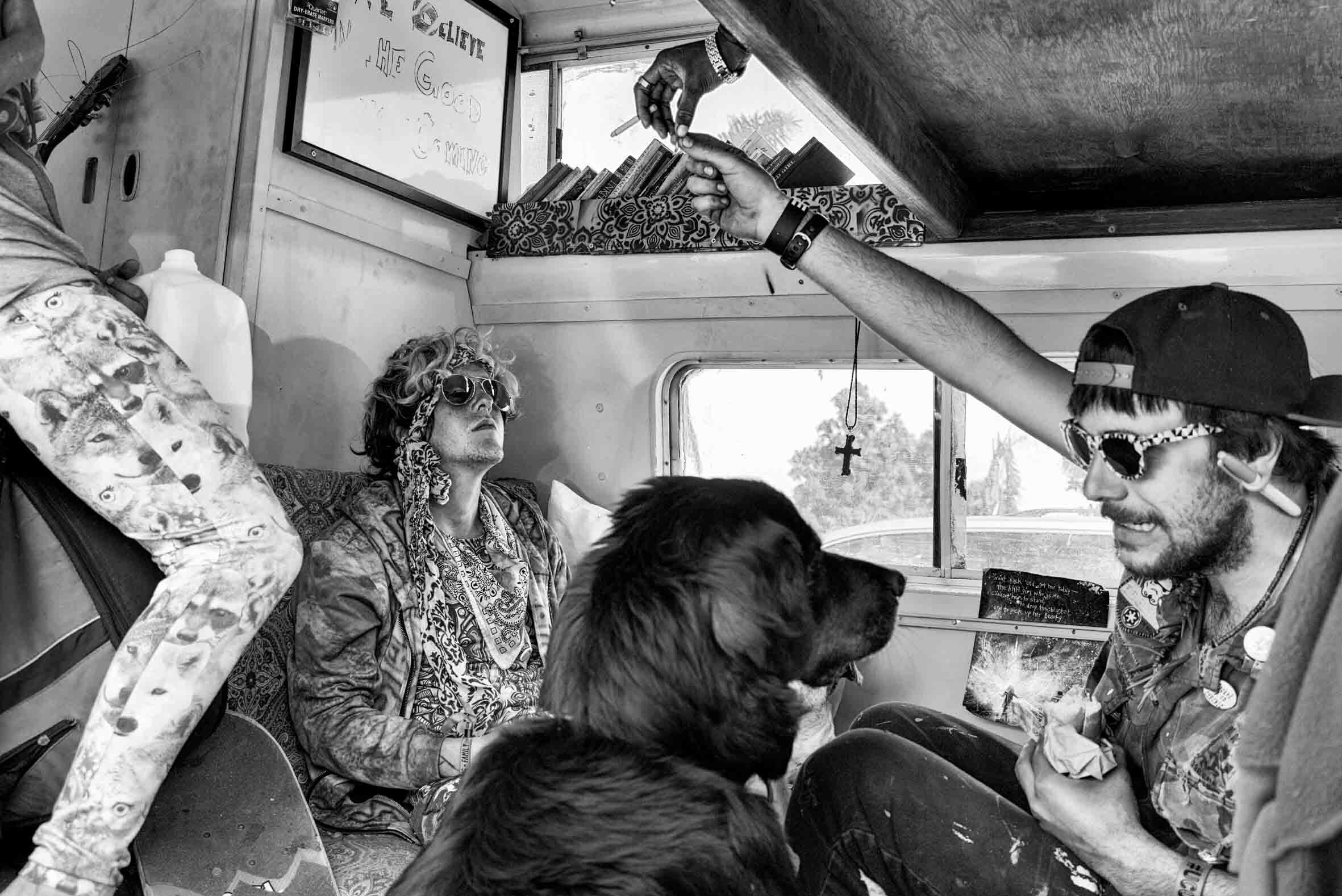 “They were all like 16 or 17, probably runaways, and I befriended them,” Saguy says. “They were playing in the rain and then I got invited into their van with all the dogs and people, and one of them had pants with dogs on them. It was a surreal experience – like travelling to another world.”