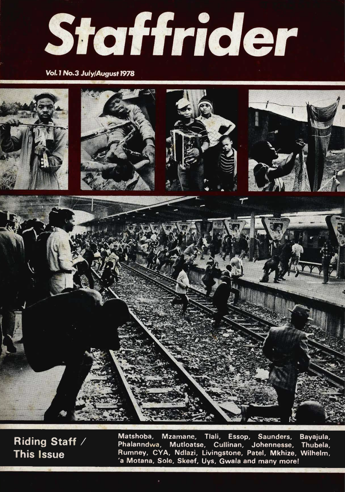 The magazine’s name came from a slang word referring to the ticket-less young men who clung to the sides of the roof of overcrowded, segregated trains that travelled between townships and city centres. It alludes to the everyday necessity of “the commute” for South African workers who were barred from living in white areas, and even more poignantly, to the rebels who refused to comply with expectation. According to Oliphant, a “Staffrider is a daredevil who defies convention, who transgresses the imposition of a particular system.”