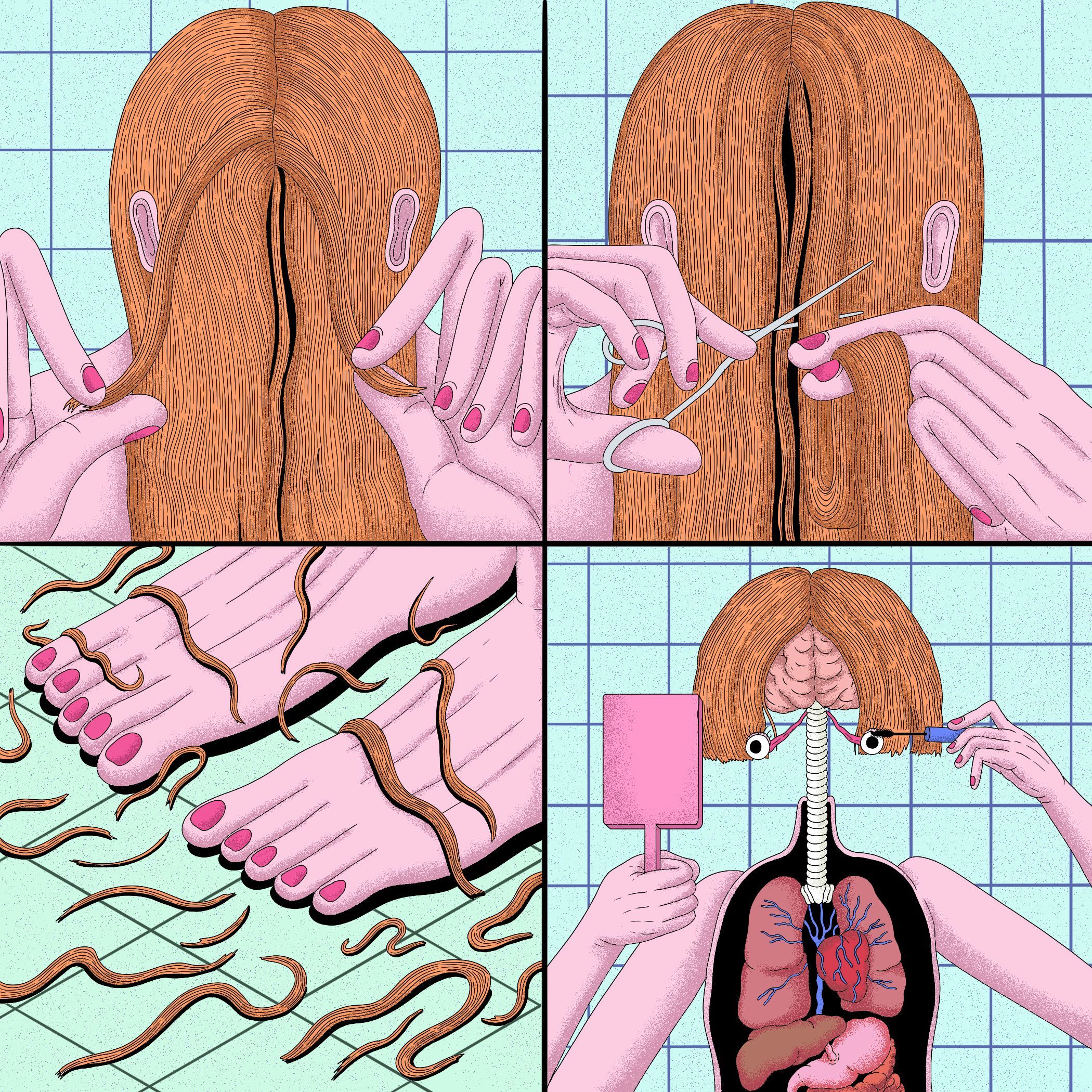 For instance: in one, a sentient treadmill cackles as it swallows its panting user. In another, a grotesque slug creature patiently observes a wellness tutorial on YouTube. Elsewhere, a kid jams a joint into his nostril and inhales, only for a gang of floating mouths to appear – grinning – and whisper nasties behind him. And they’re some of the more conventional ones.