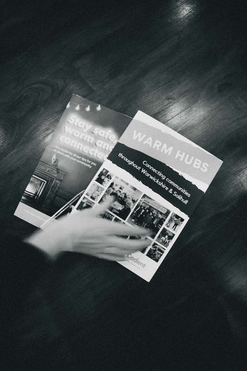 “Cut up food into smaller pieces to cook quickly” and “draught-proofing can save £20 per year on your energy bills” are two of many tips that appear on a leaflet on how to cut energy usage this winter. The greyish blurs across pixelated words indicate this leaflet has been photocopied many times. The slightly skewing alignment of the text points to a rush job, which would make sense. There are piles of them available at Royal Shakespeare Company’s The Other Place in Stratford-upon-Avon – a theatre and café space mostly used for workshops and conferences that, once a week, transforms into a “warm bank.”