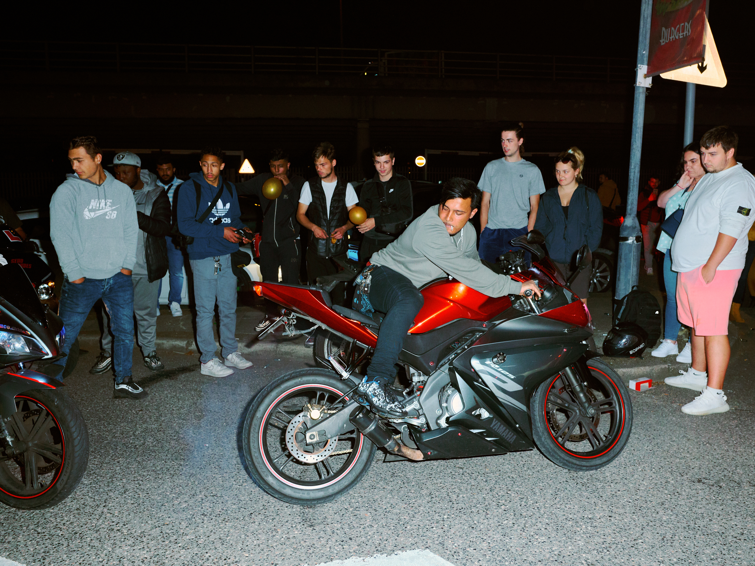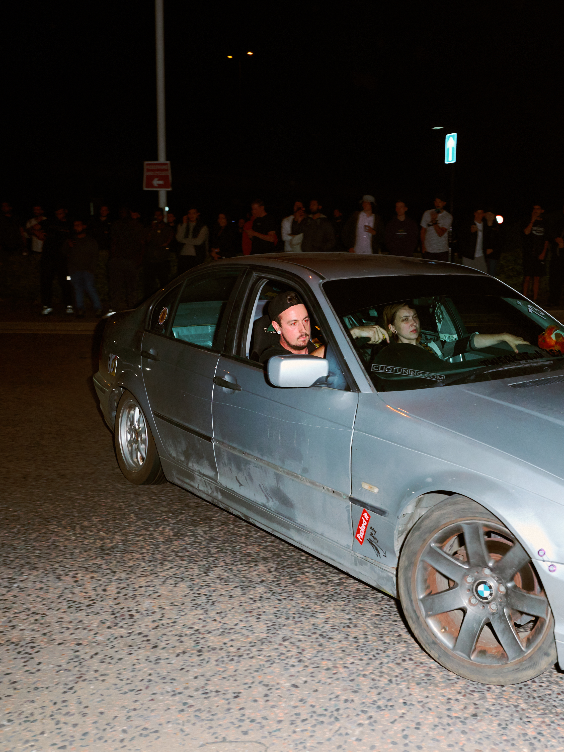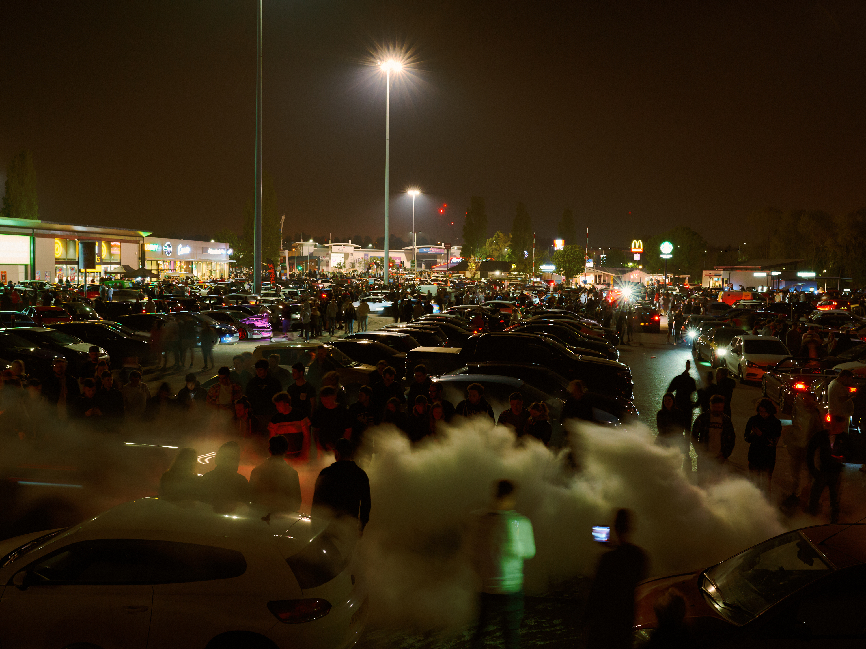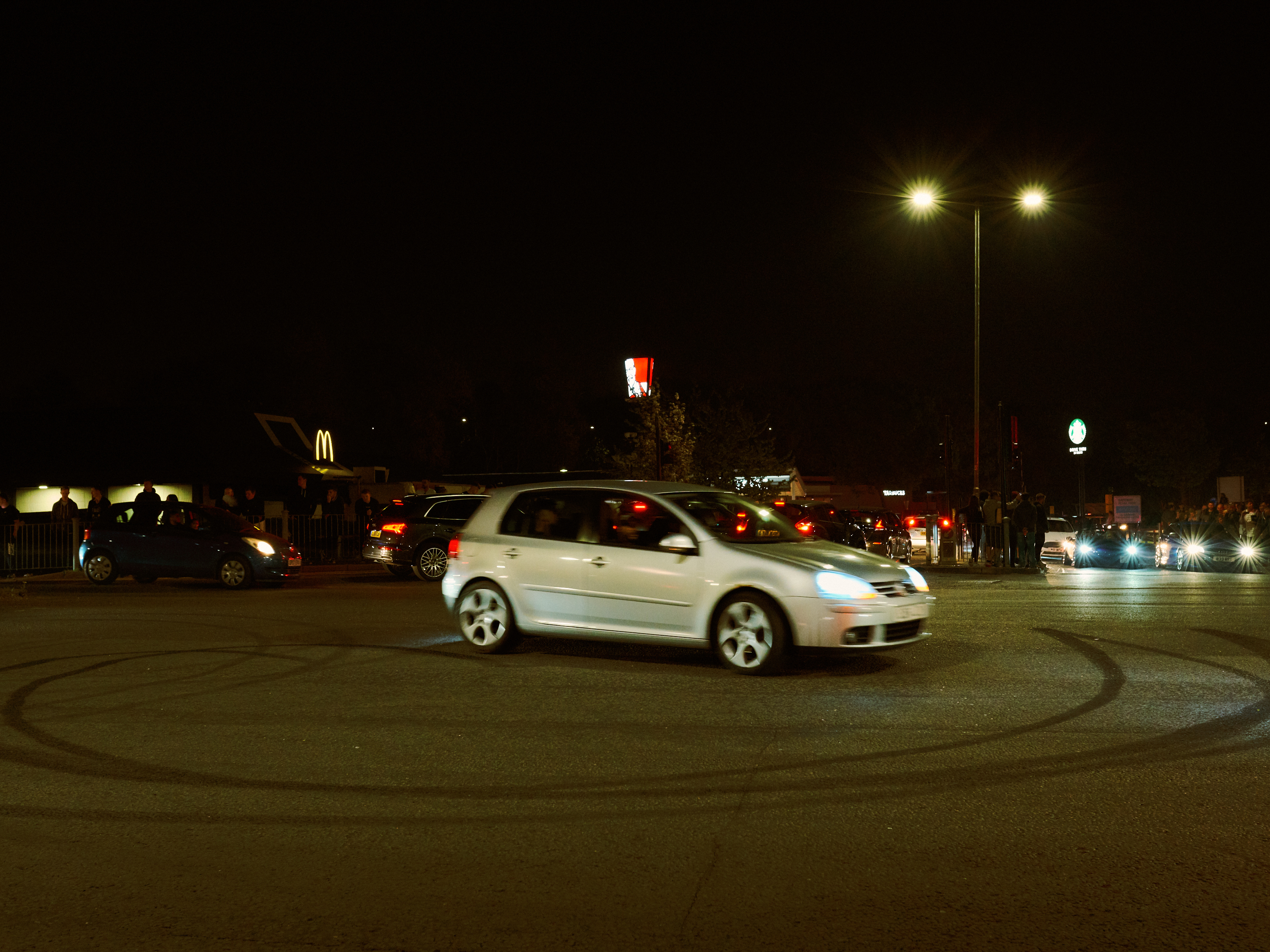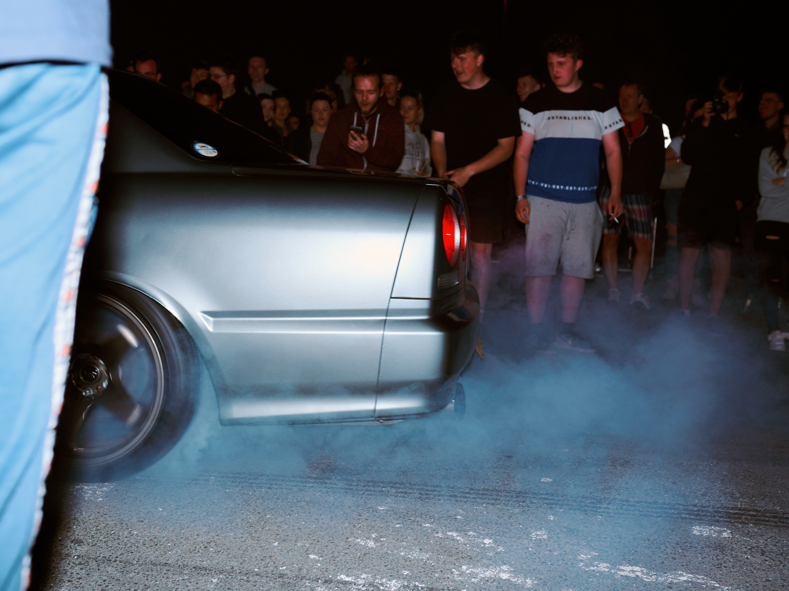 Car meets have been quietly gaining popularity in England. Under the cover of night, hundreds of boy racers gather in deserted industrial estates and remote car parks on the edges of UK cities to rev their engines, spin their wheels and rip donuts. Organised through social media, locations are revealed at the last minute, giving everyone at least a few hours before the police arrive, a new location is chosen, and the cat and mouse chase continues.