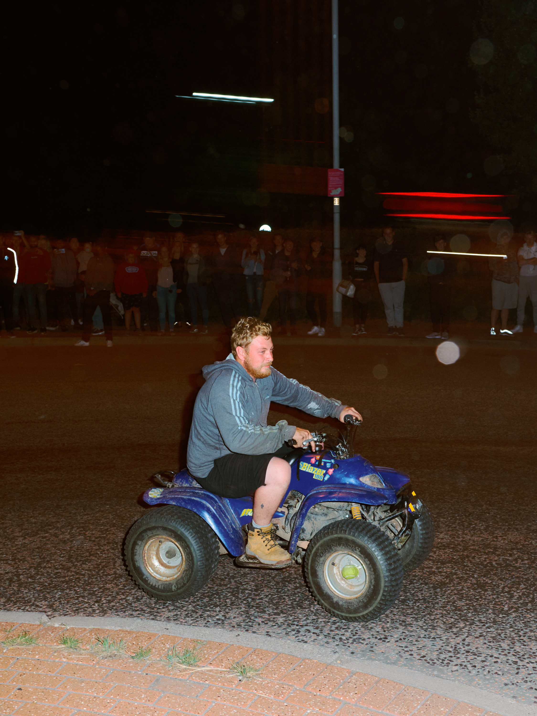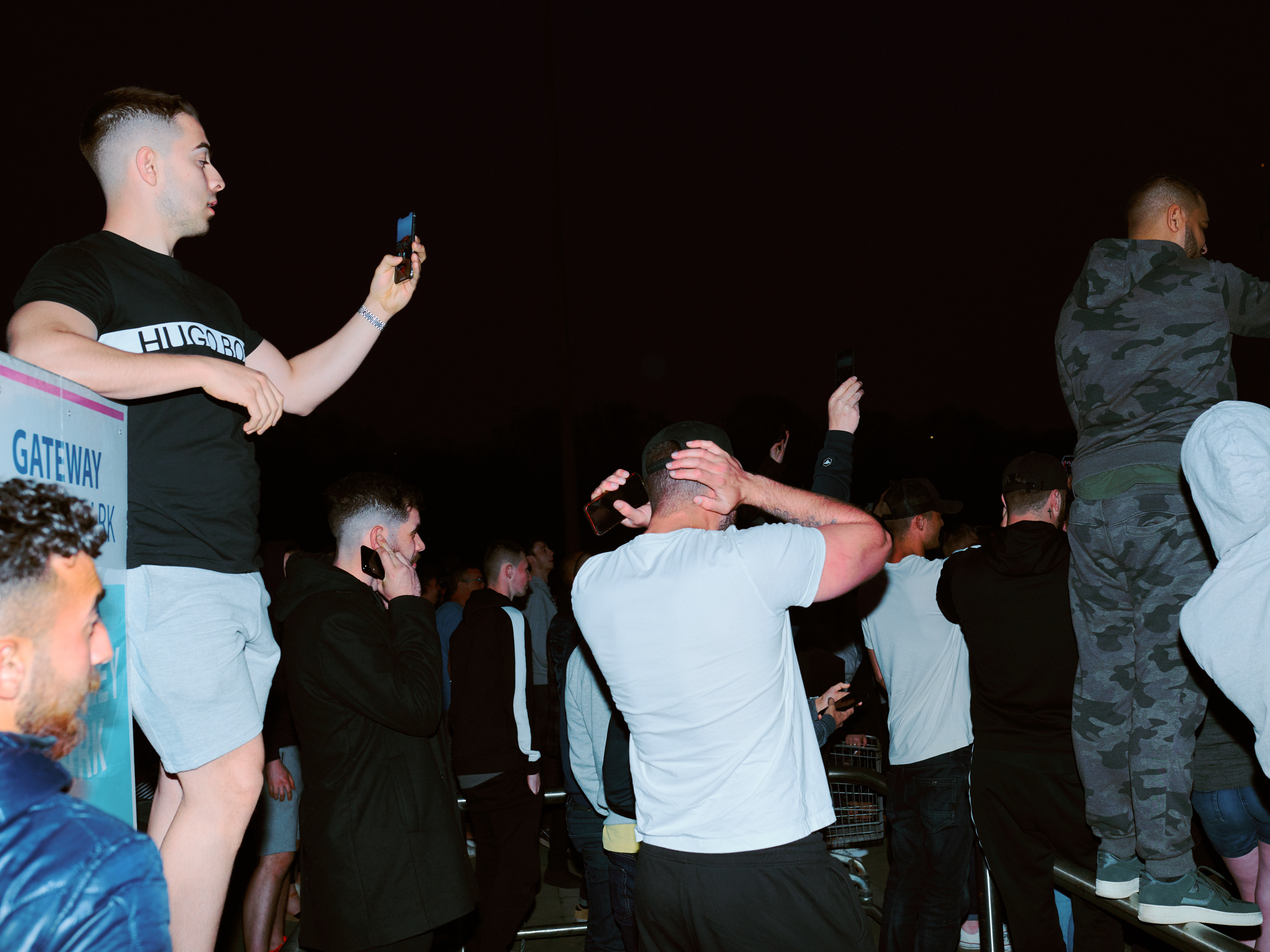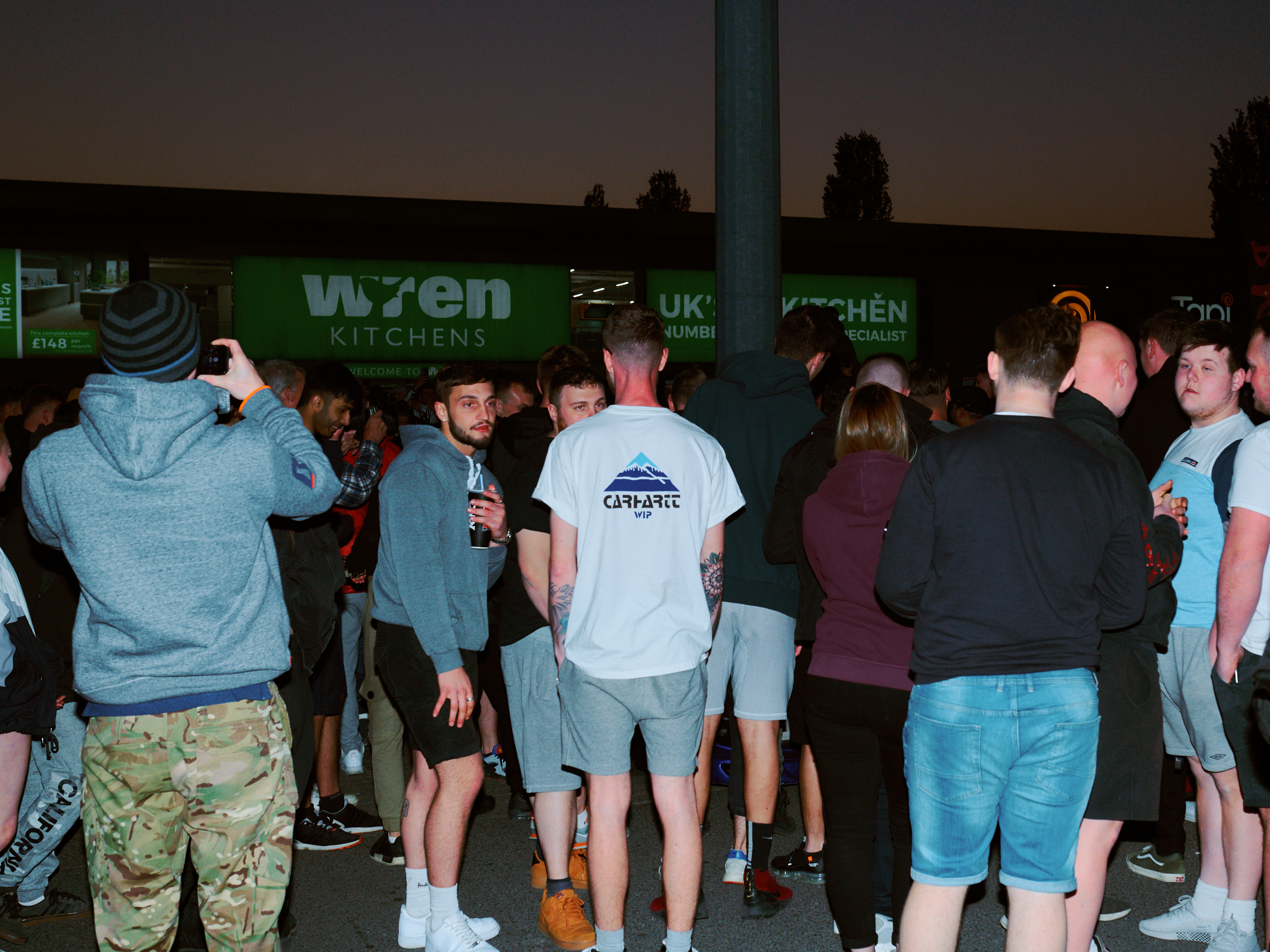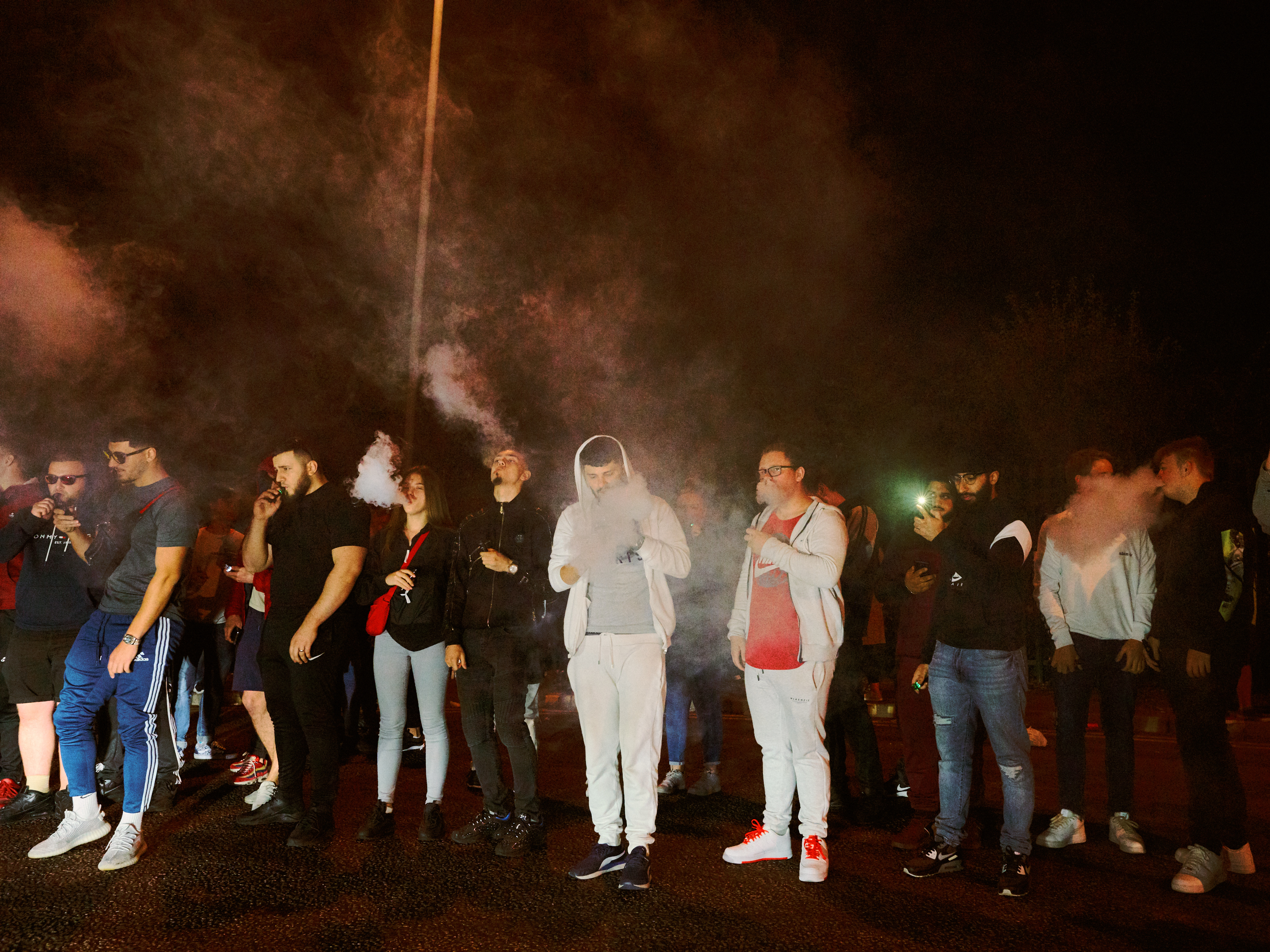 As the night wore on, the police arrived and another location was pinged out on social channels. All the cars moved out in a convoy, eventually arriving at another industrial estate ten minutes down the road. A crowd gathered around the mini-roundabout, cheering as drivers spun donuts faster and faster. The energy became even more frenetic as they pushed their cars harder and harder, performing increasingly daring manoeuvres, rubber, smoke and noise filling the air.