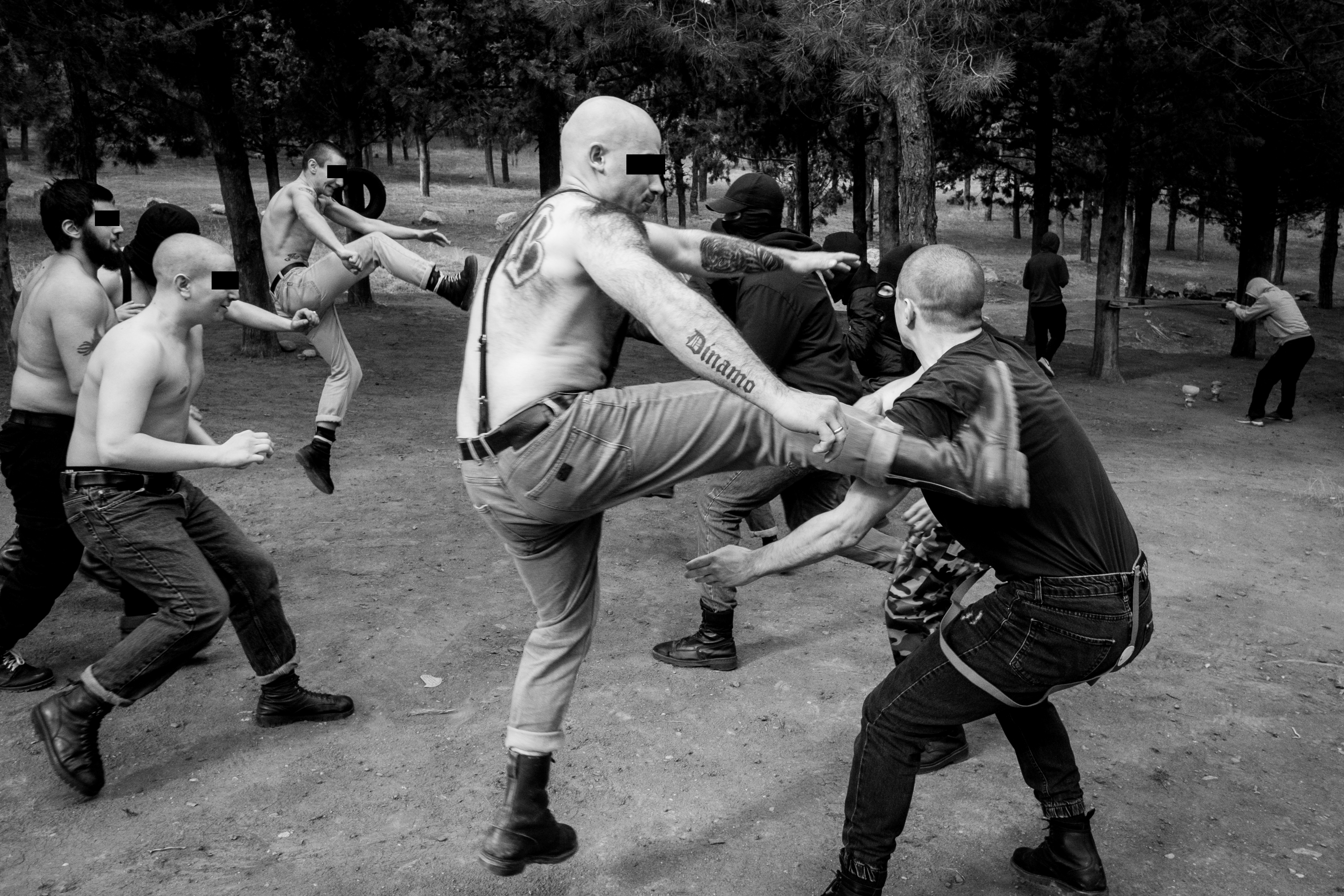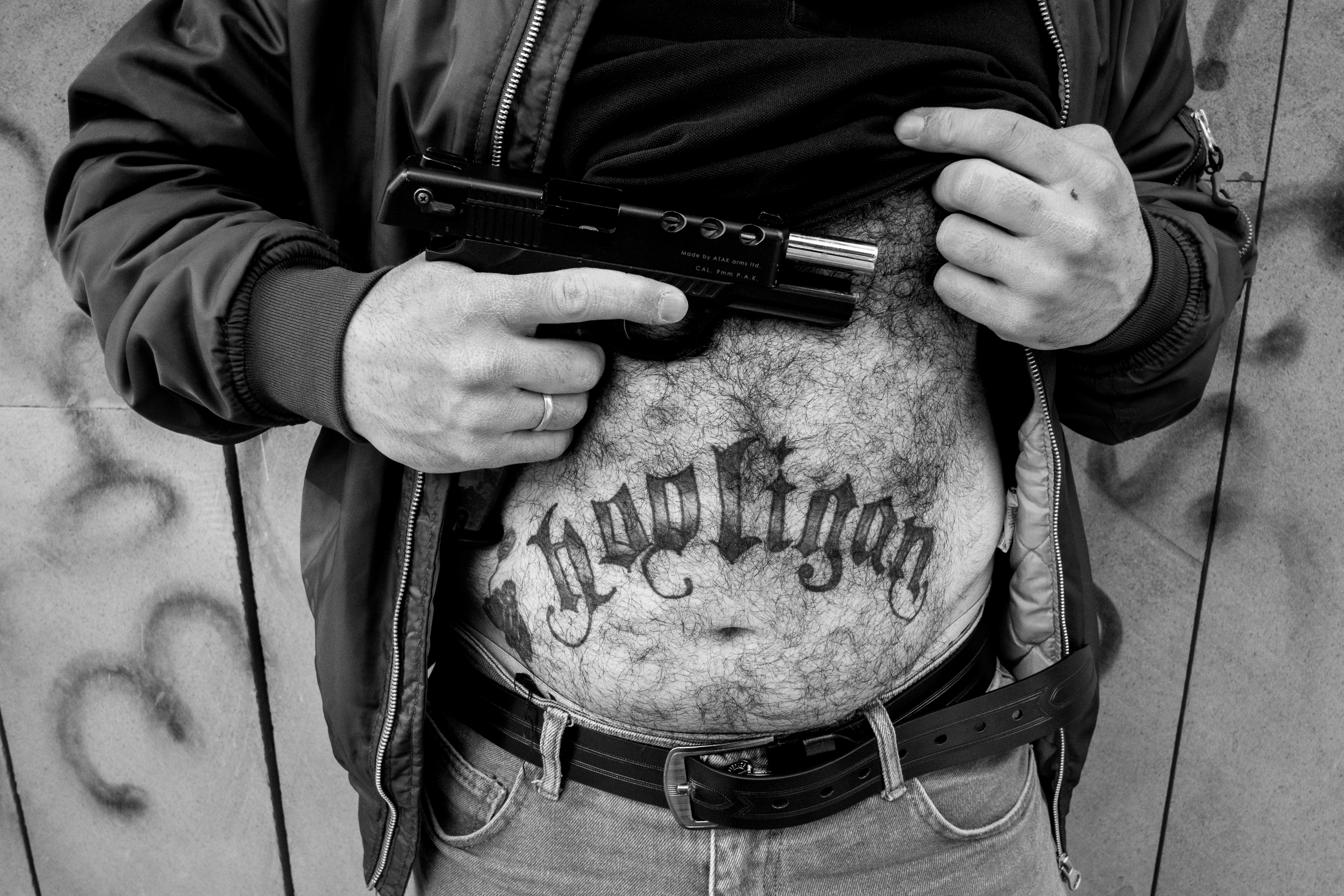 Ultras are associations of hardcore fanatics of football teams across Europe, emerging in 1960s and 1970s Italy. It’s a diverse subculture, with rituals, practices and beliefs differing across fanbases and even within ultras groups, but in the past decades they have become synonymous with far-right politics – and often violence. After seeing the attack in the stands, Bolloten would quickly find out that violence is part and parcel of being an ultra, especially in Elita. After the match, one of the group’s leaders approached him and asked: “What are you doing now? Do you want to come with us?”