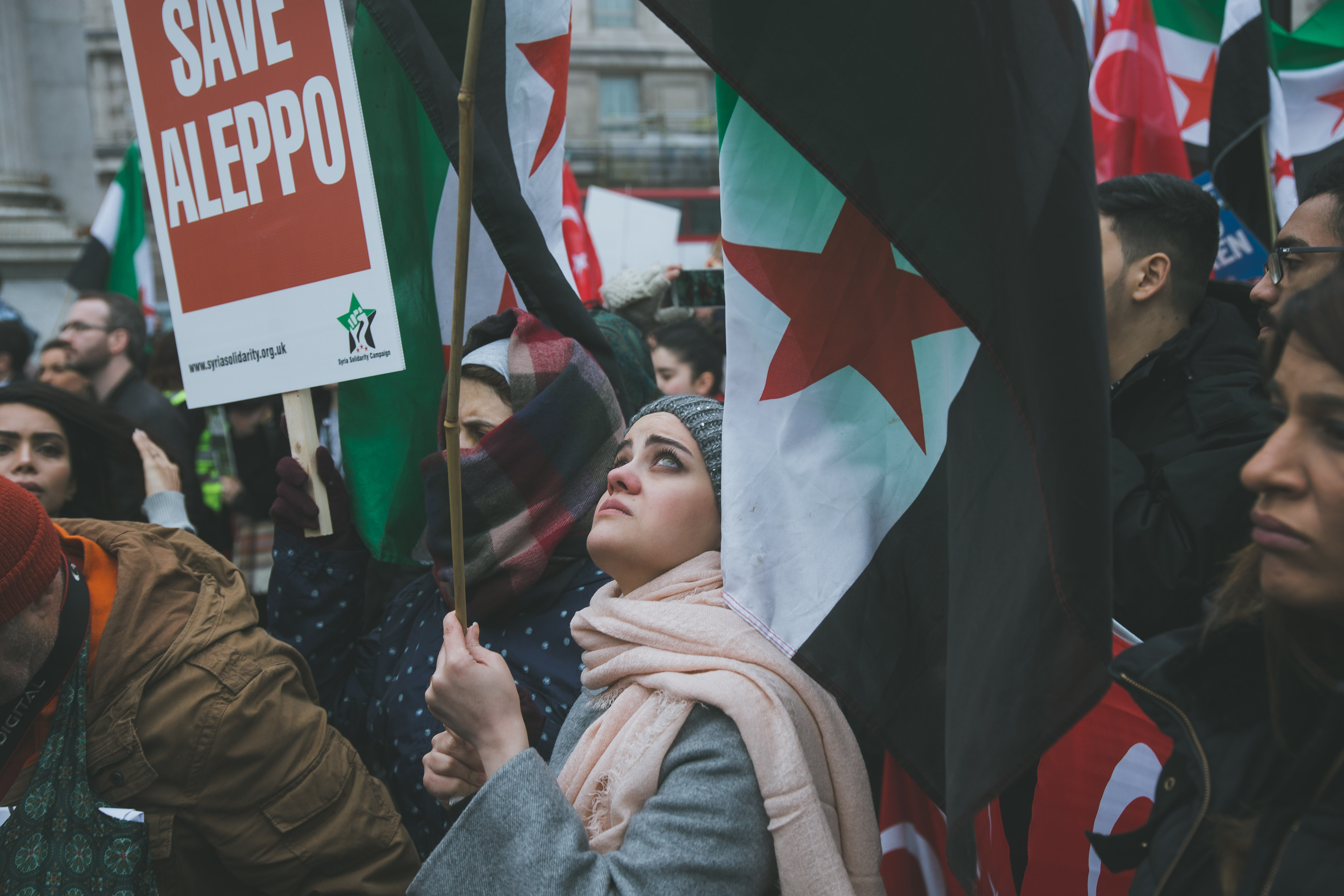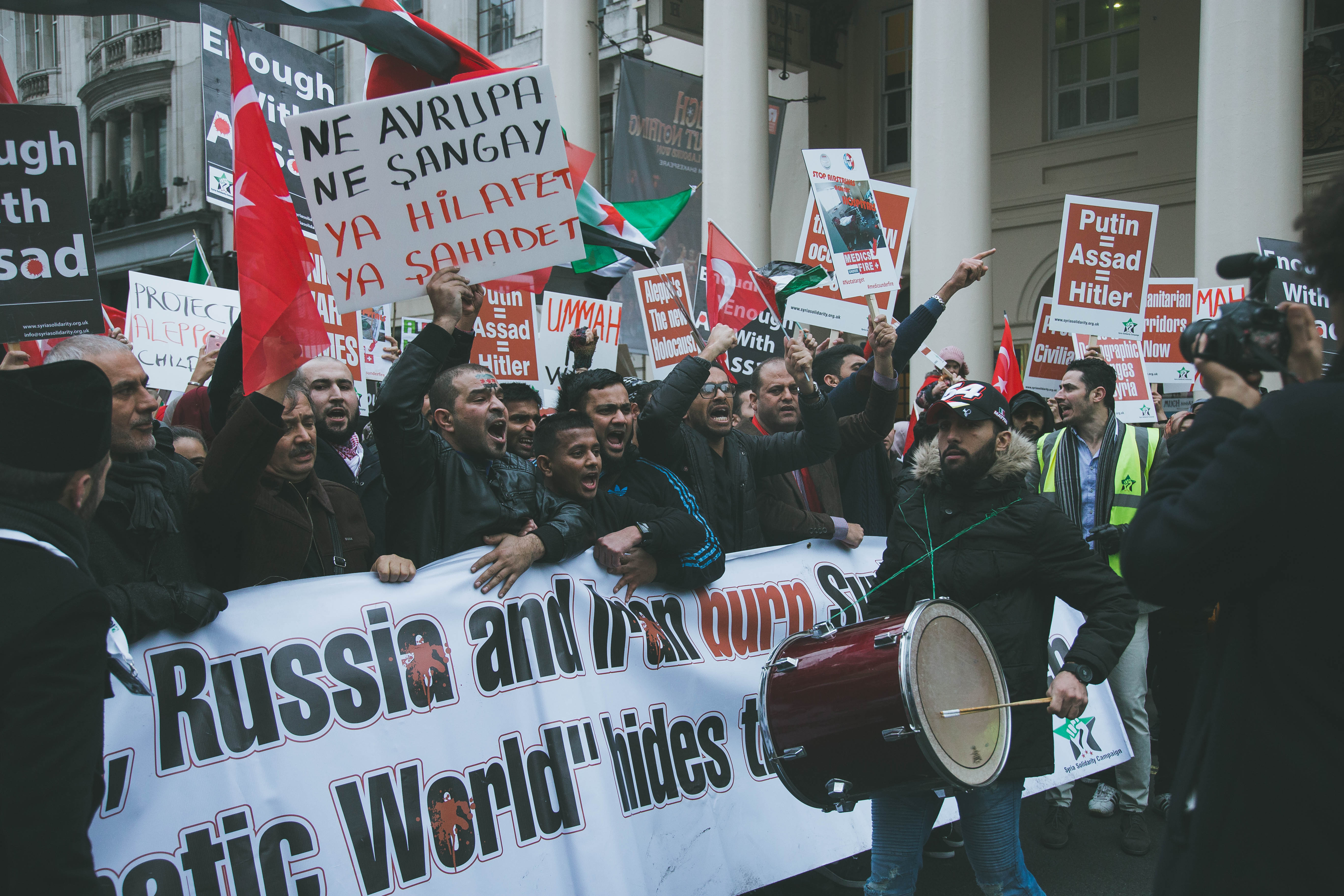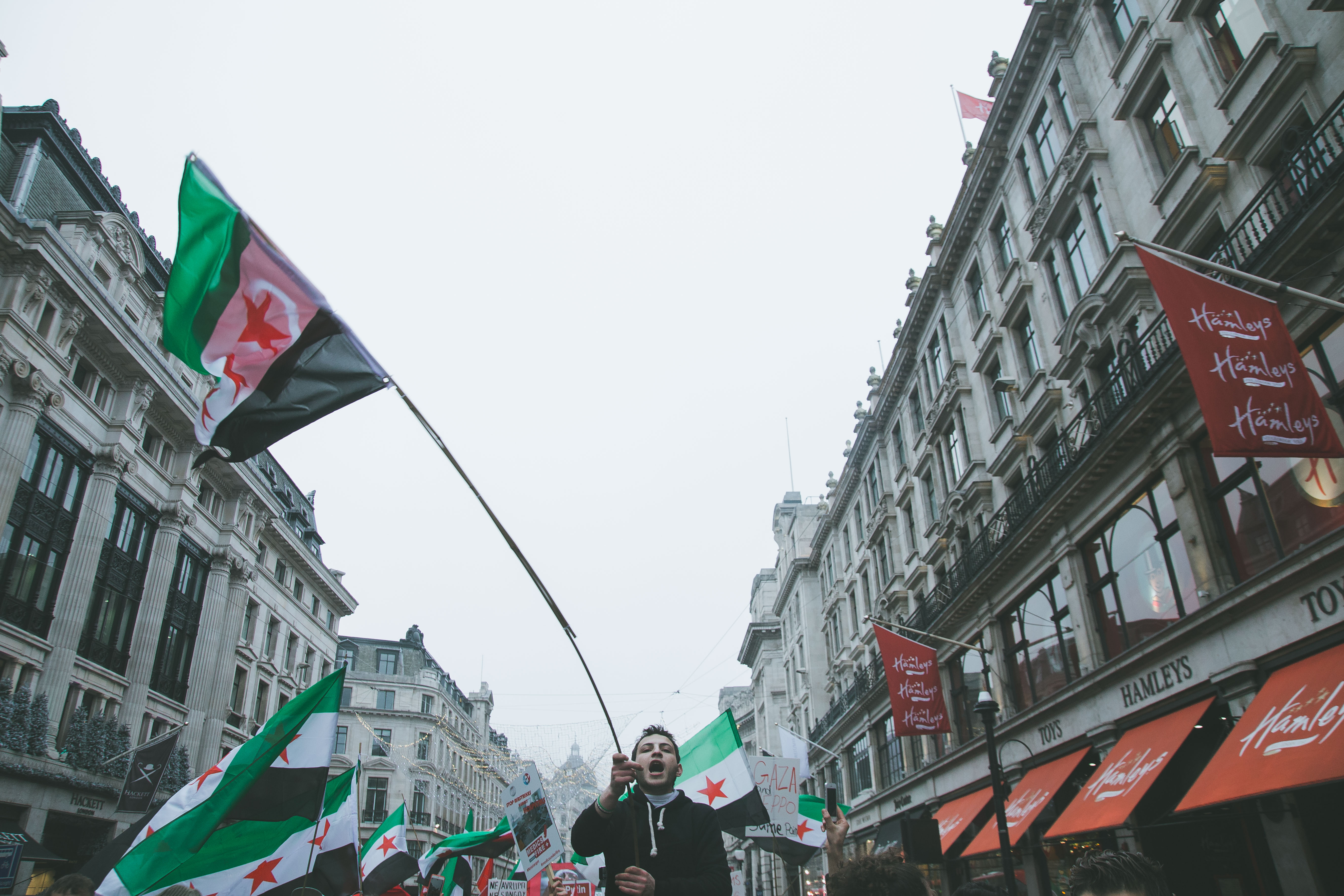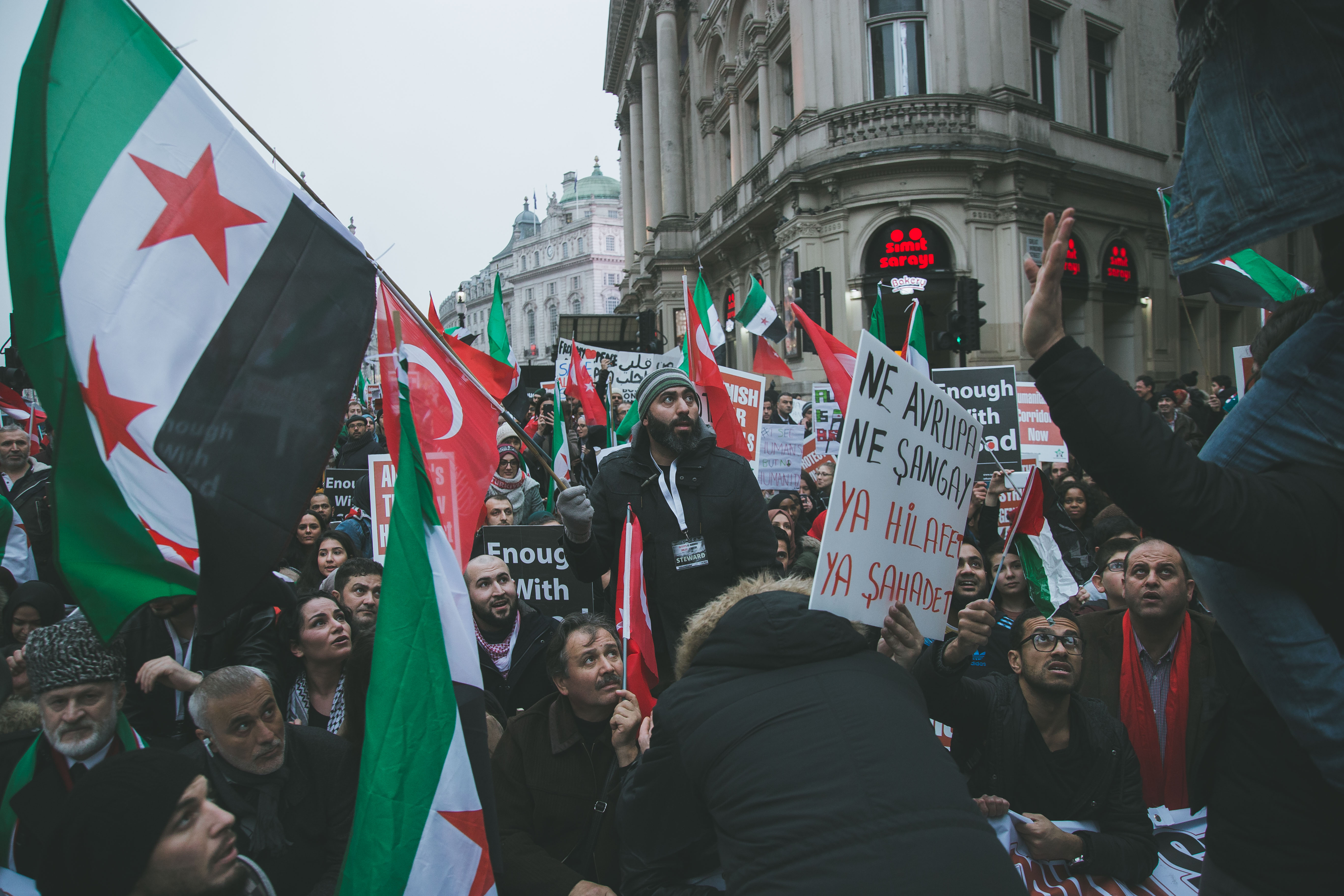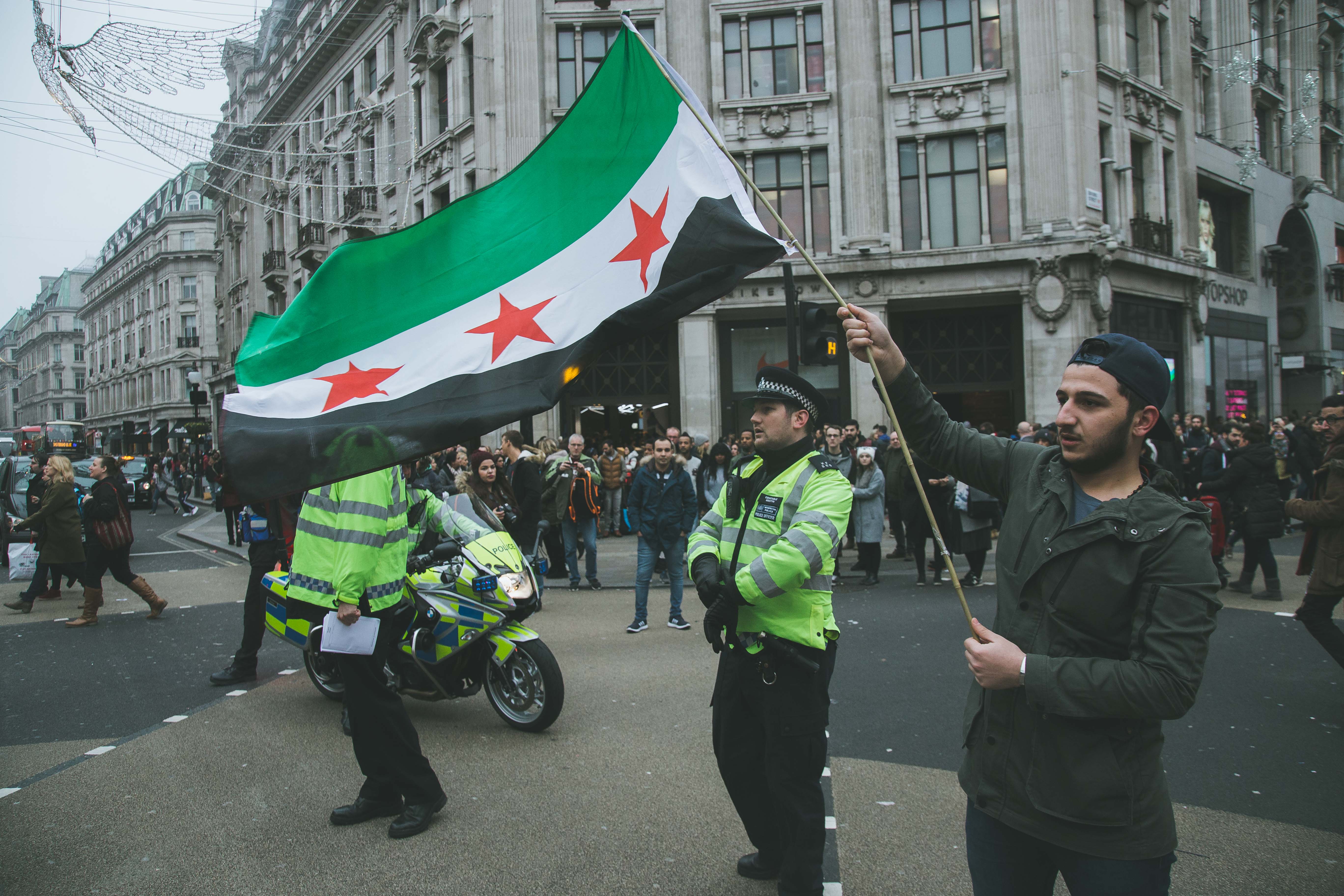 At first glance, the gathering of people at Marble Arch in the December fog could have been mistaken for a logjam of Christmas shoppers. But as the Syrian and Turkish flags and placards alien to your typical Oxford Street Saturday afternoon came into focus, and the chants of ‘While you’re shopping, bombs are dropping’ and ‘Down with Assad’ hit your ears, the reality soon became clear.