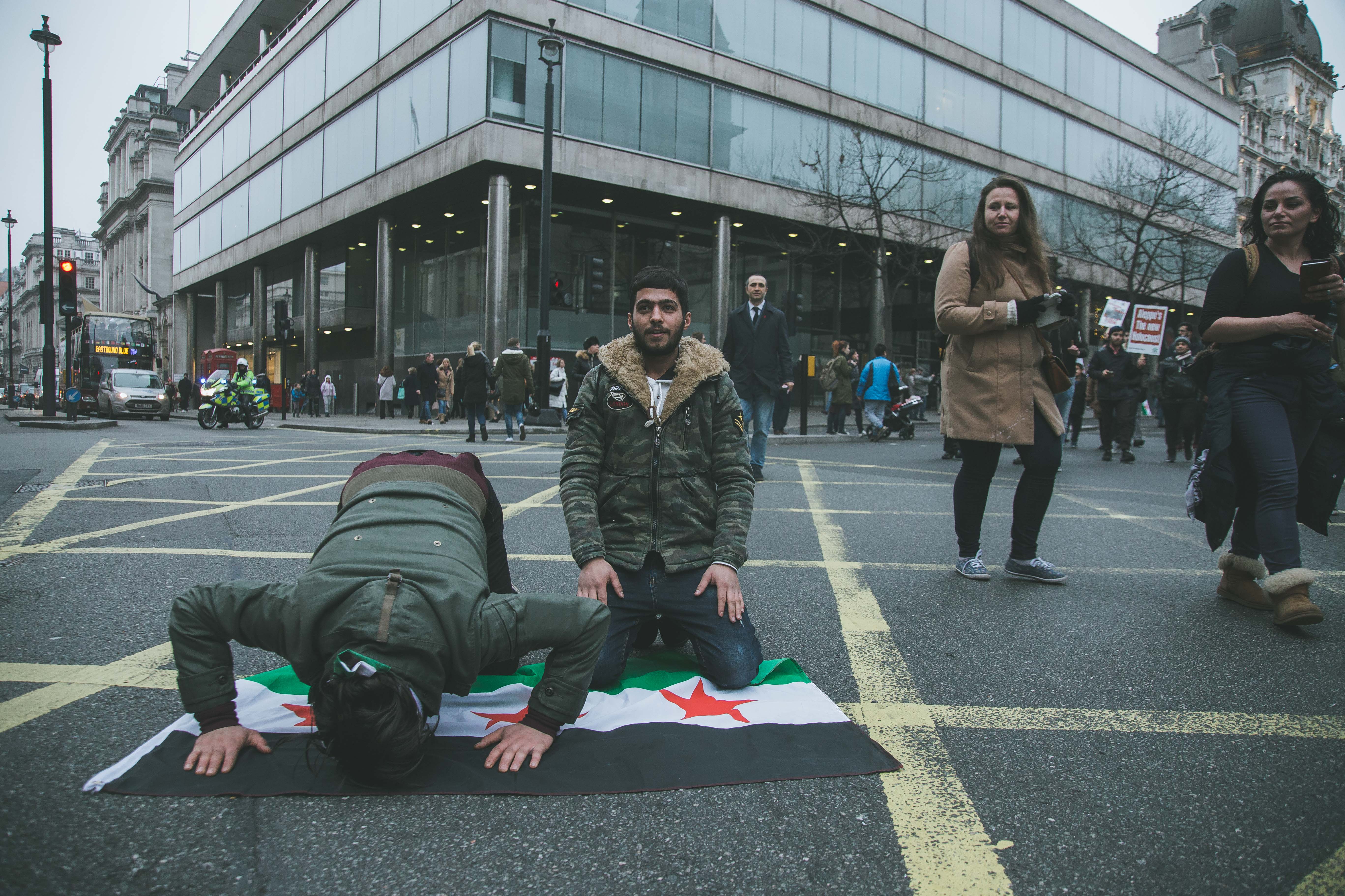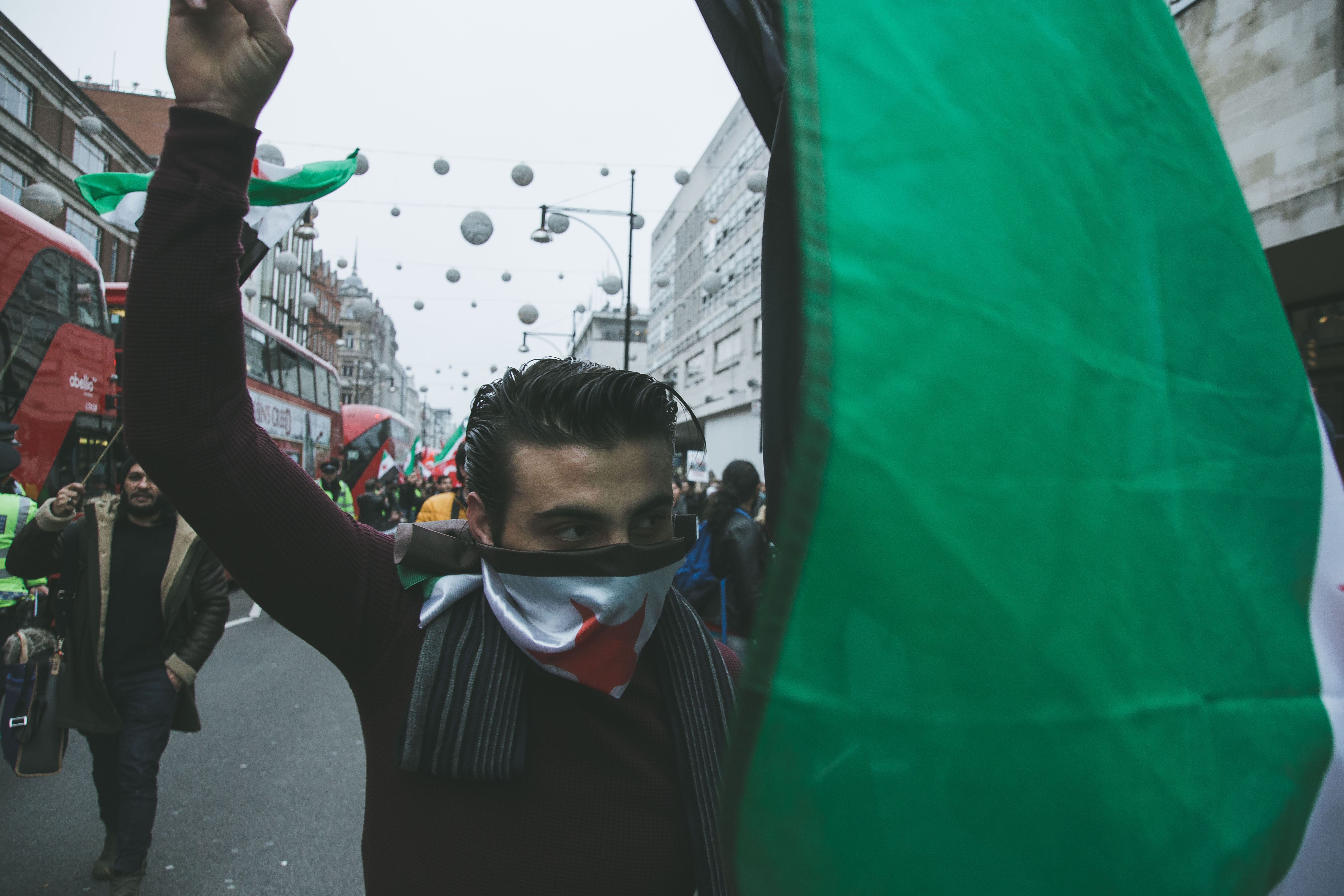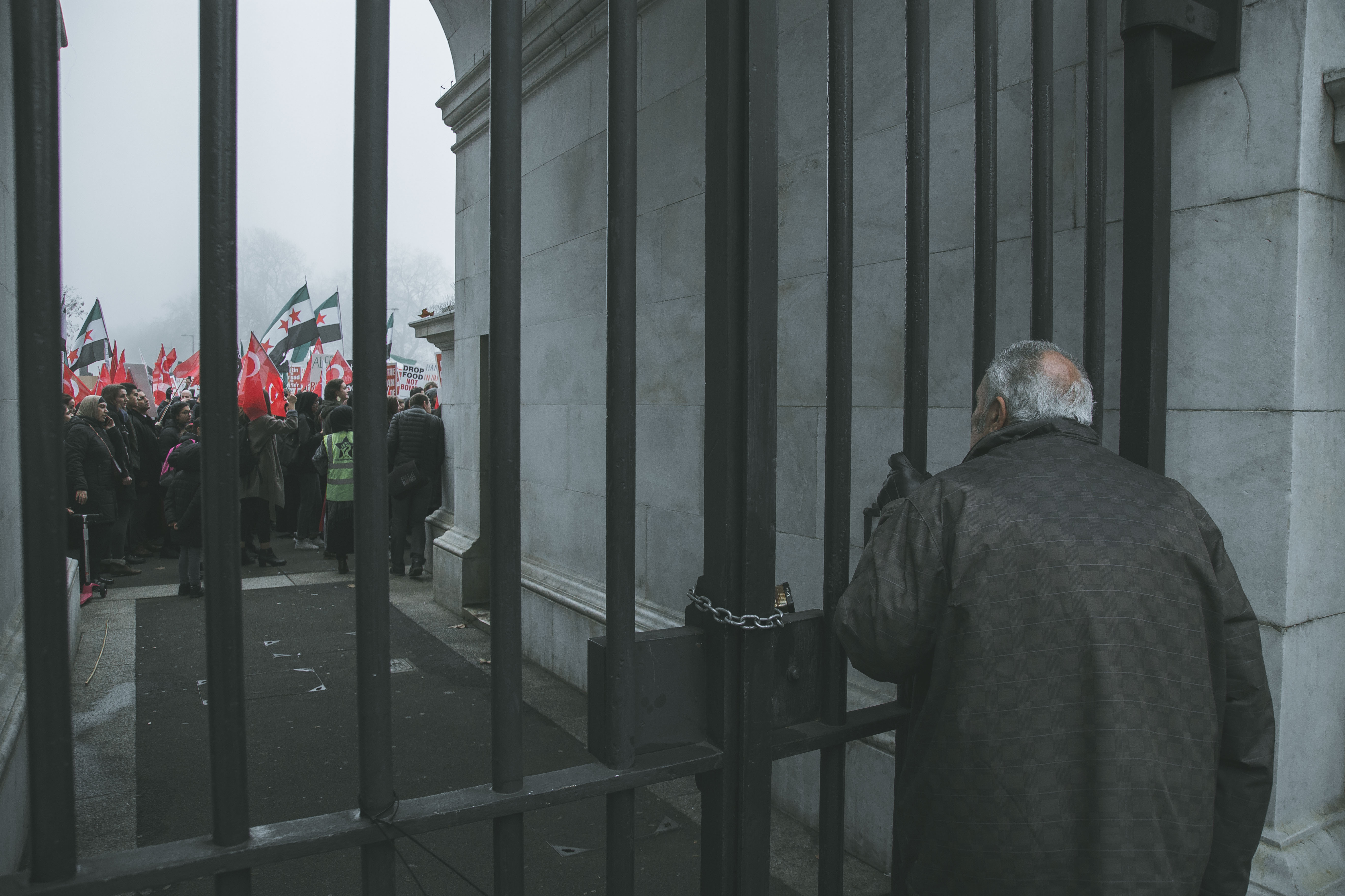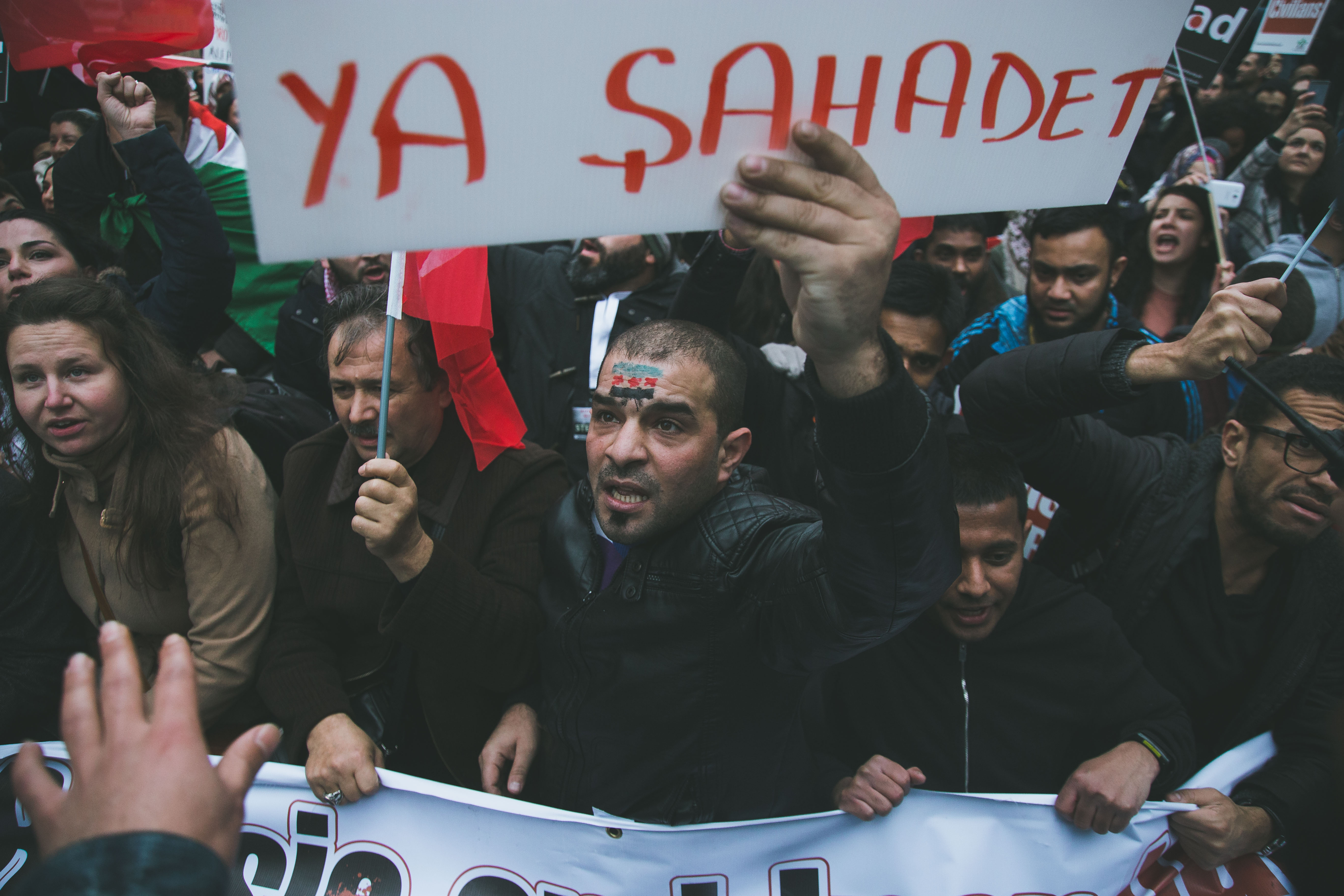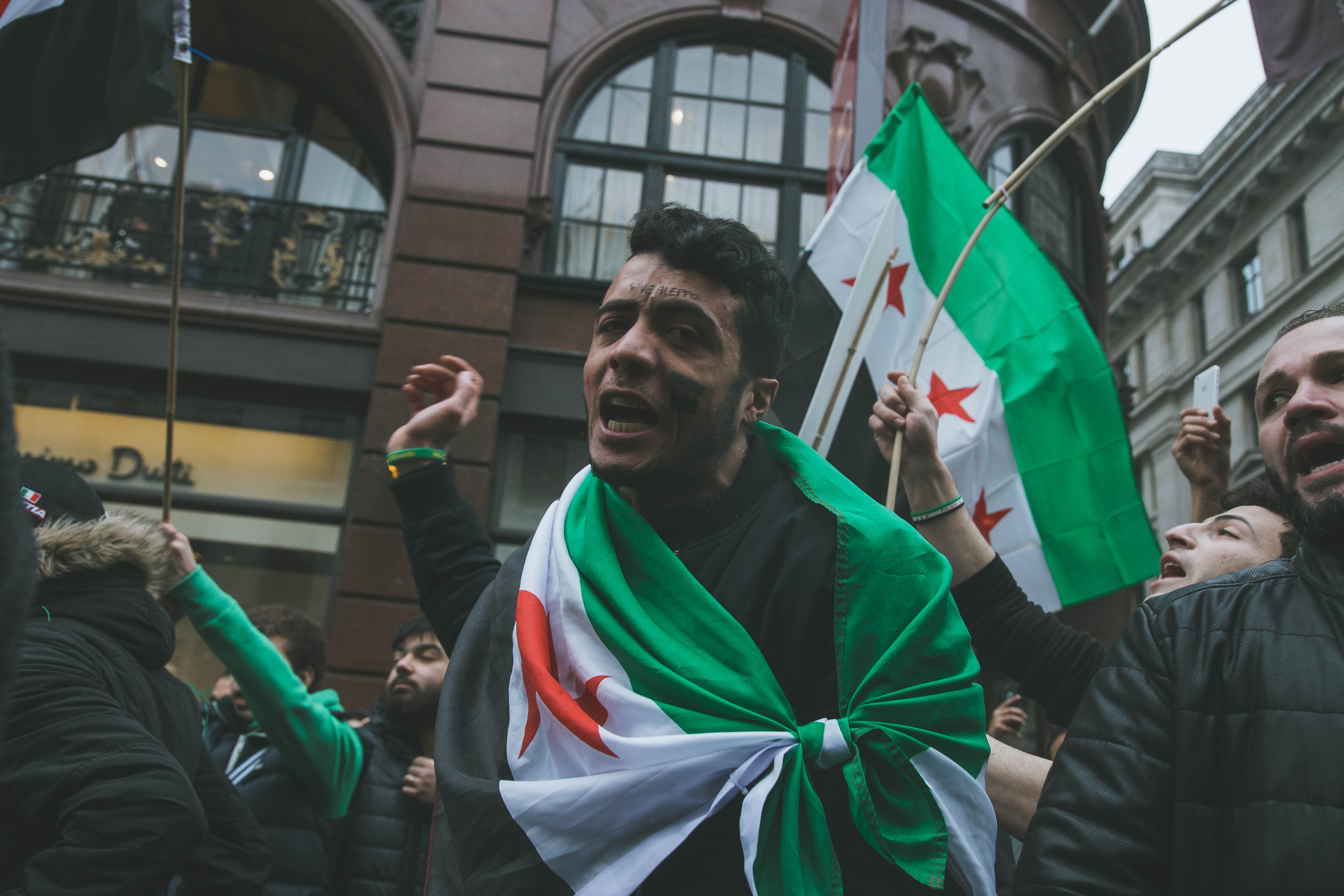 At first glance, the gathering of people at Marble Arch in the December fog could have been mistaken for a logjam of Christmas shoppers. But as the Syrian and Turkish flags and placards alien to your typical Oxford Street Saturday afternoon came into focus, and the chants of ‘While you’re shopping, bombs are dropping’ and ‘Down with Assad’ hit your ears, the reality soon became clear.