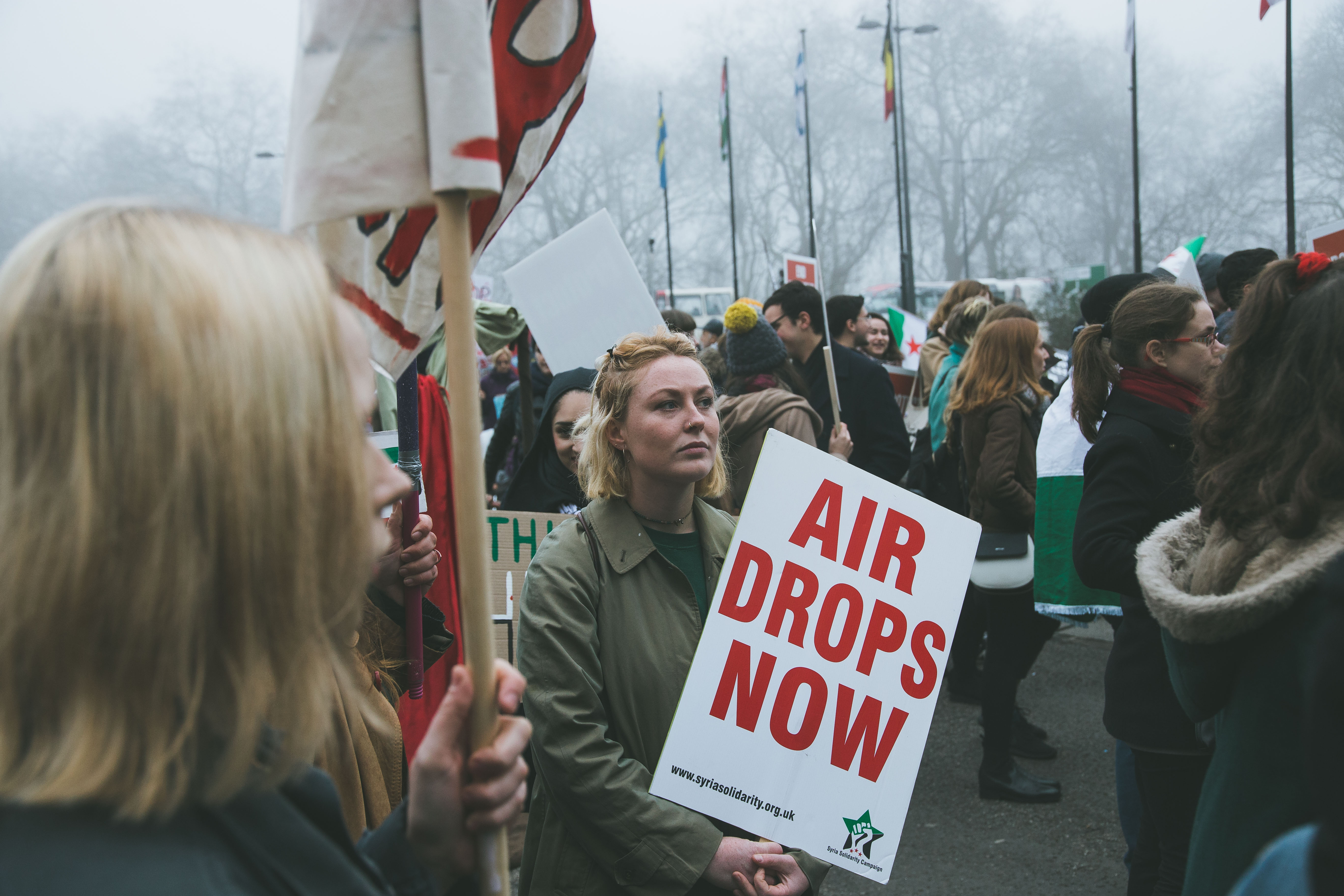 When I asked Lizzie, a British demonstrator, what the government should do she simply looked at her placard and repeated the words. “Air drops,” she says. “They need aid.”