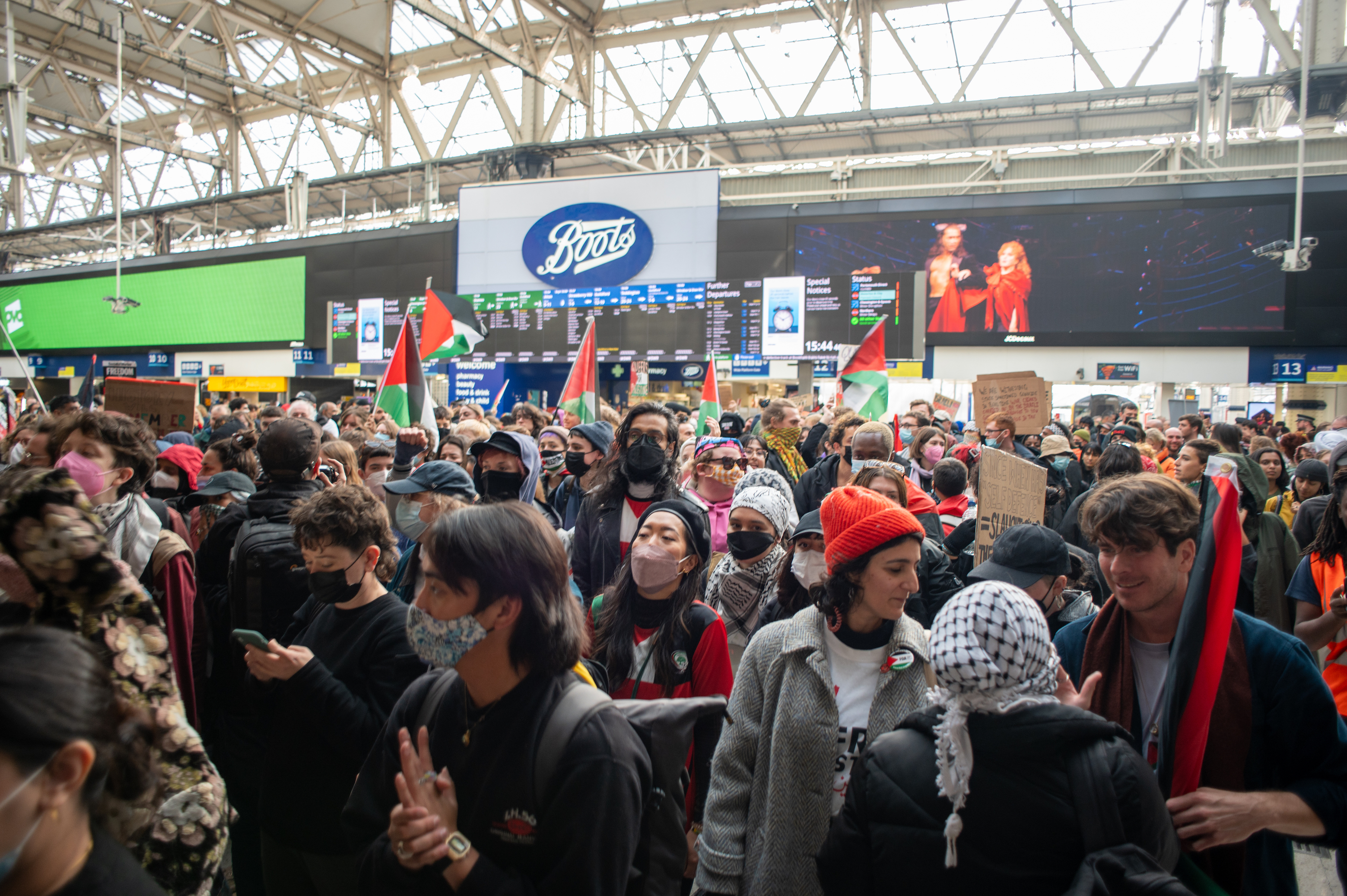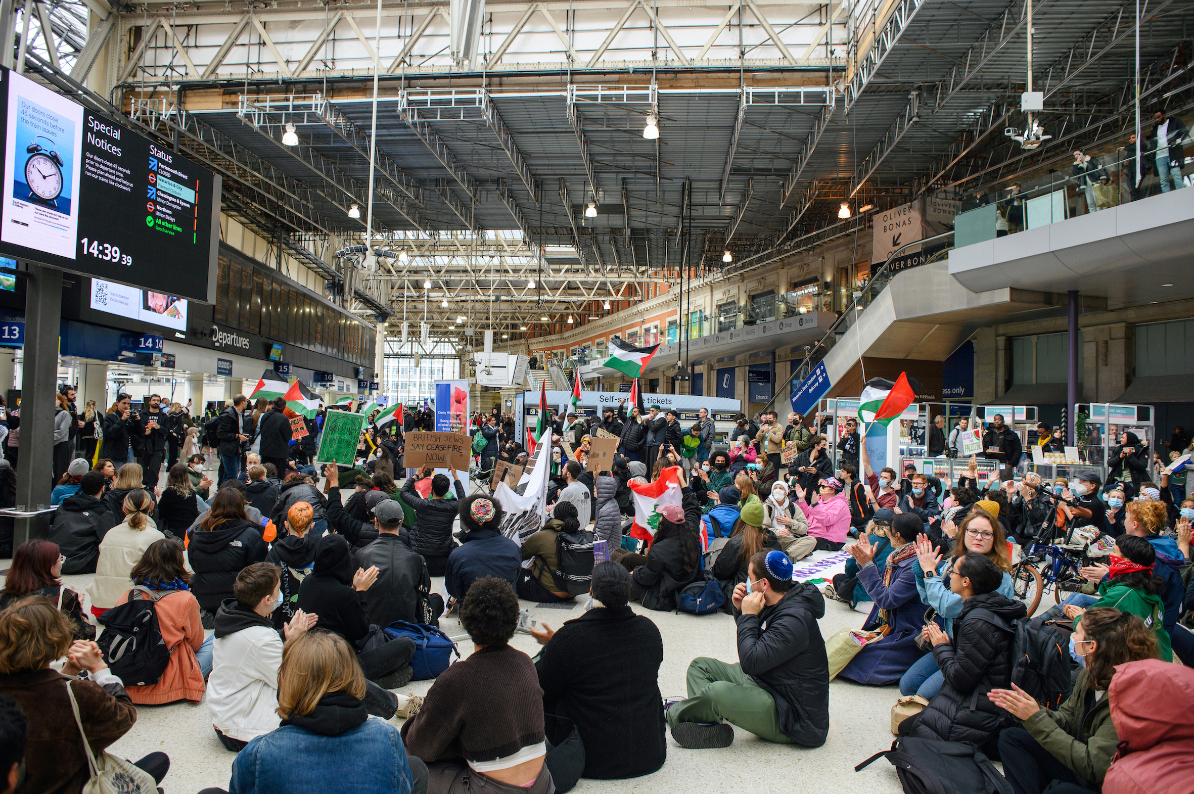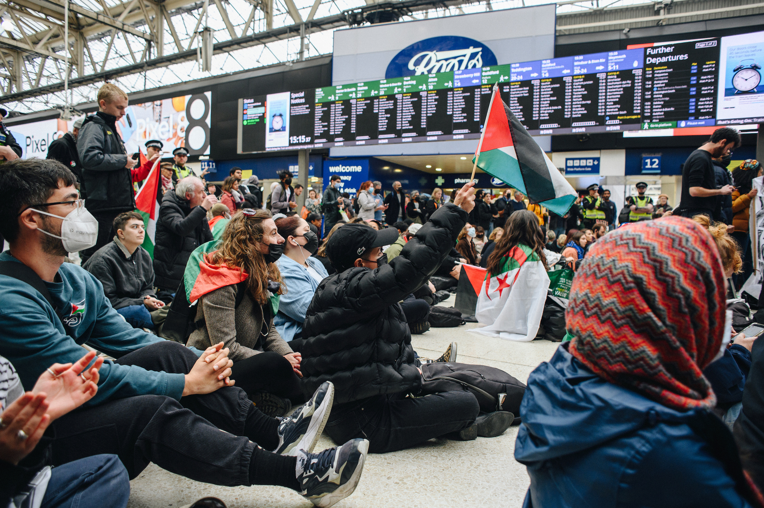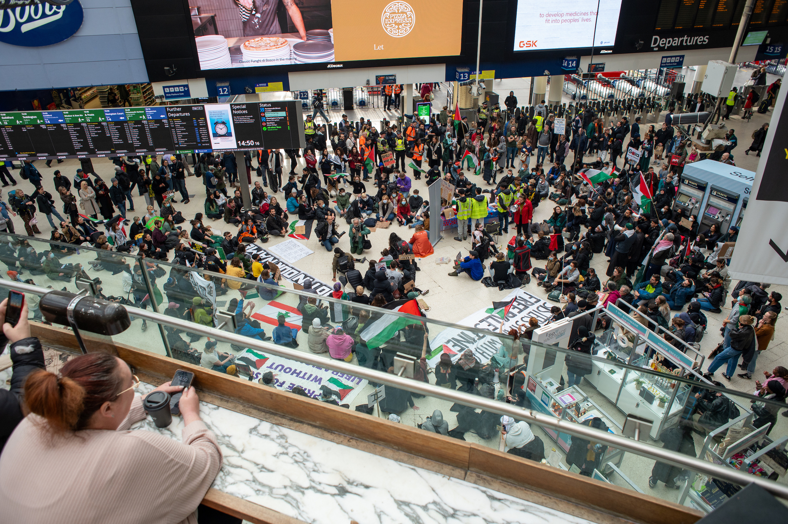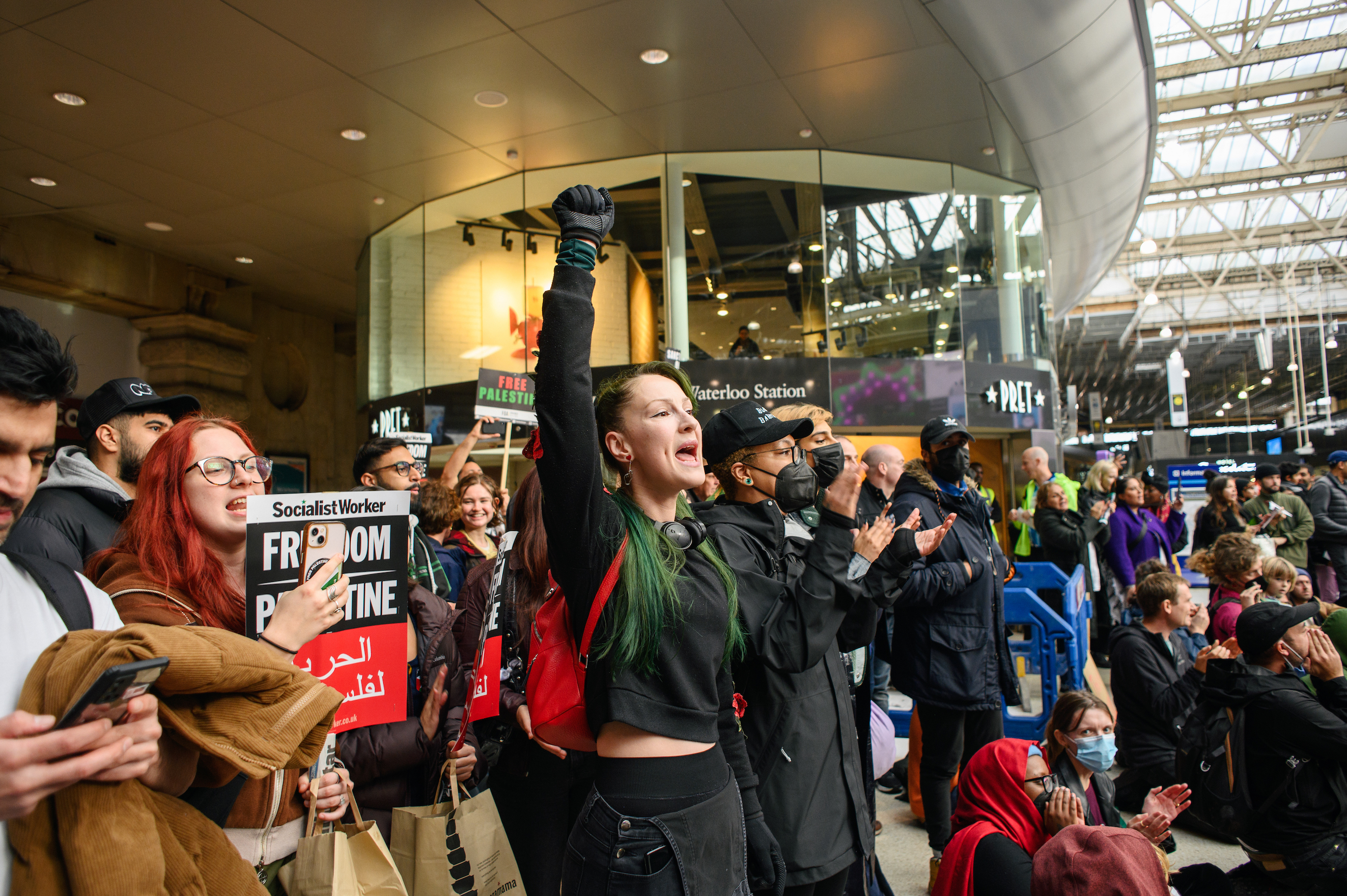 On Saturday, a similar action at London’s Waterloo station took place as the PSC march took place outside. The sit-in, called by activist group Sisters Uncut saw hundreds of activists, including those from groups like Na’amod and Black Jewish Alliance, take part. Those gathered listened to speeches, with organisers tweeting that they faced intimidation from the police. The sit-in ended with no arrests.