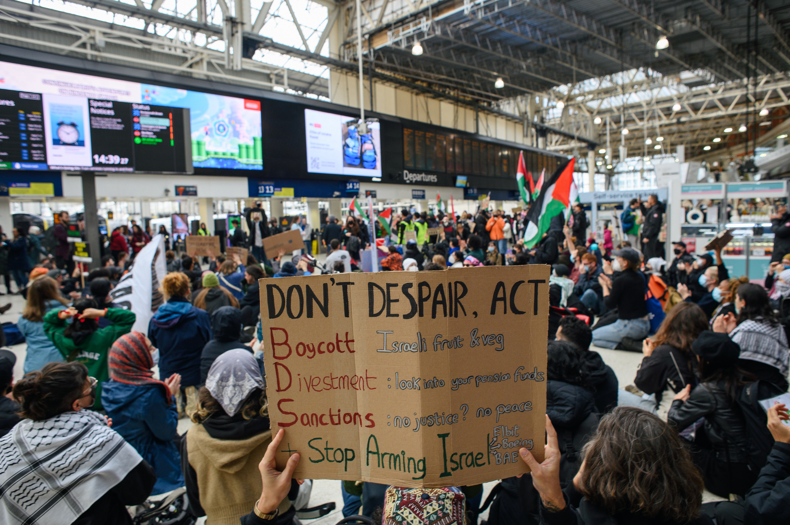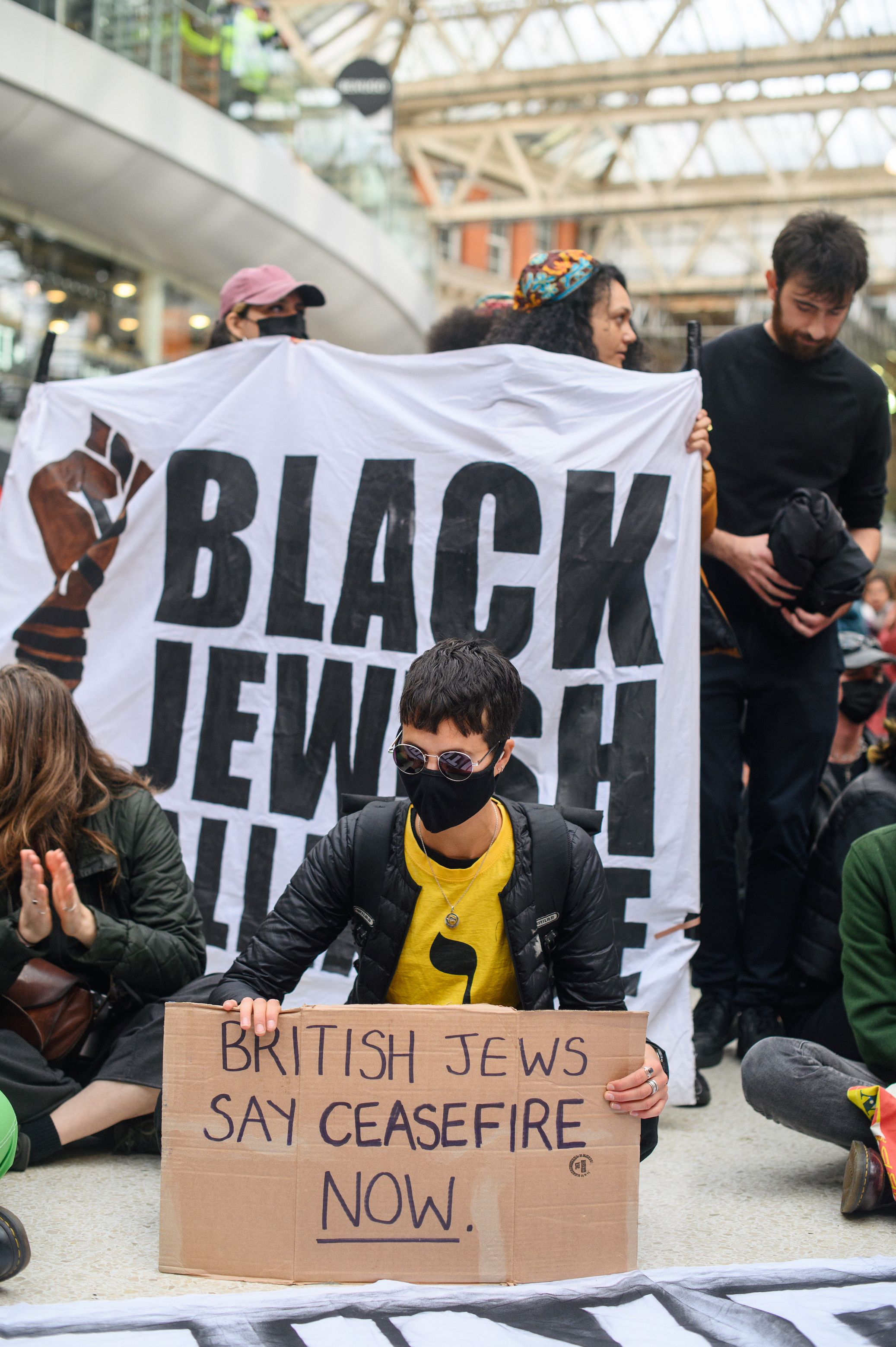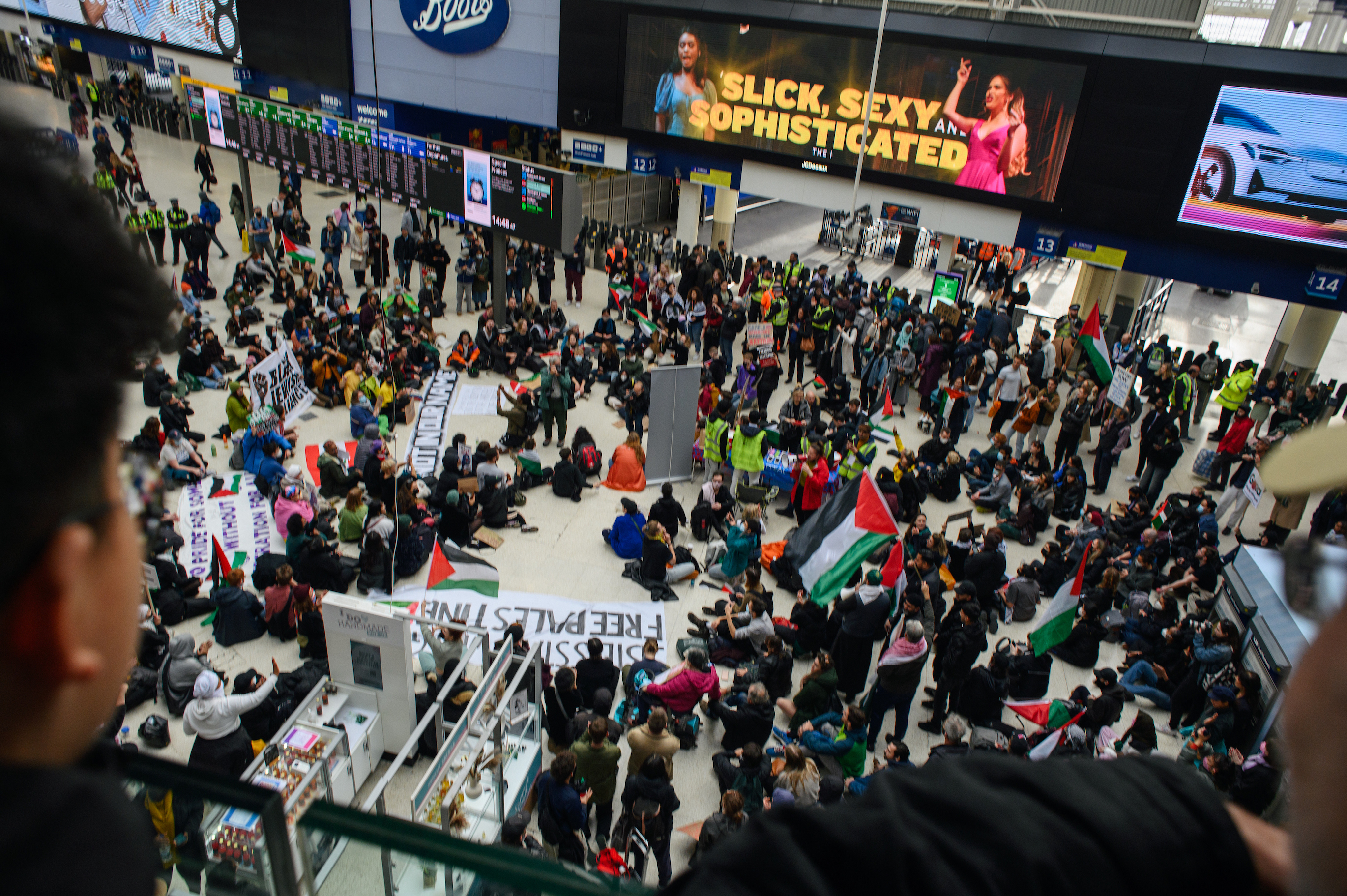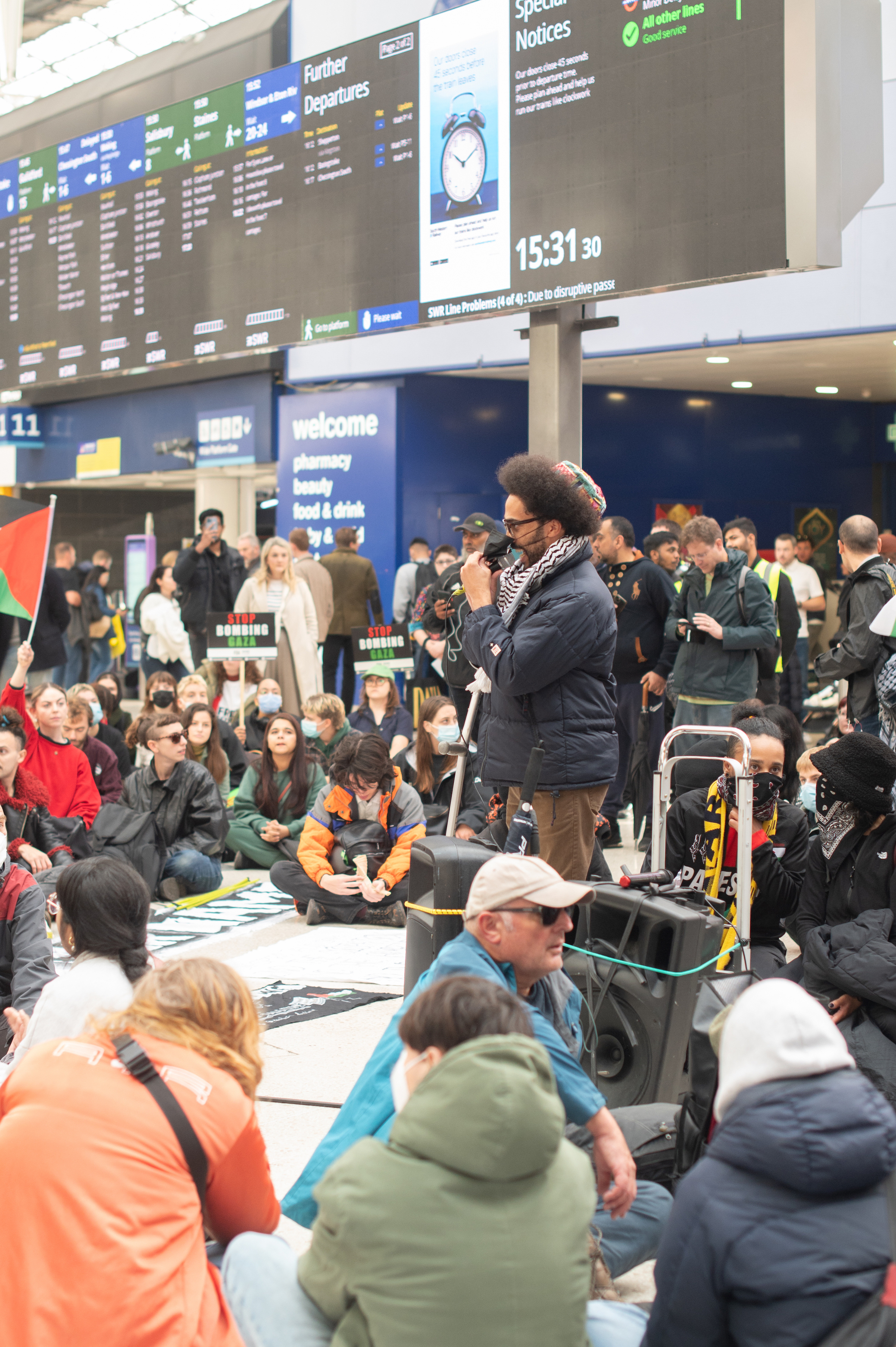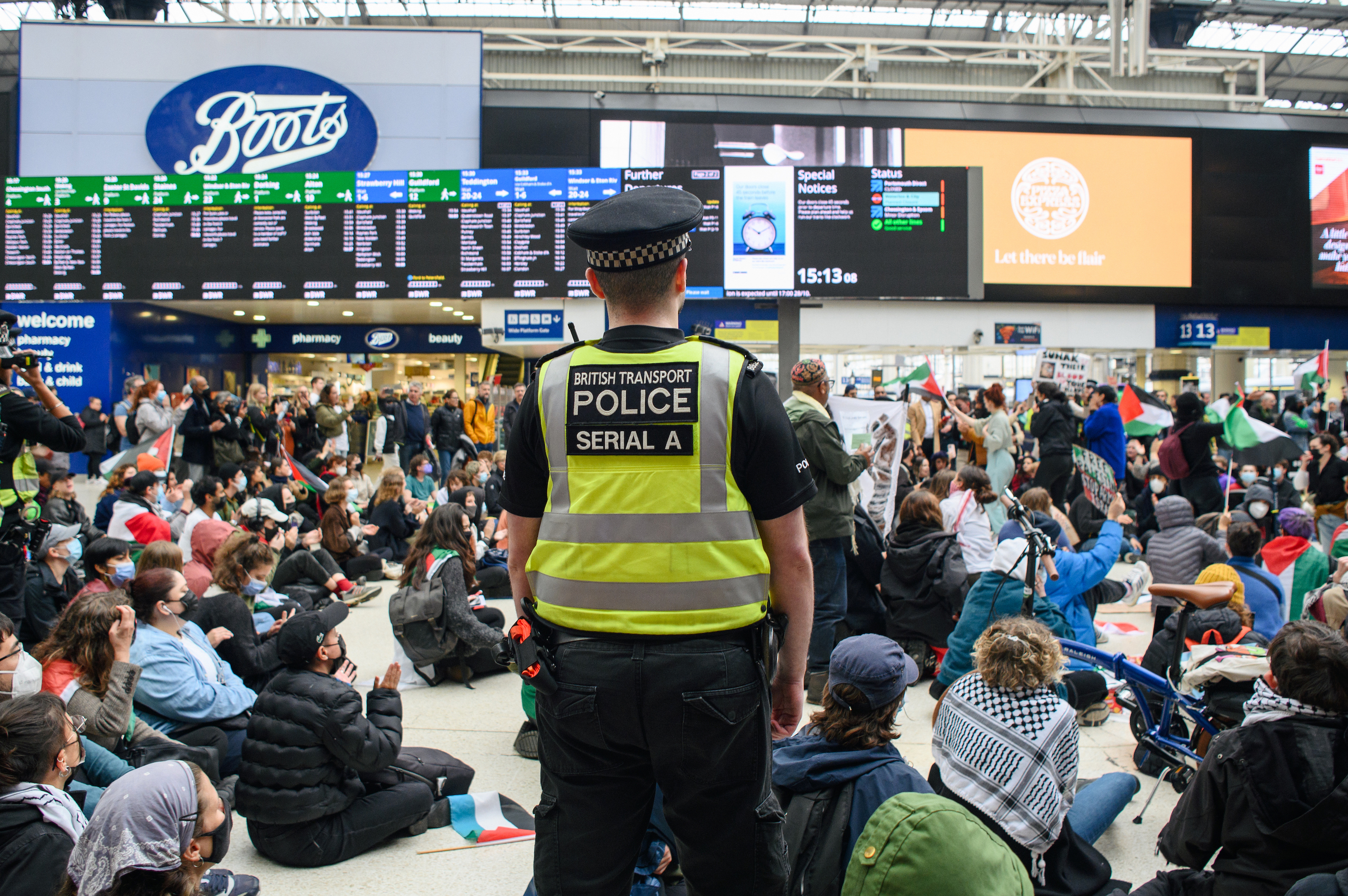 On Saturday, a similar action at London’s Waterloo station took place as the PSC march took place outside. The sit-in, called by activist group Sisters Uncut saw hundreds of activists, including those from groups like Na’amod and Black Jewish Alliance, take part. Those gathered listened to speeches, with organisers tweeting that they faced intimidation from the police. The sit-in ended with no arrests.