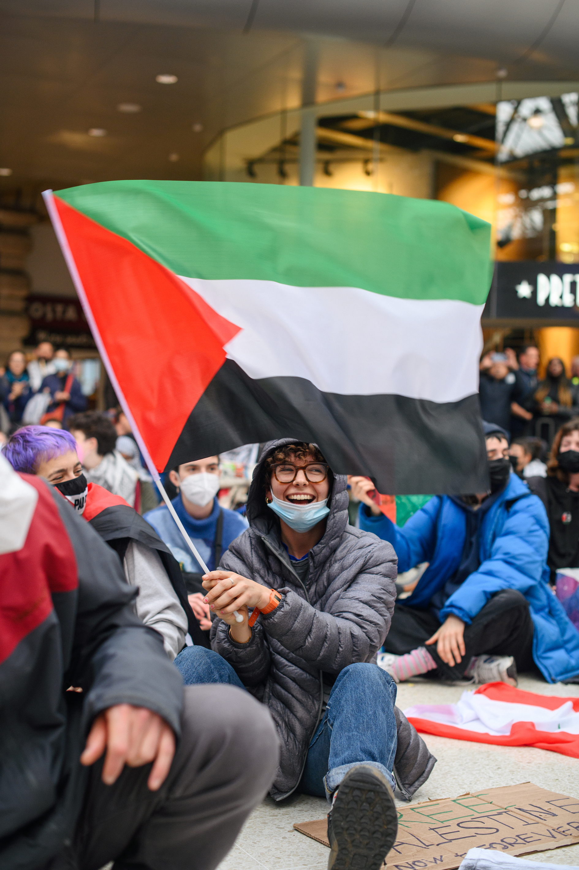 On Friday evening, some of you were even there in New York’s Grand Central Station along with hundreds of activists from Jewish Voice for Peace who staged a sit-in at rush hour. The activists were calling for an immediate ceasefire and managed to gain access to a ledge near the departures board. Over 200 activists were arrested during the action.