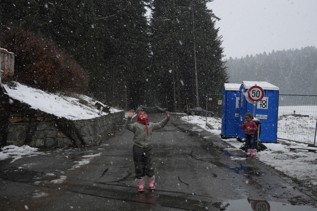 GERMANY. AUSTRIA. Wegscheid border post. November 2015. Syrian refugees at Austrian/German border, waiting to cross to Bavaria. The girl is still on the Austrian side.