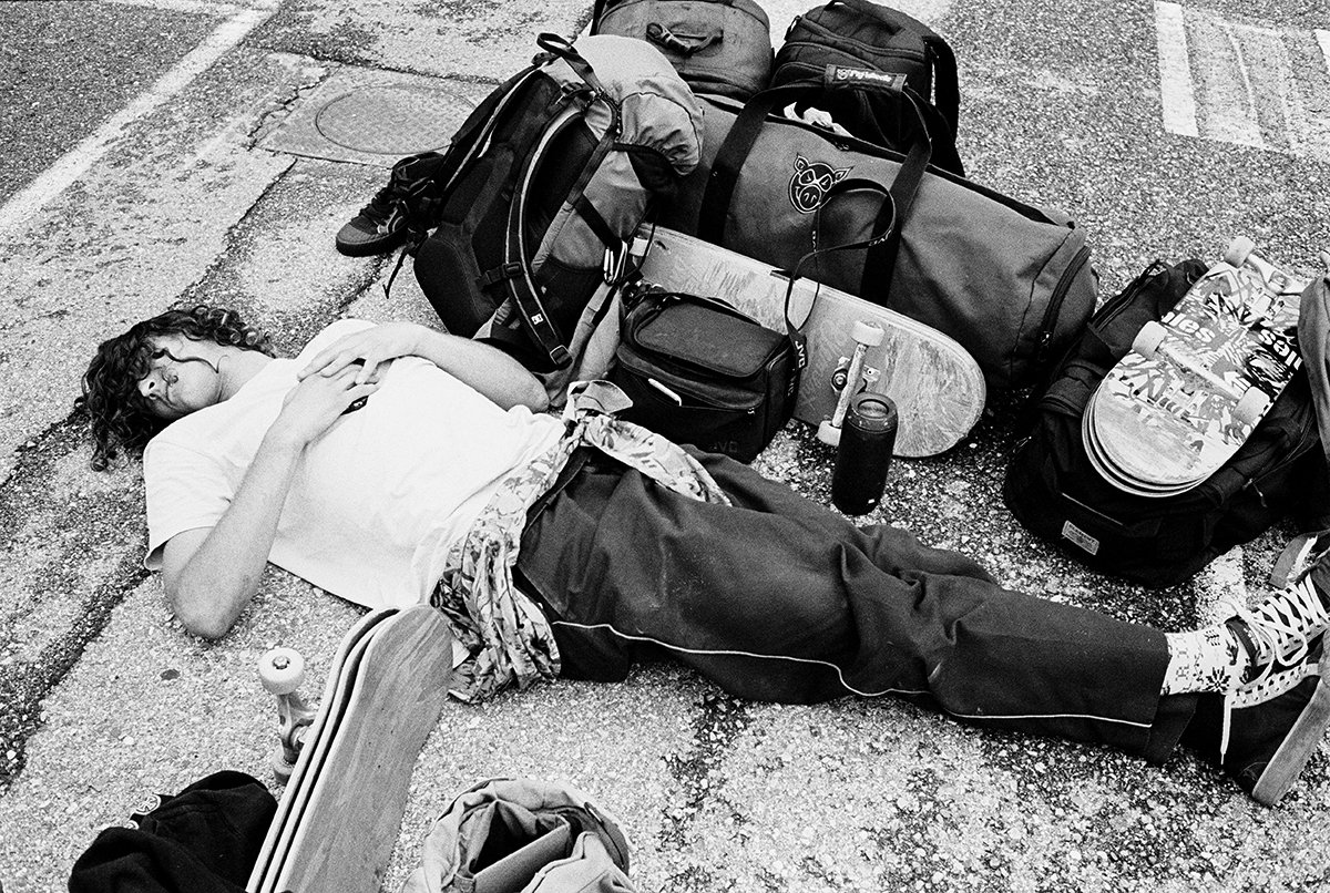 A couple of years ago, Mason realised that the amount of downtime involved in inter- national skate trips actually kinda sucked. As a way to kill time, he began toying with a Nikon camera that the photographer Brian Gaberman gifted him, capturing candid moments that illustrate what a travelling life actually looks like. The interminable pauses. The empty spaces. The cuts and grazes. The countless little ways that exhaustion manifests itself.