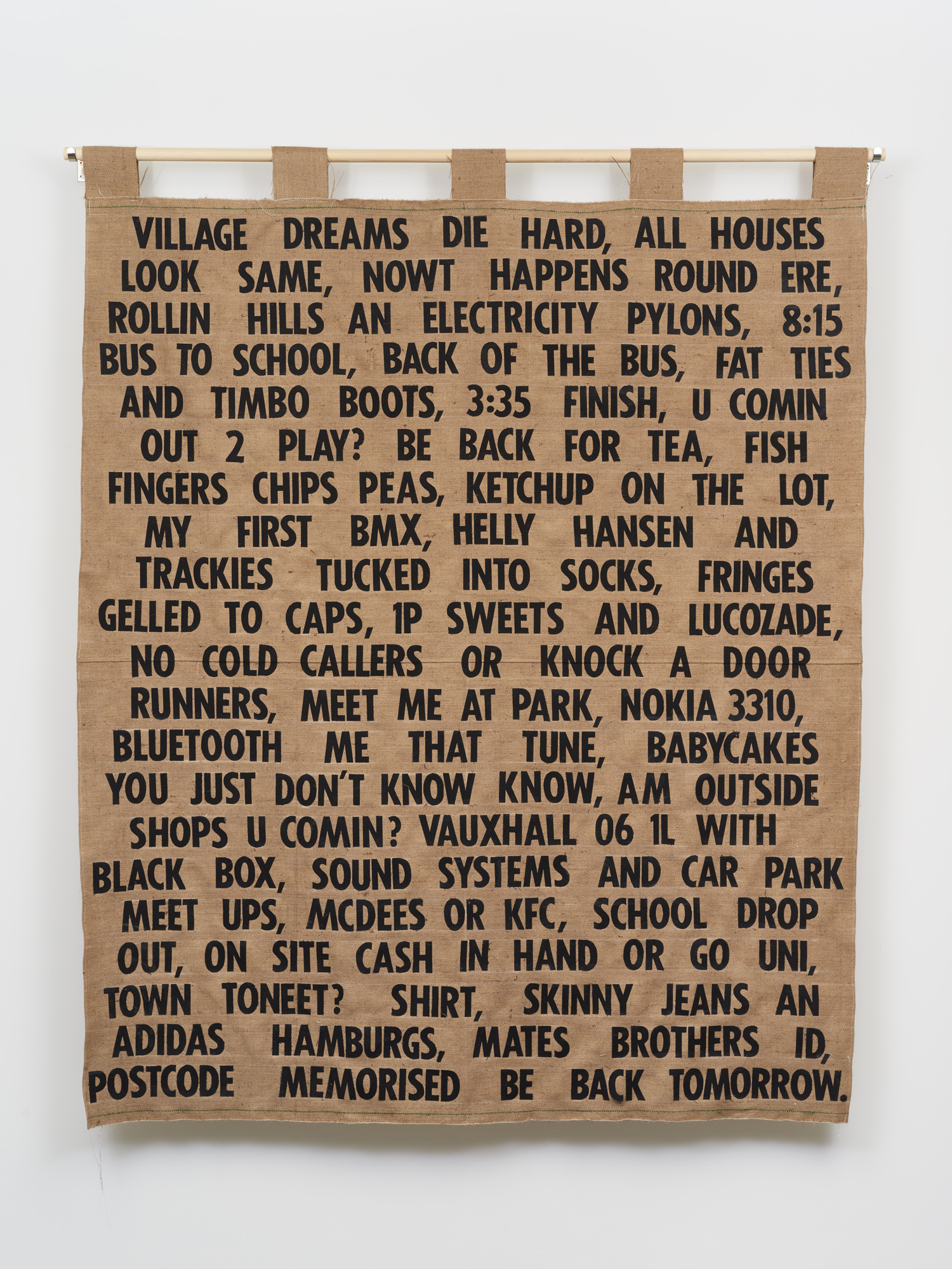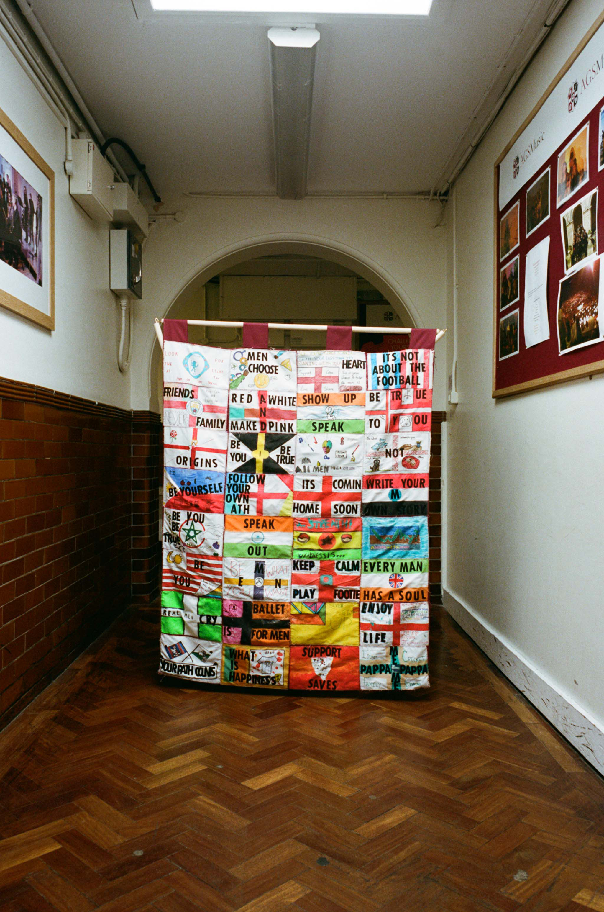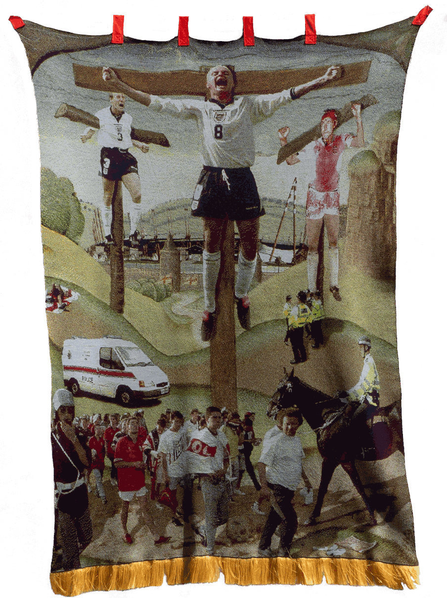 Originally from Sheffield, South Yorkshire, artist Corbin Shaw explores ideas of masculinity through the medium of textiles. Best known for his unique take on the St George’s cross, he pays homage to the people and places that have shaped his northern identity – the pub, football pitches and boxing gyms.