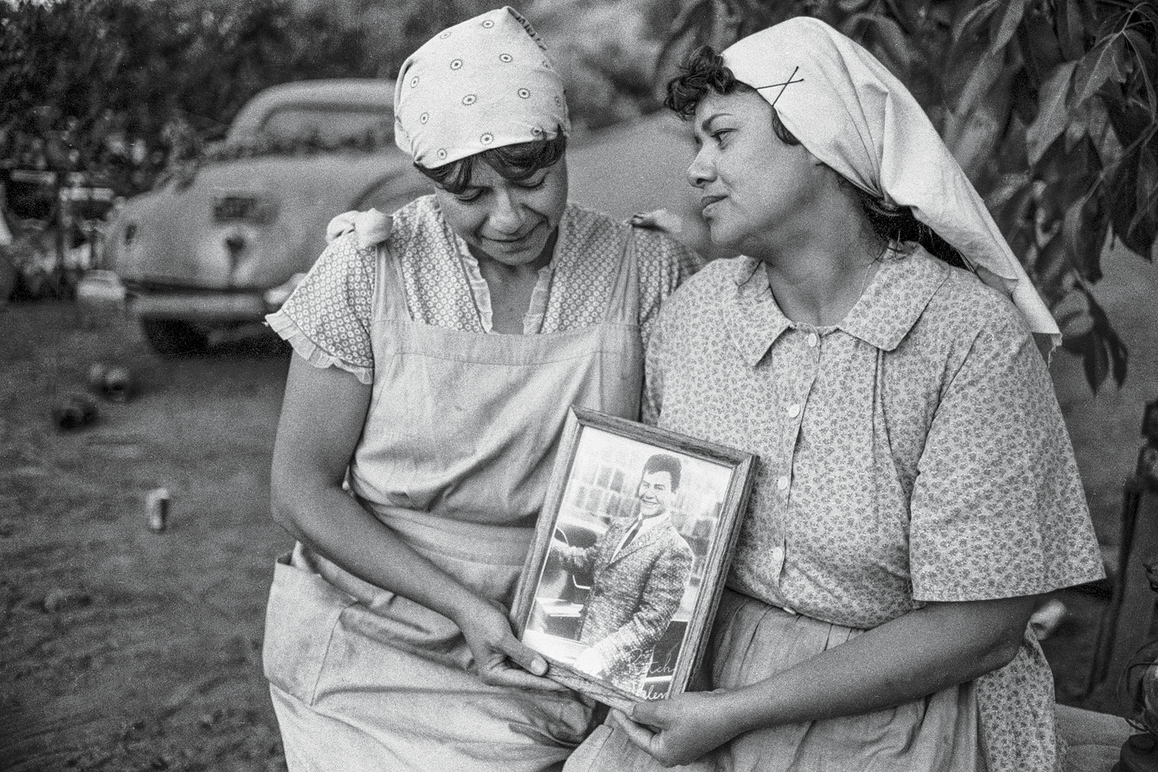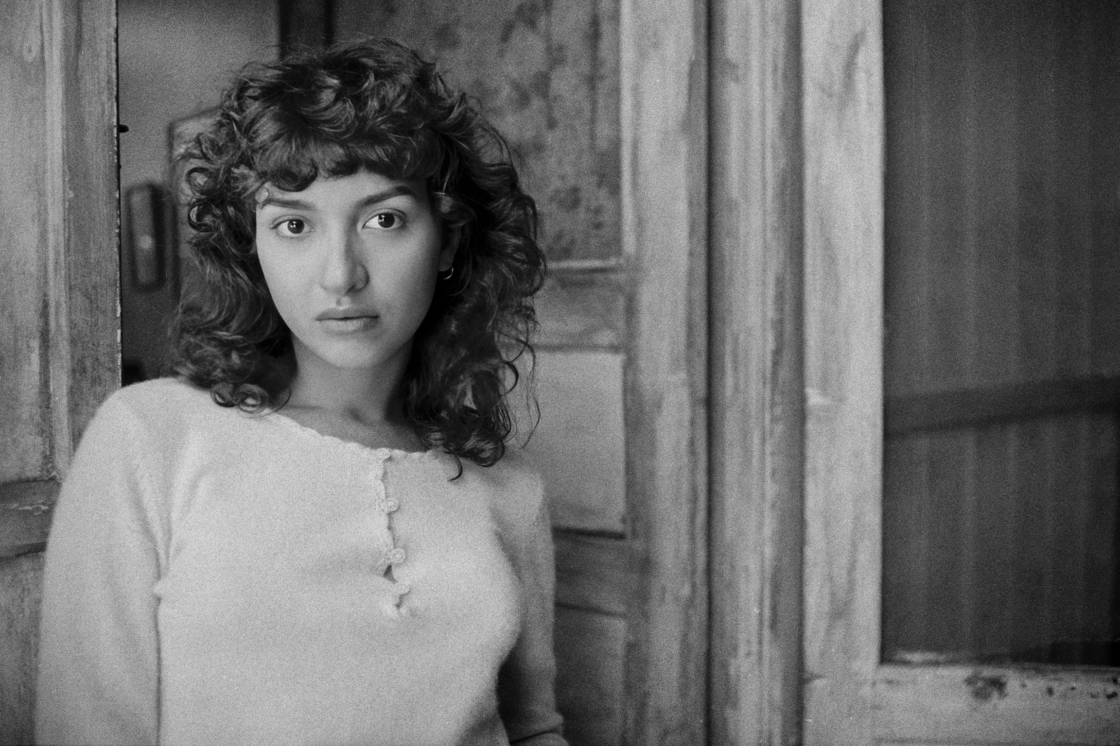 Pointing to a photograph of Valens’s sisters holding a photograph of their brother, Morton says, “They were extras in the film, floating around. They were sitting between scenes and I handed them the picture. It’s one of my favourite shots because you’re seeing both sides: the fantasy of a film set and the essence of real emotion, because they’re holding an image of their brother. It’s surreal.”