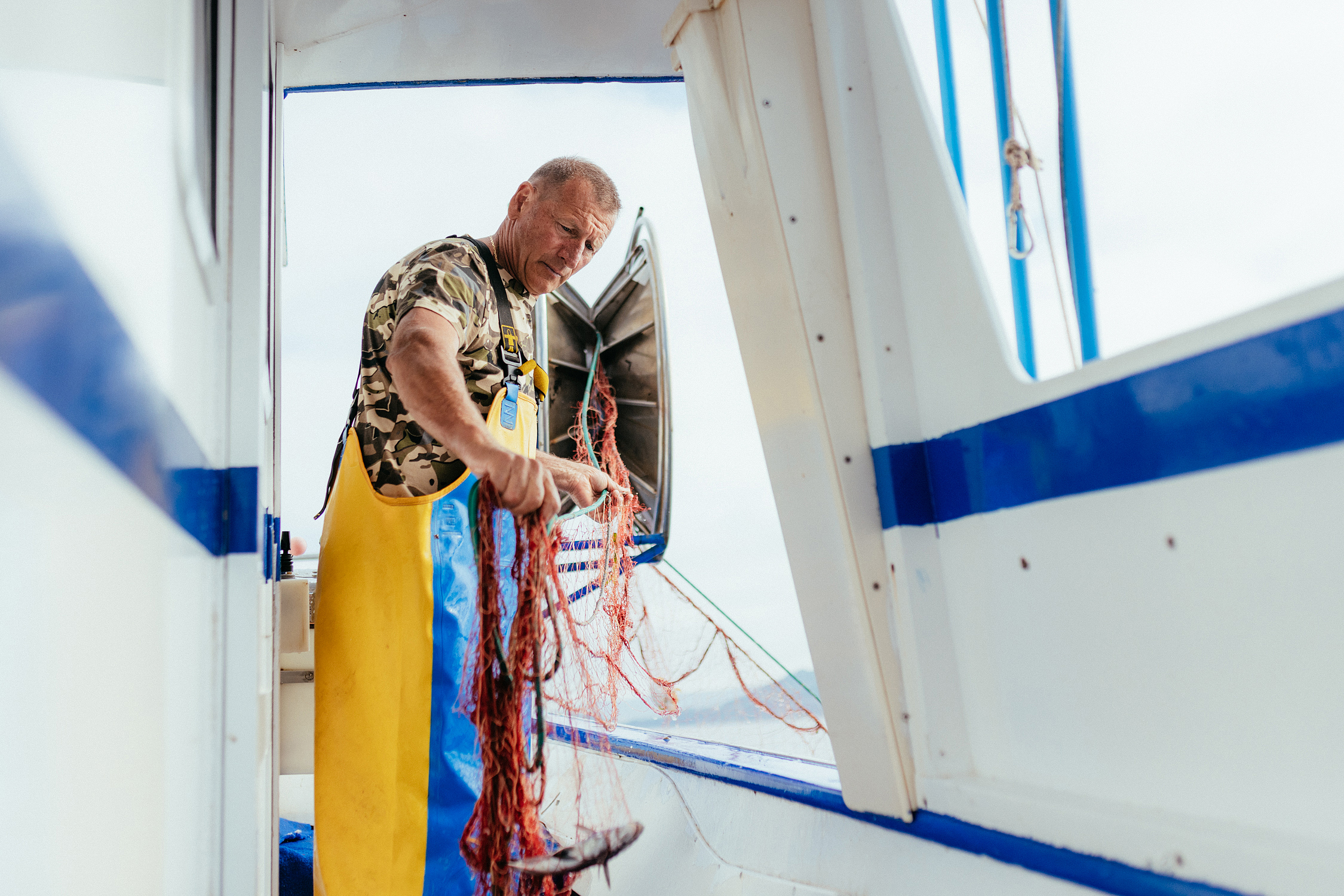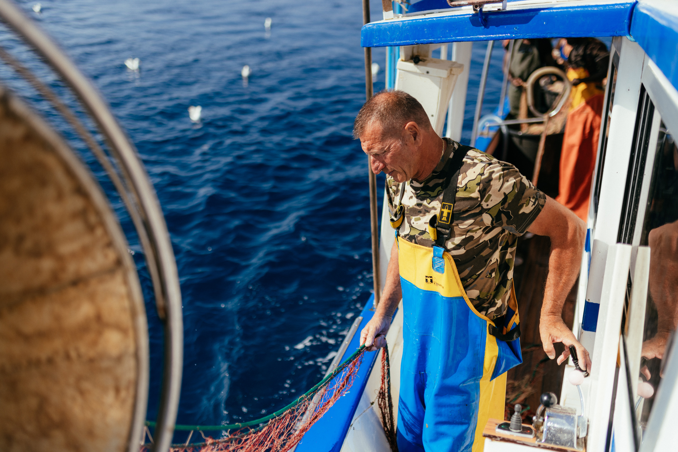 When his father fished off the coast at Talamone, a picturesque small port town perched on a cliff less than two hours’ drive from Rome, the sea used to be brimming with life and his nets would come back full. Sitting under the awning on the ‘Sirena,’ Fanciulli’s blue and white wooden fishing boat, while his hands work constantly at his nets, he tells me as a teenager, he would join his father here in this same bay, describing the sea back then as a “paradise.”
