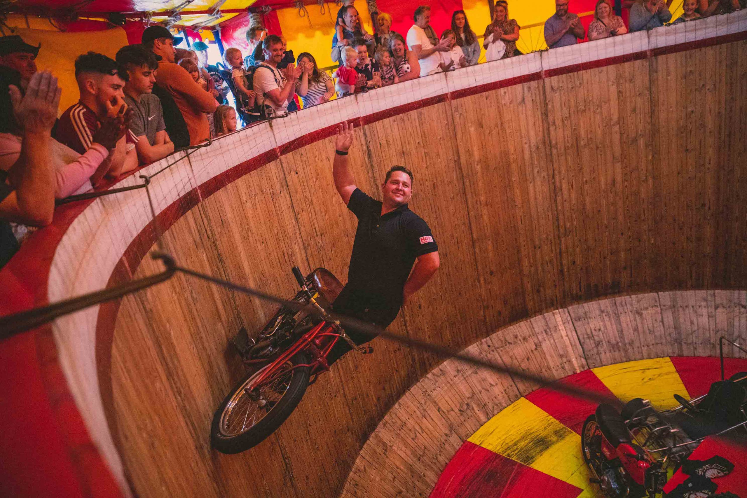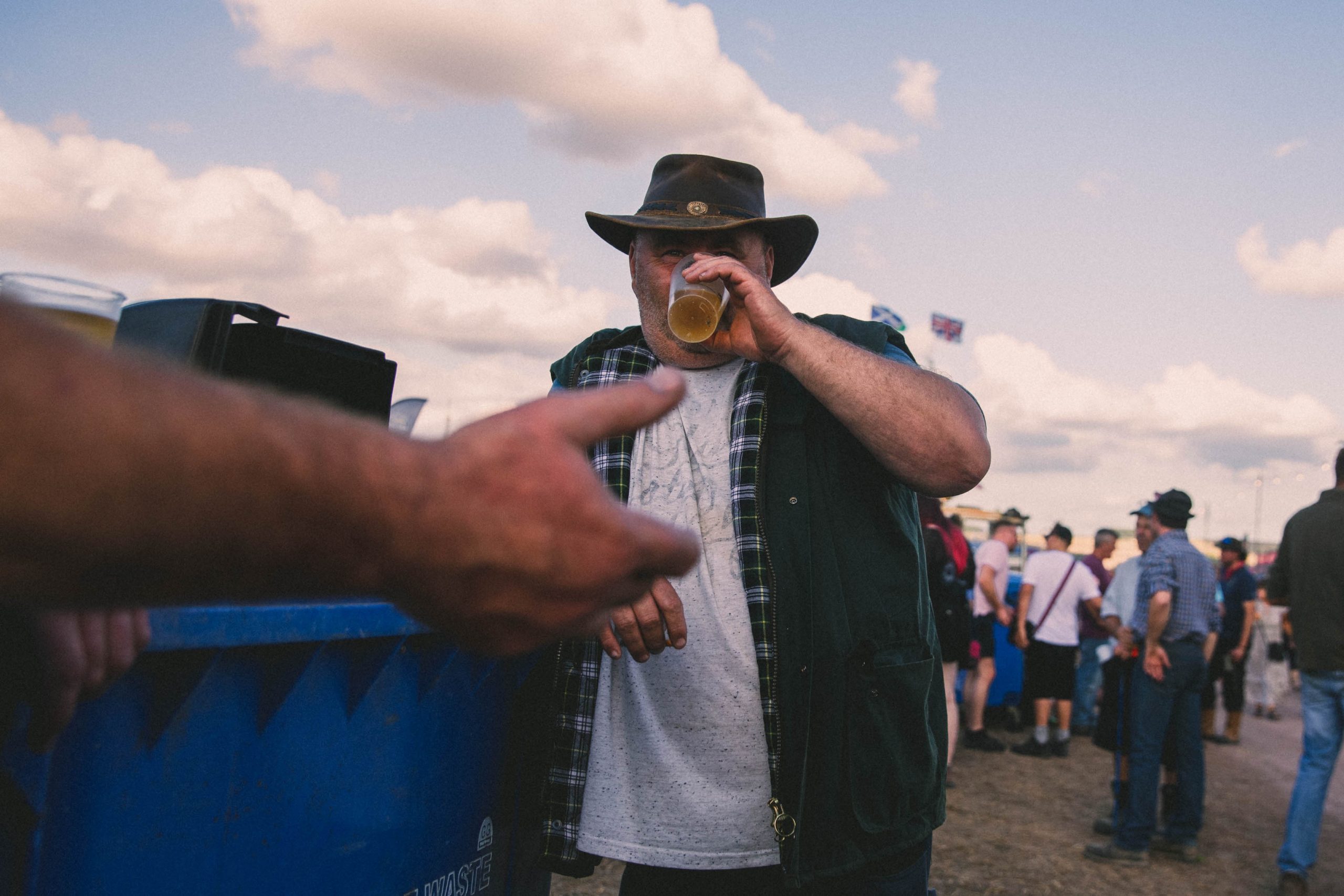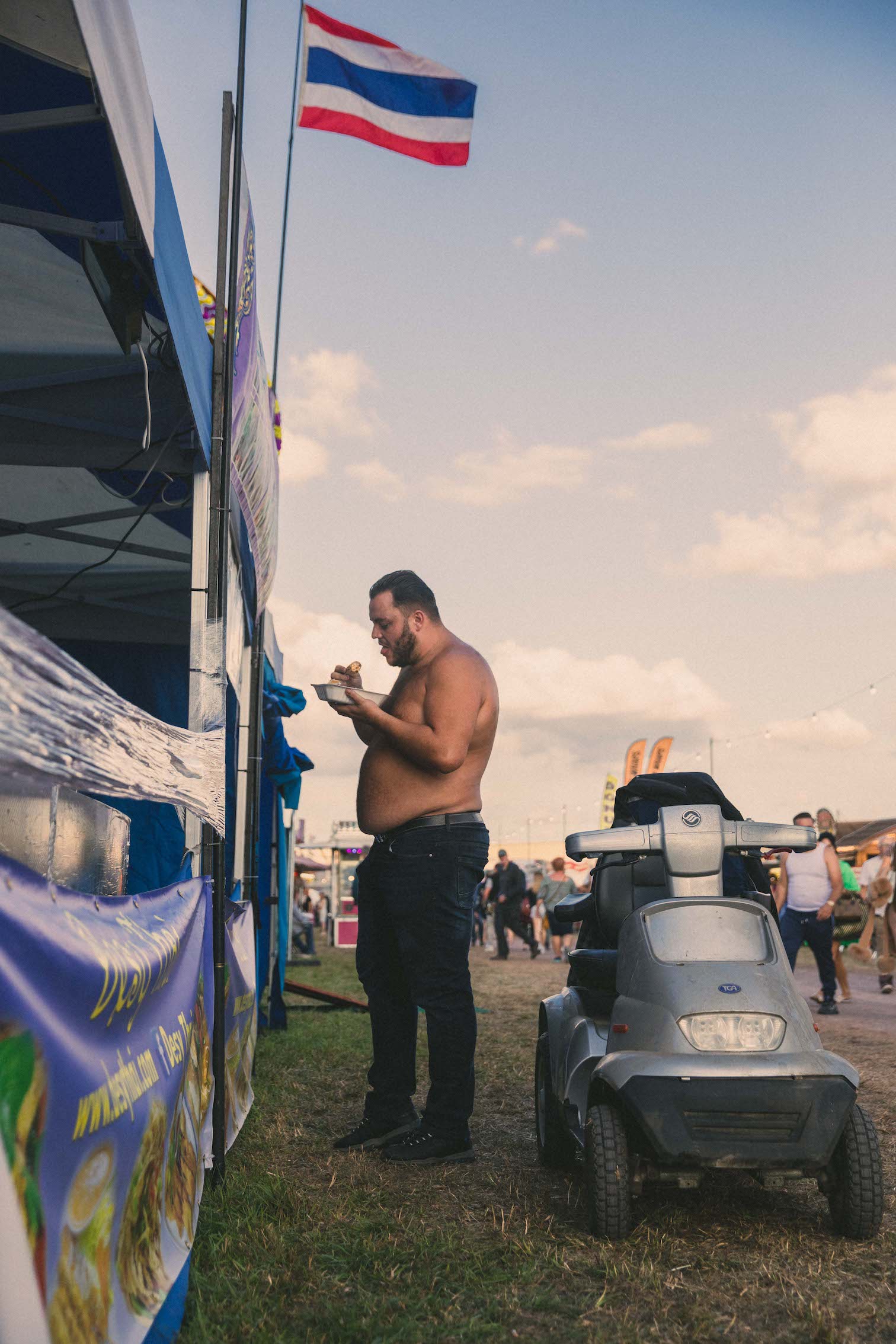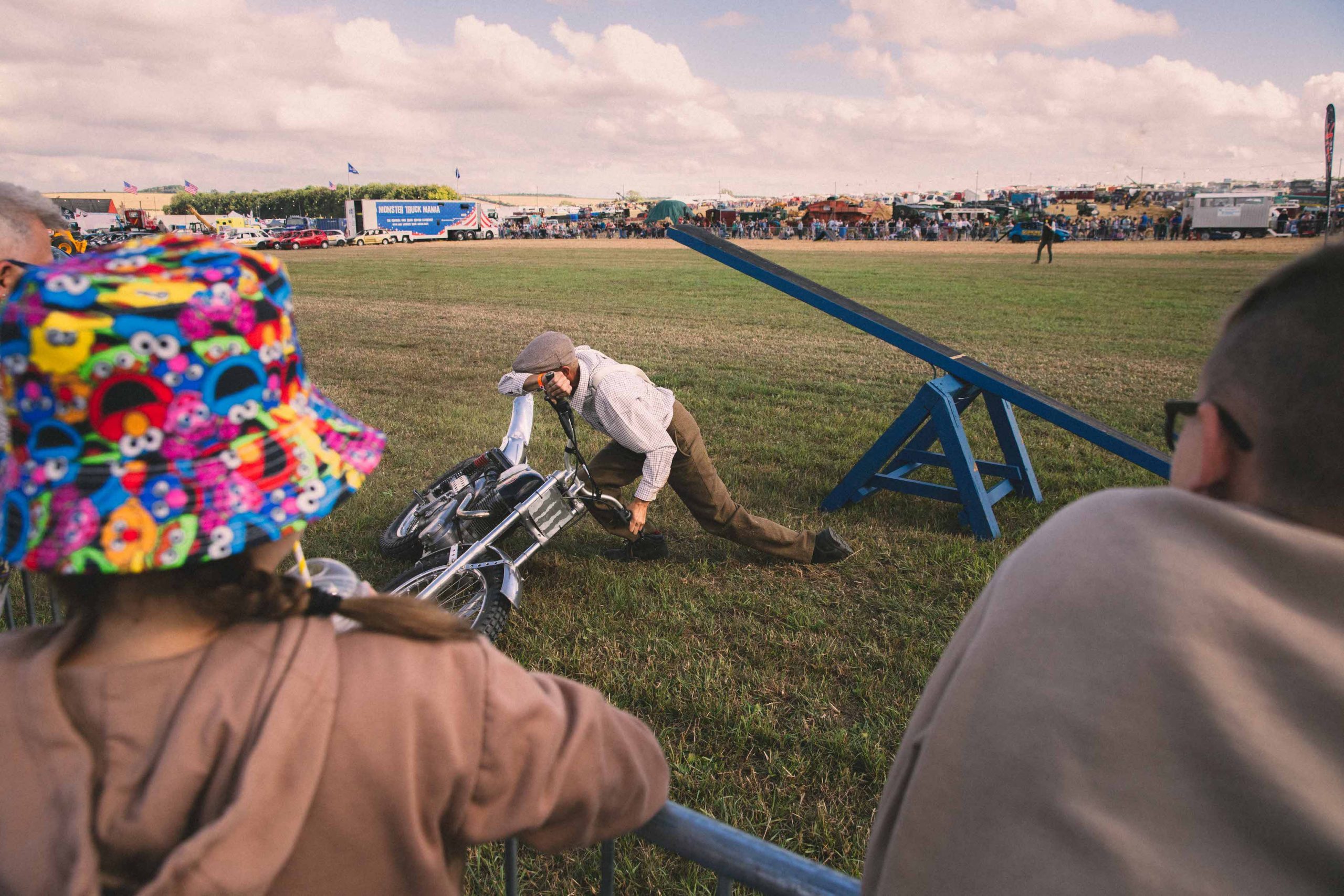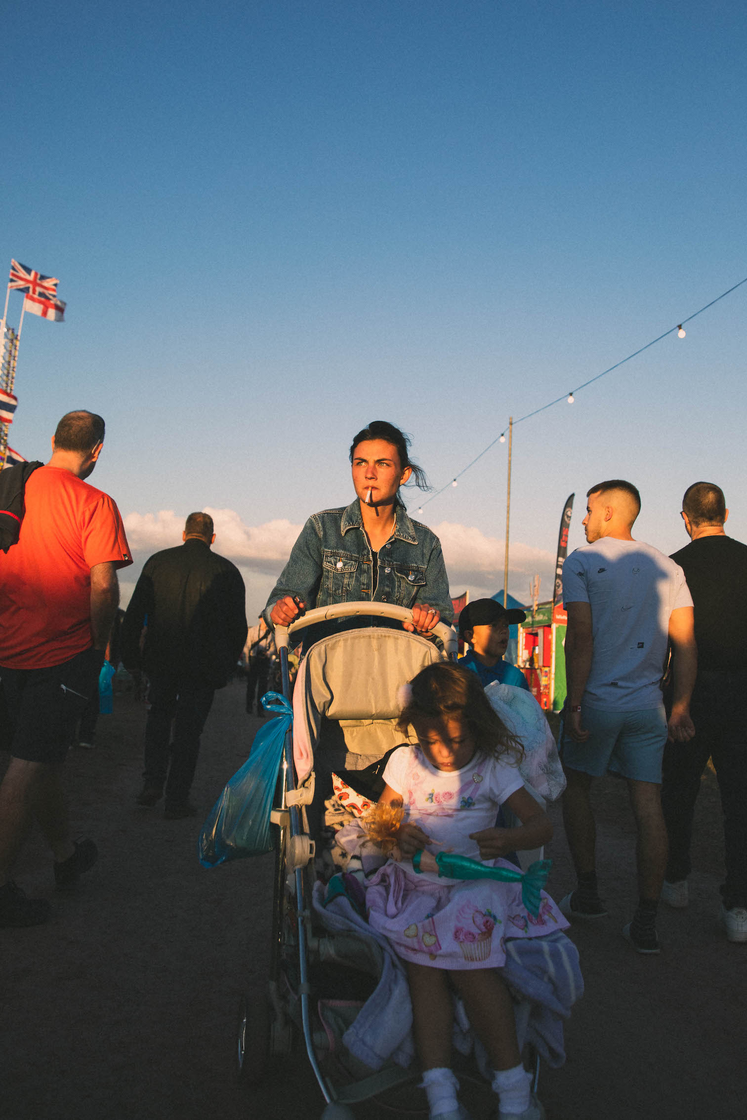 Photographer Theo McInnes attended the event last year to document the festivities and the colourful characters in attendance. “The vibe was strange: lots of big, drunk tattooed men looking at tanks and race cars,” recalls McInnes. “It was like going to a festival that was purely for farmers and war-enthusiasts.” McInnes’s vibrant photos show men staring at monster tanks, clutching pints and driving tractors, and children playing on the rides in the blazing hot sun. McInnes says there was also a “good element of family fun to it”, with “lots of kids and happy families” milling around, adding that “It felt quintessentially British”.